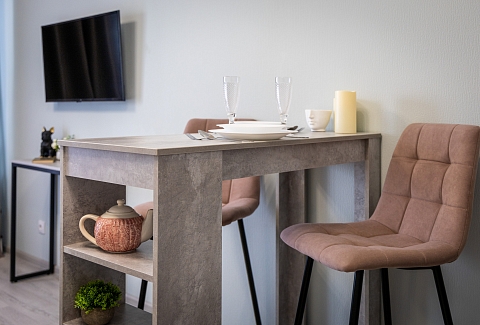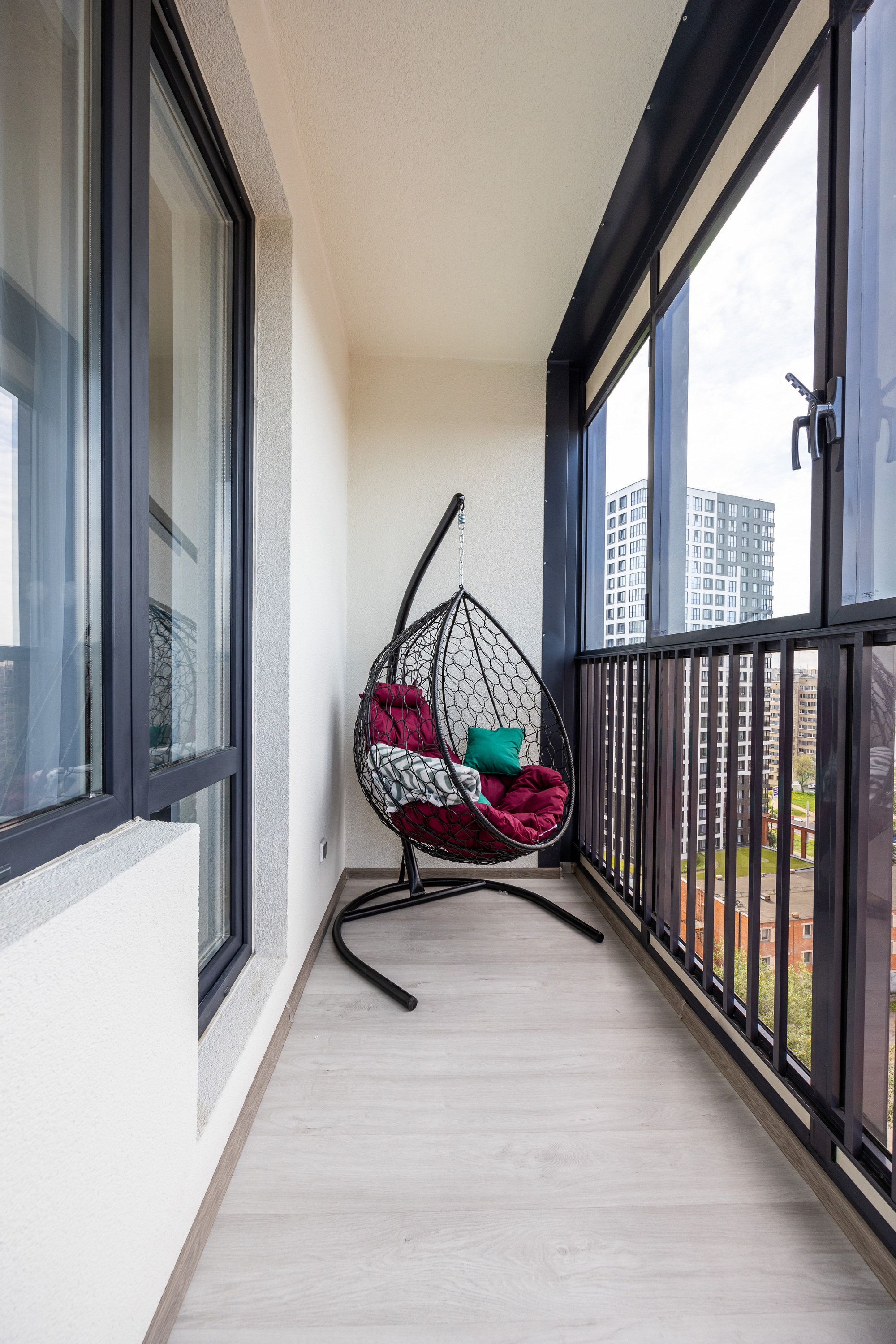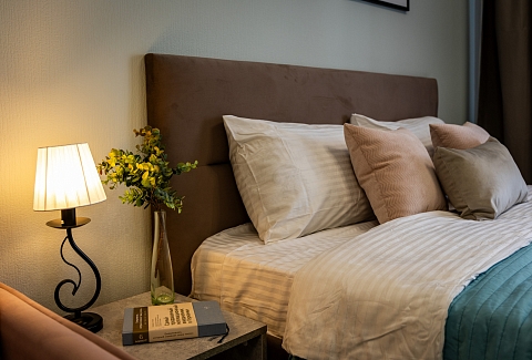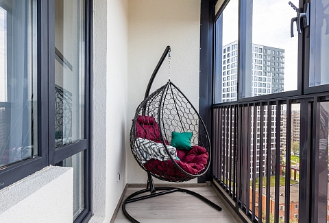 В номере: диван, зеркало, качели подвесные, кровать двуспальная, стол, стулья, шкаф, гладильная доска, кондиционер, микроволновая печь, набор посуды, плита электрическая, стиральная машина, телевизор ЖК, утюг, холодильник, чайный набор посуды, электрочайник