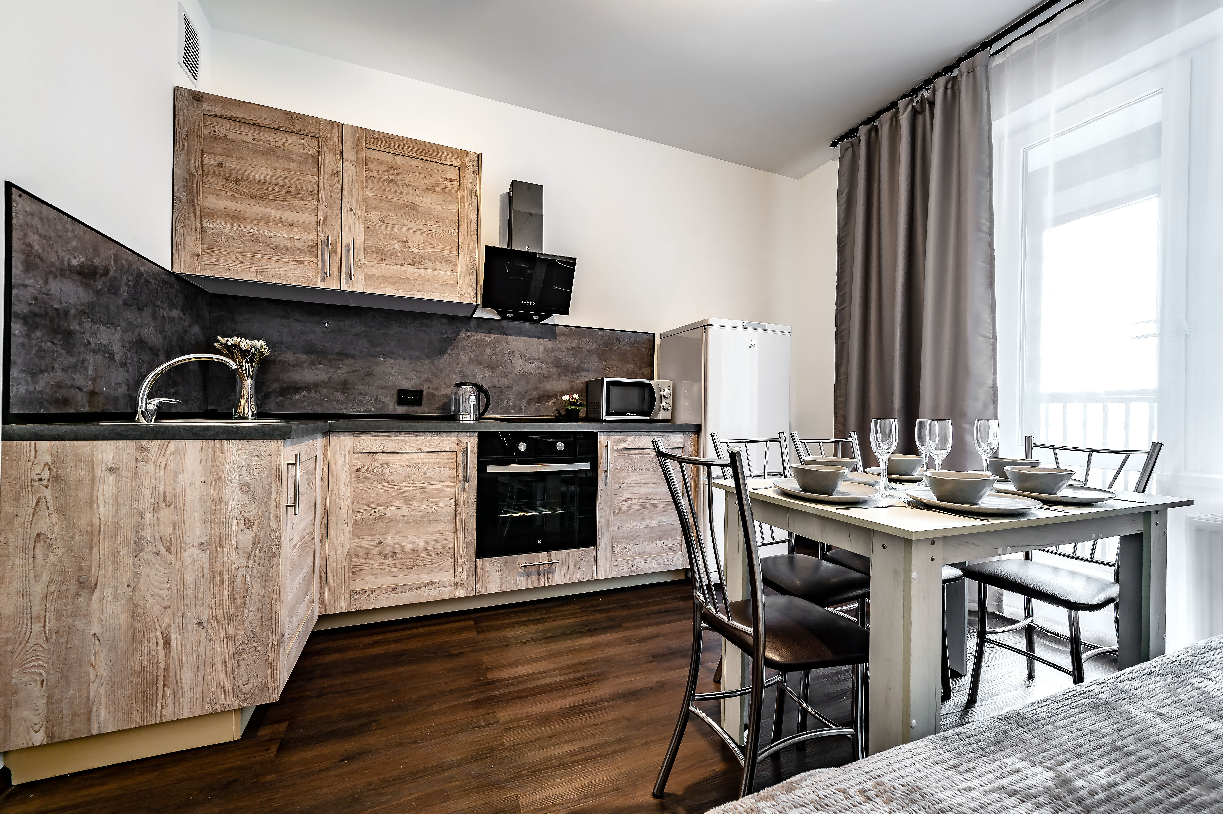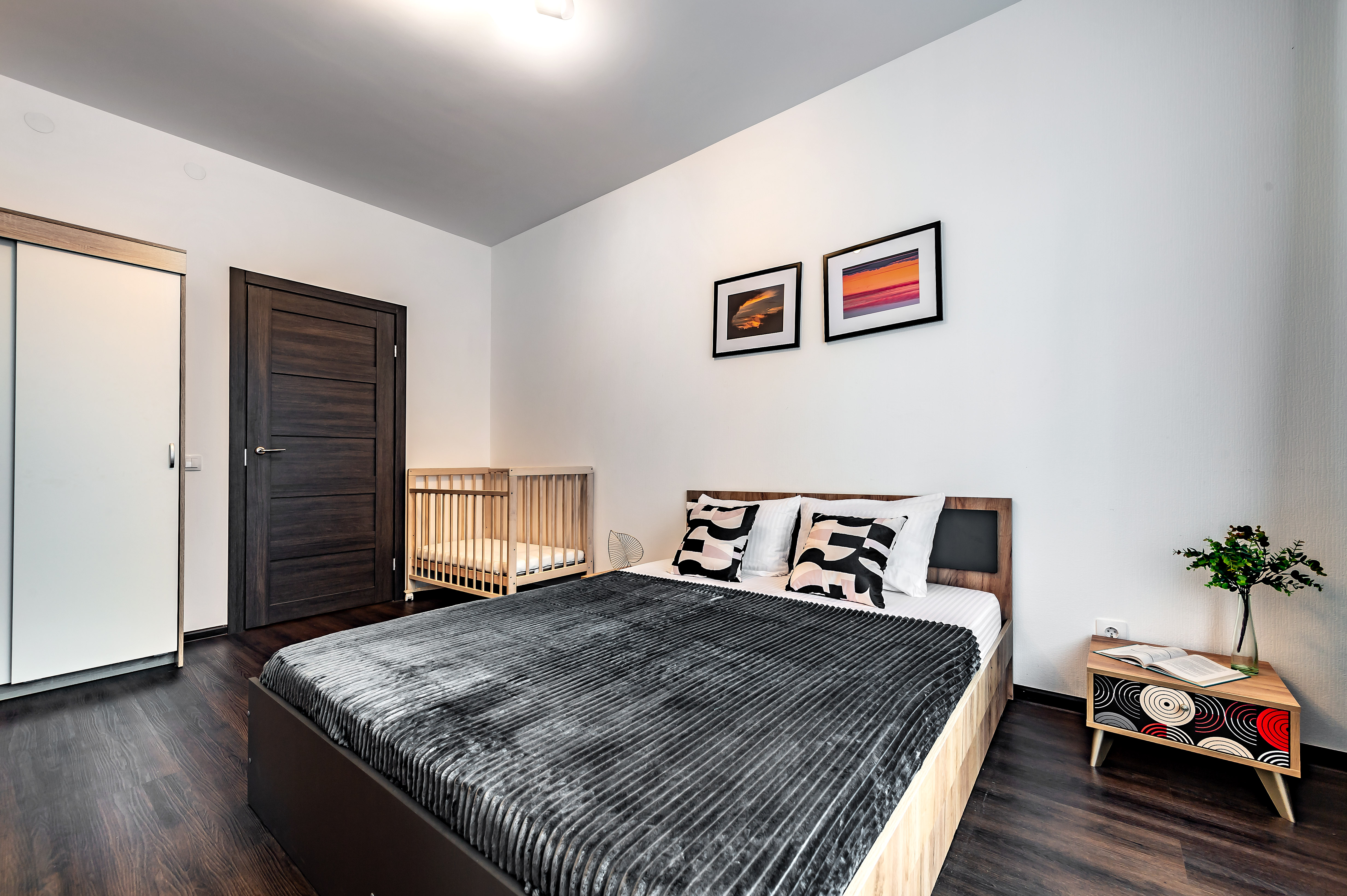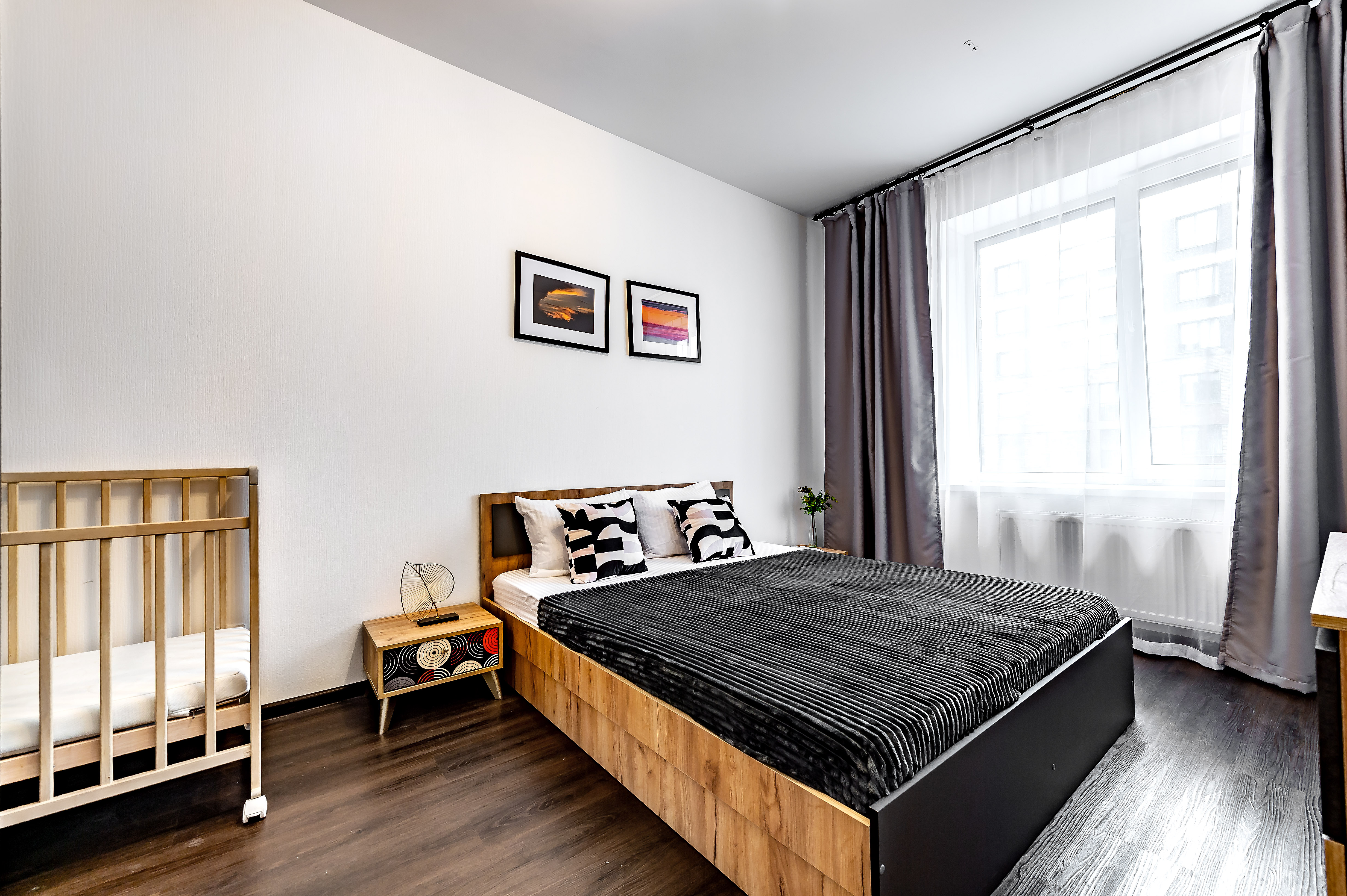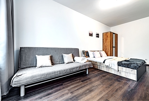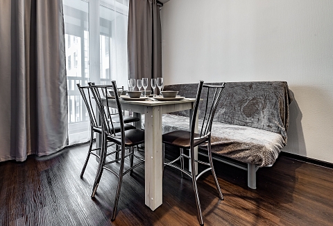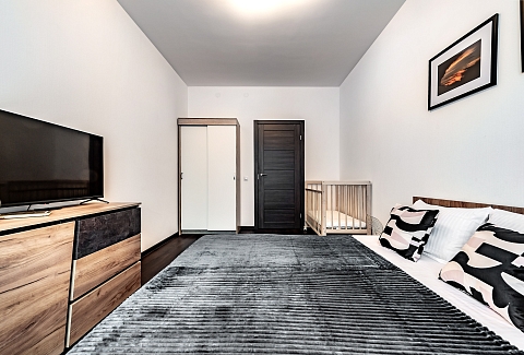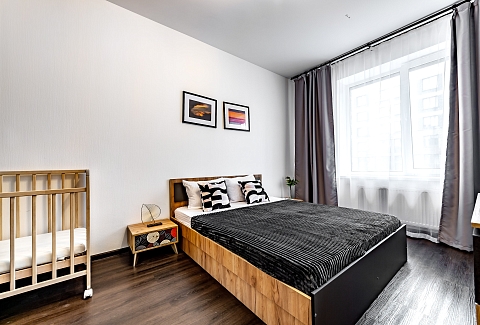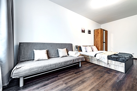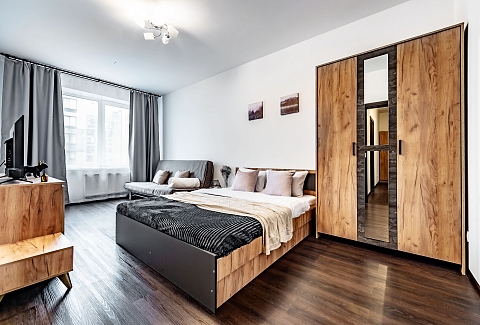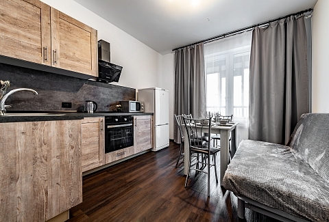Двухкомнатные апартаменты размещены в многоэтажном жилом доме, входящем в состав современного жилого комплекса «Панорама Парк» с лаконичной архитектурой. Номер оформлен в спокойной серо-коричневой гамме и рассчитан на 8 гостей. Здесь 2 спальни с двуспальными кроватями, одна дополнена раскладным диваном, вторая — детской кроваткой-манежем. Кухня разделена на рабочую и обеденную зоны, укомплектована диваном, есть выход на панорамный балкон. Санузел раздельный, в ванной установлена стиральная машина. Можно подключиться к Wi-Fi.Территория ЖК закрытая и благоустроенная: оборудованы зеленые зоны, спортивная и детская площадки, места для отдыха. Во двор нельзя заехать на машине, но припарковаться можно на открытой или подземной парковках снаружи здания.