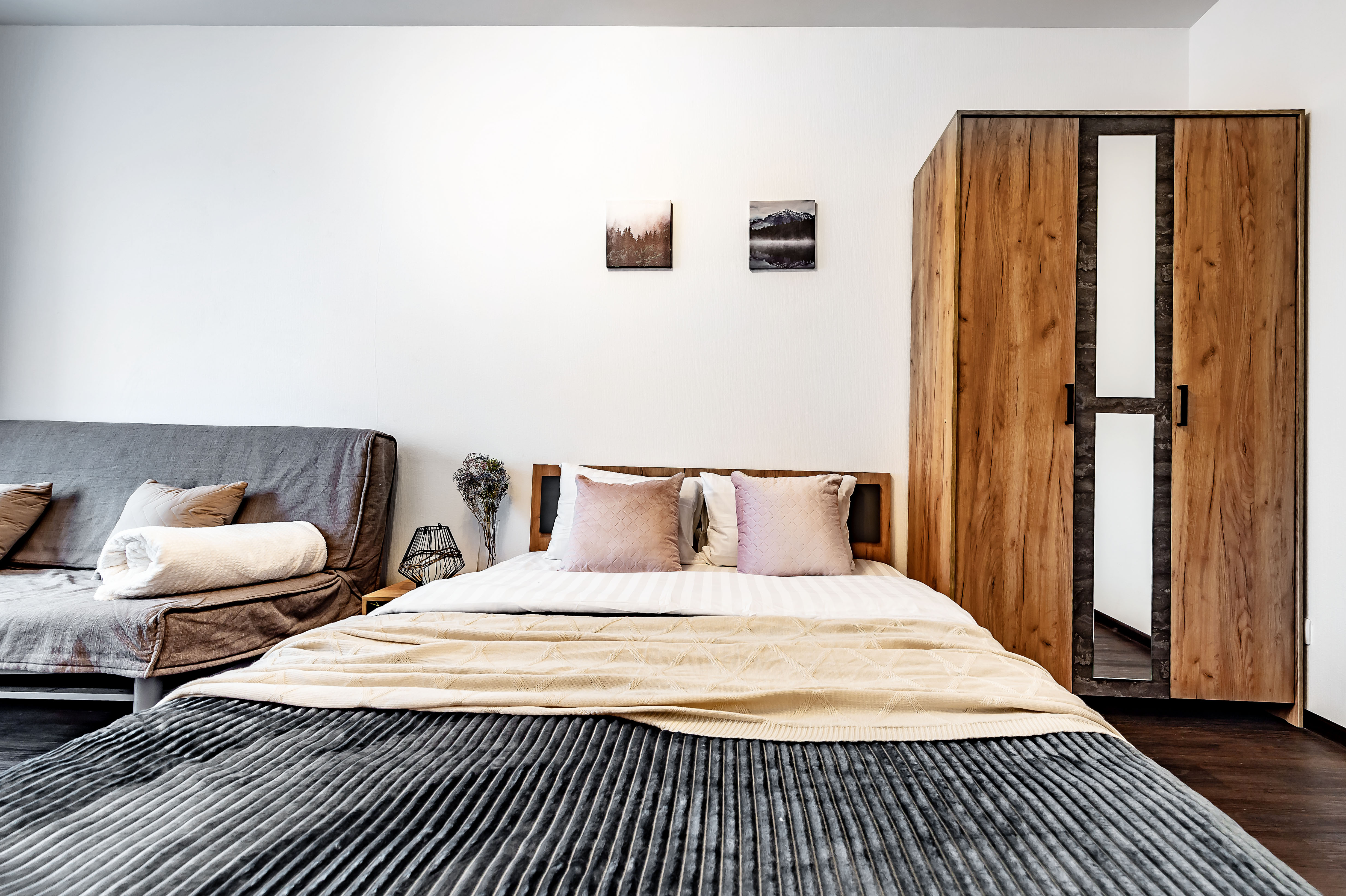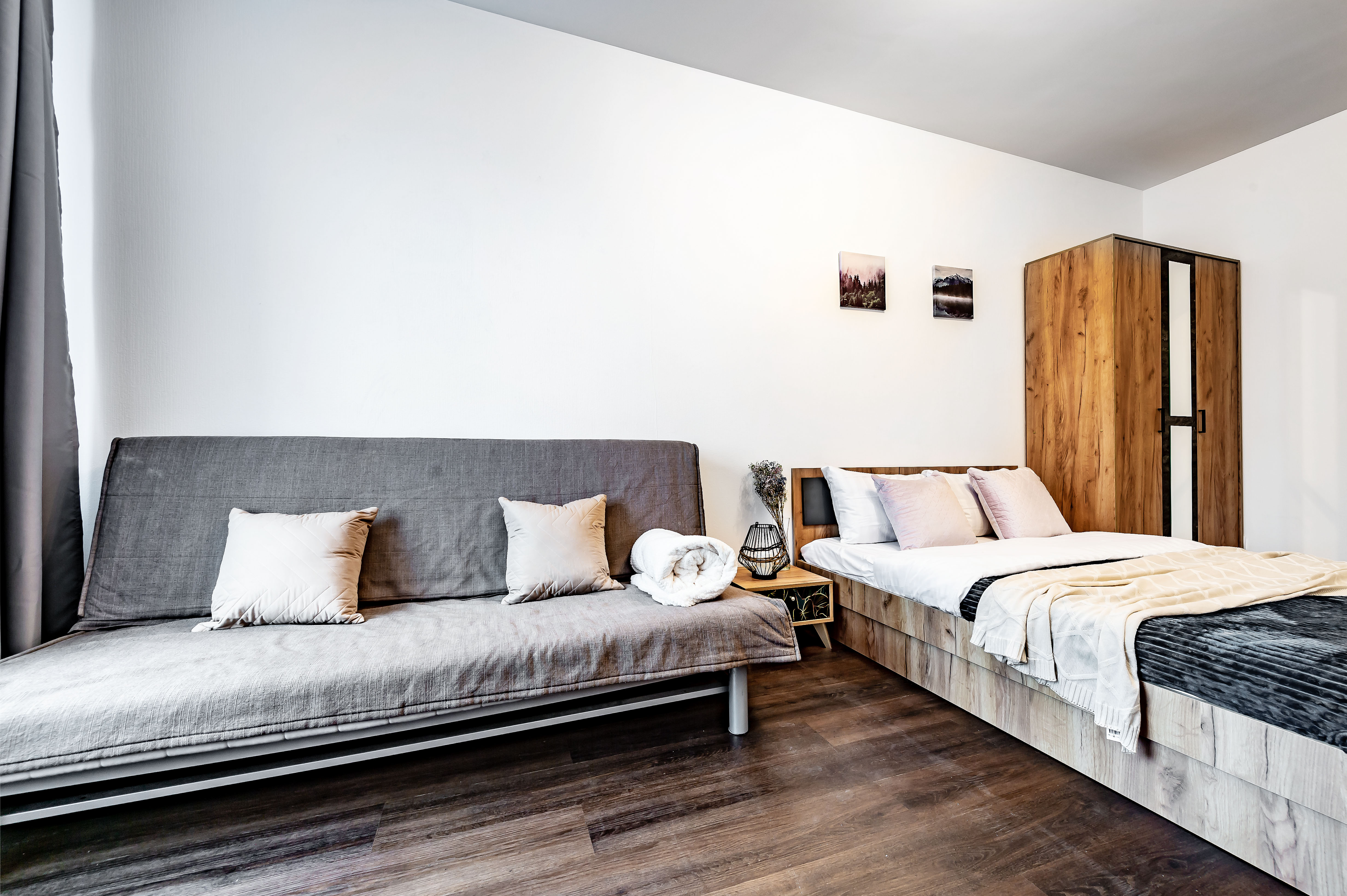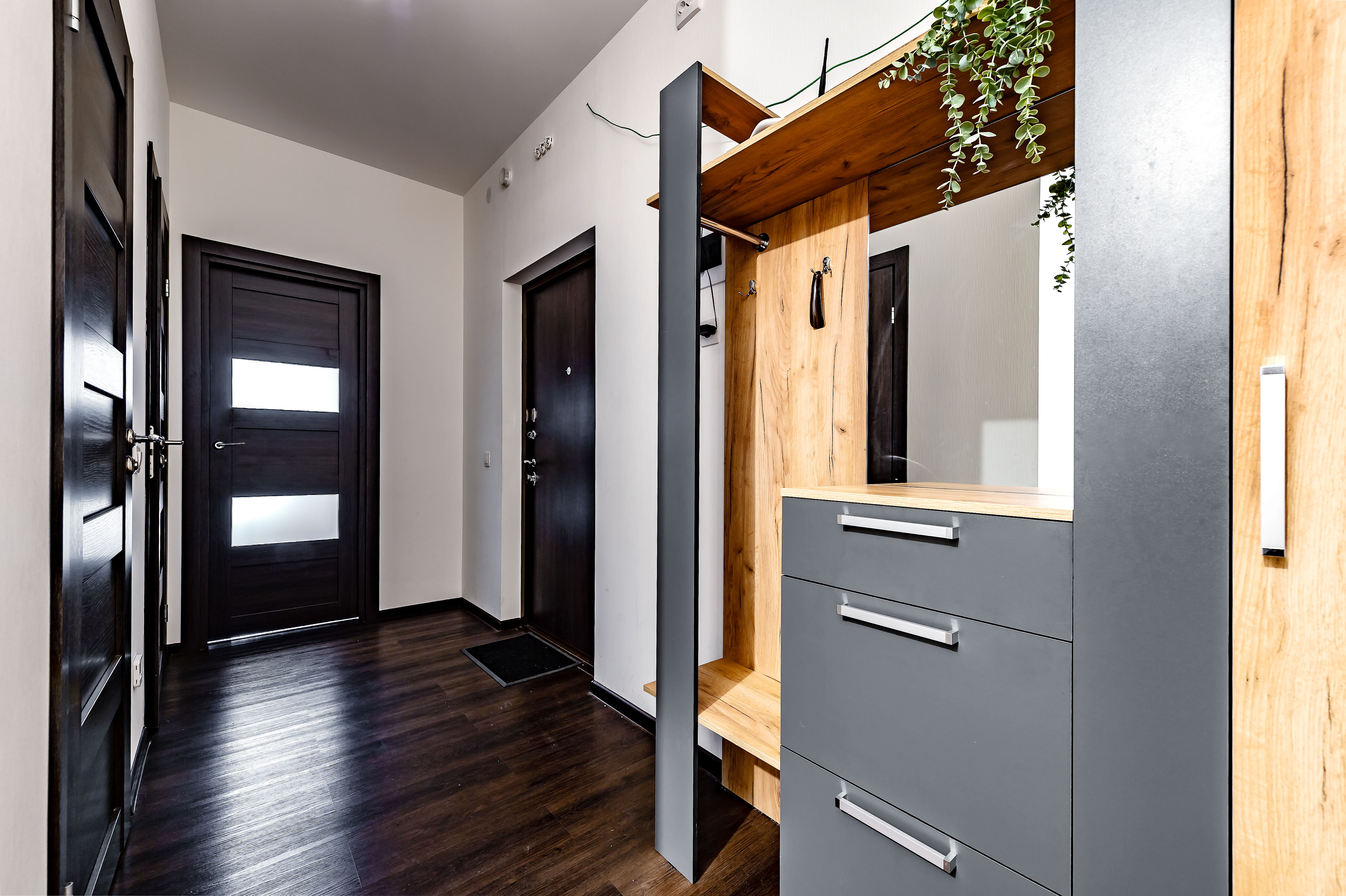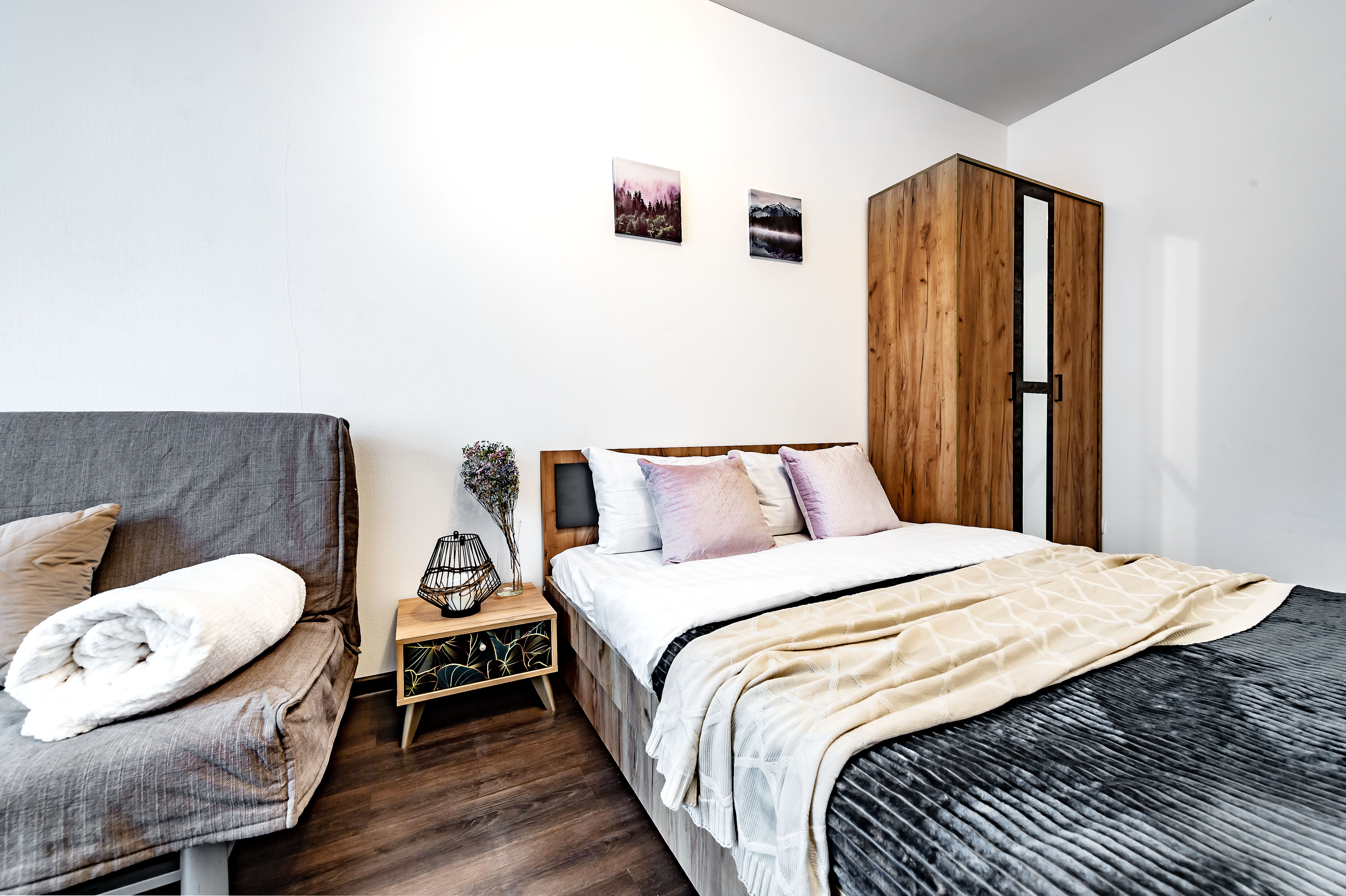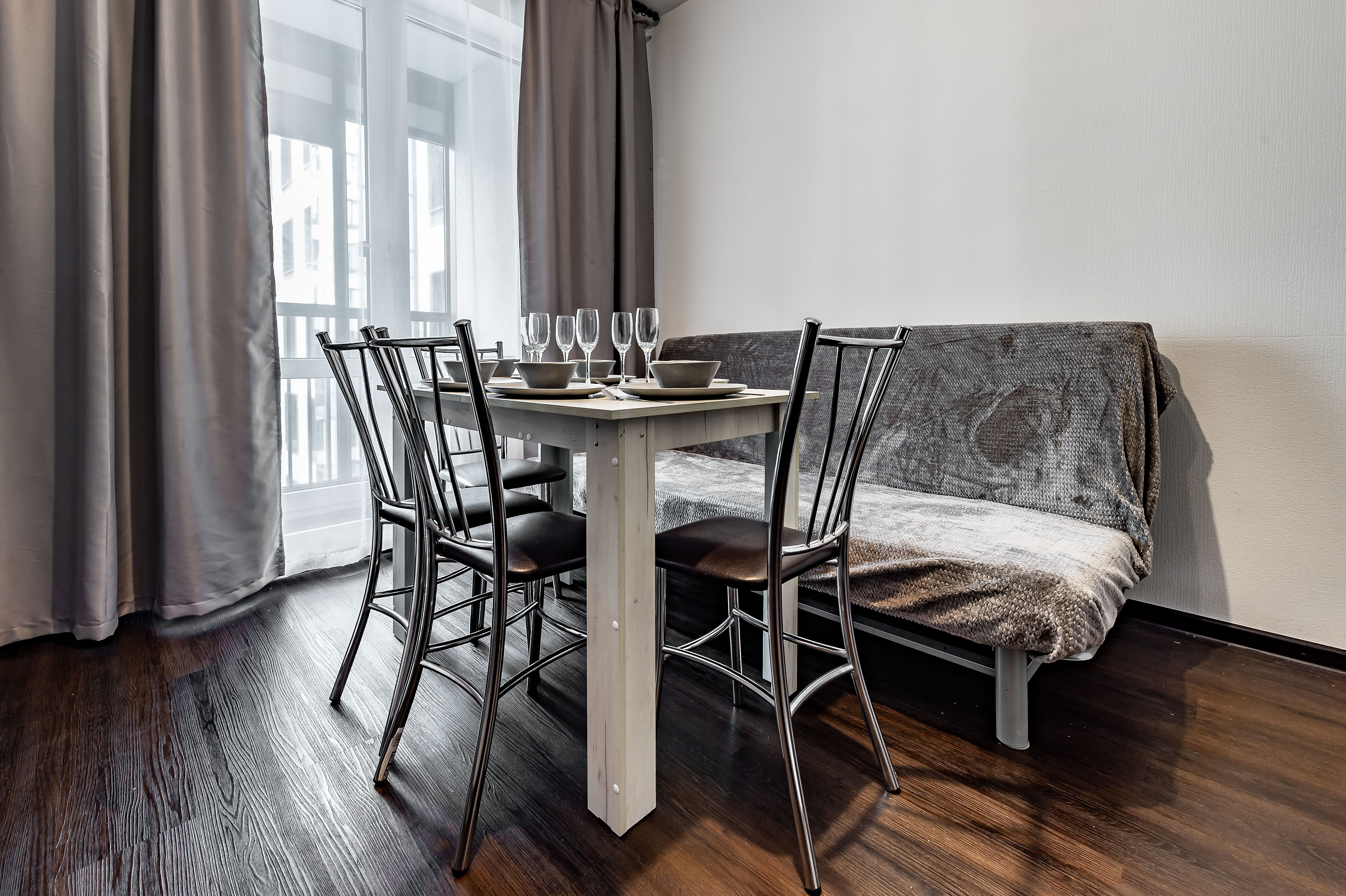 Двухкомнатные апартаменты размещены в многоэтажном жилом доме, входящем в состав современного жилого комплекса «Панорама Парк» с лаконичной архитектурой. Номер оформлен в спокойной серо-коричневой гамме и рассчитан на 8 гостей. Здесь 2 спальни с двуспальными кроватями, одна дополнена раскладным диваном, вторая — детской кроваткой-манежем. Кухня разделена на рабочую и обеденную зоны, укомплектована диваном, есть выход на панорамный балкон. Санузел раздельный, в ванной установлена стиральная машина. Можно подключиться к Wi-Fi.Территория ЖК закрытая и благоустроенная: оборудованы зеленые зоны, спортивная и детская площадки, места для отдыха. Во двор нельзя заехать на машине, но припарковаться можно на открытой или подземной парковках снаружи здания.