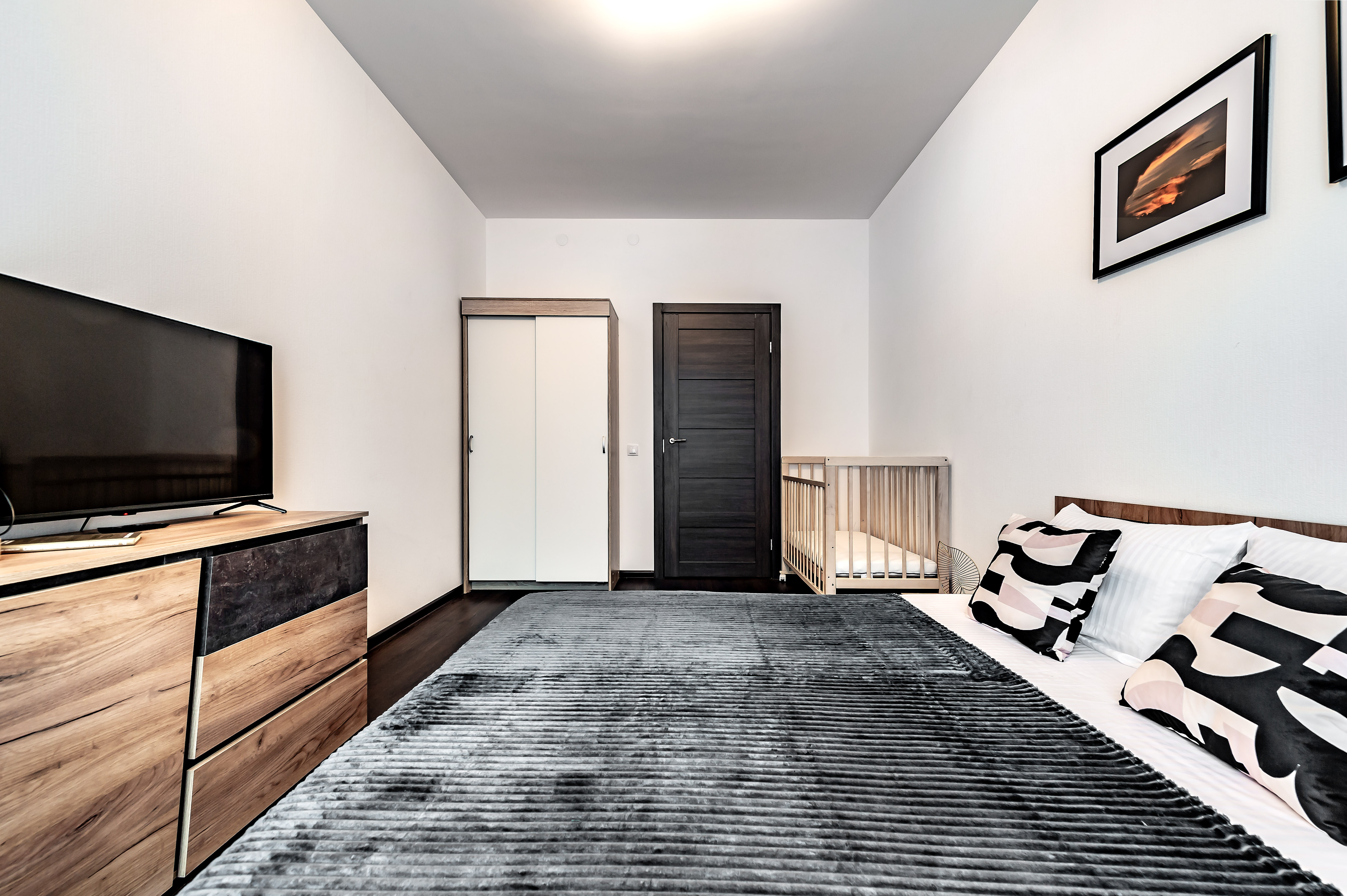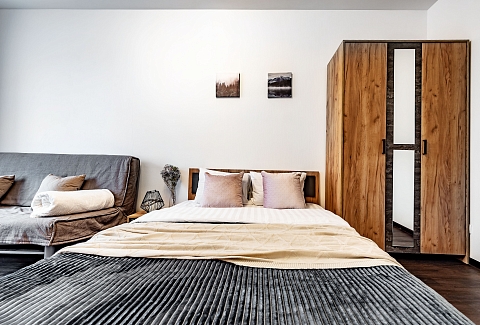 В номере: вешалка, диван раскладной, зеркало, комод, кровать двуспальная, кровать детская, кухонная мебель, прикроватные тумбочки, стеллаж, стол обеденный, стулья, шкаф, духовой шкаф, микроволновая печь, набор посуды, плита электрическая, стиральная машина, телевизор, утюг, холодильник, чайный набор посуды, электрочайник