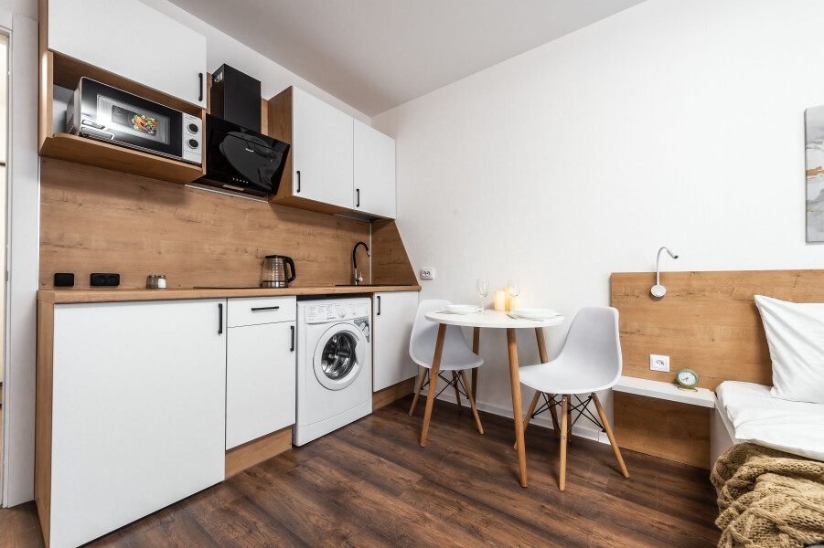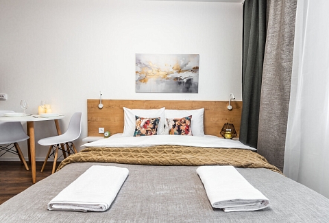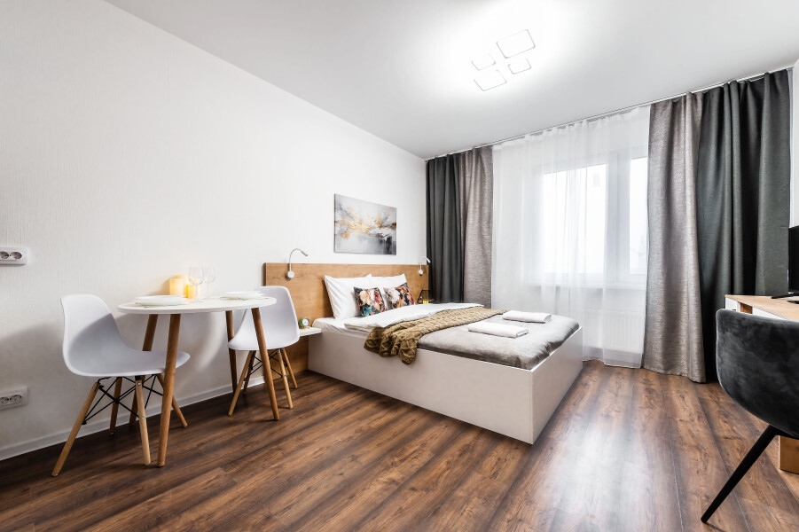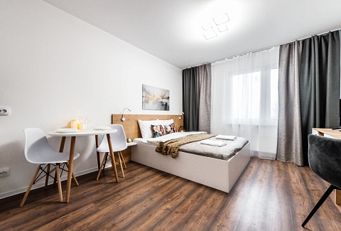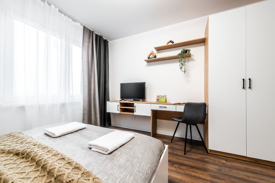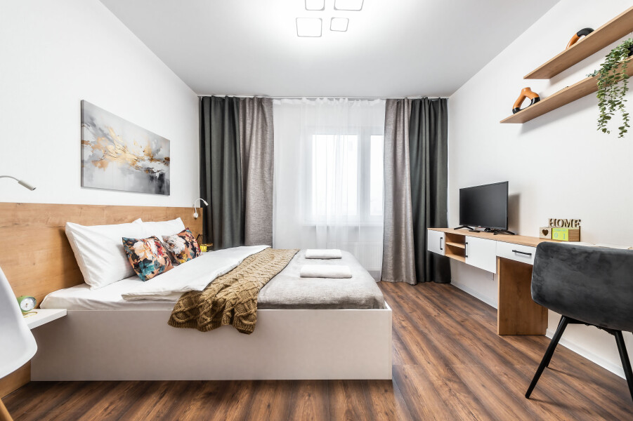 Современные апартаменты сочетает в себе стиль и функциональность, создавая атмосферу, где каждый гость сможет расслабиться и насладиться временем вдали от дома. Вся необходимая бытовая техника и необходимый набор посуды. По два полотенца для каждого гостя, одноразовые средства личной гигиены, одноразовые тапочки, качественный ортопедический матрас.Апартаменты расположены в тихом районе с развитой инфраструктурой, рядом магазины, супермаркеты, кафе и рестораны.Общественная парковка рядом с домом сделают пребывание еще более комфортным.