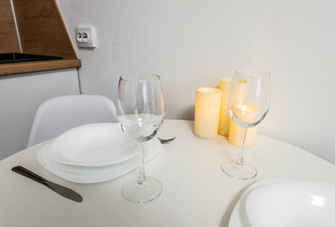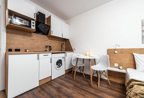 В номере: зеркало, кровать двуспальная, стол, стулья, шкаф, гладильная доска, микроволновая печь, мини-холодильник, набор посуды, плита электрическая, стиральная машина, сушилка для белья, телевизор ЖК, утюг, чайный набор посуды, электрочайник
