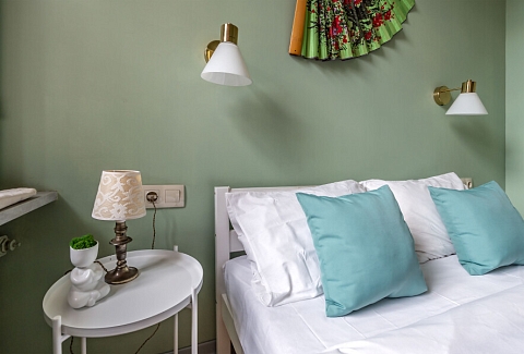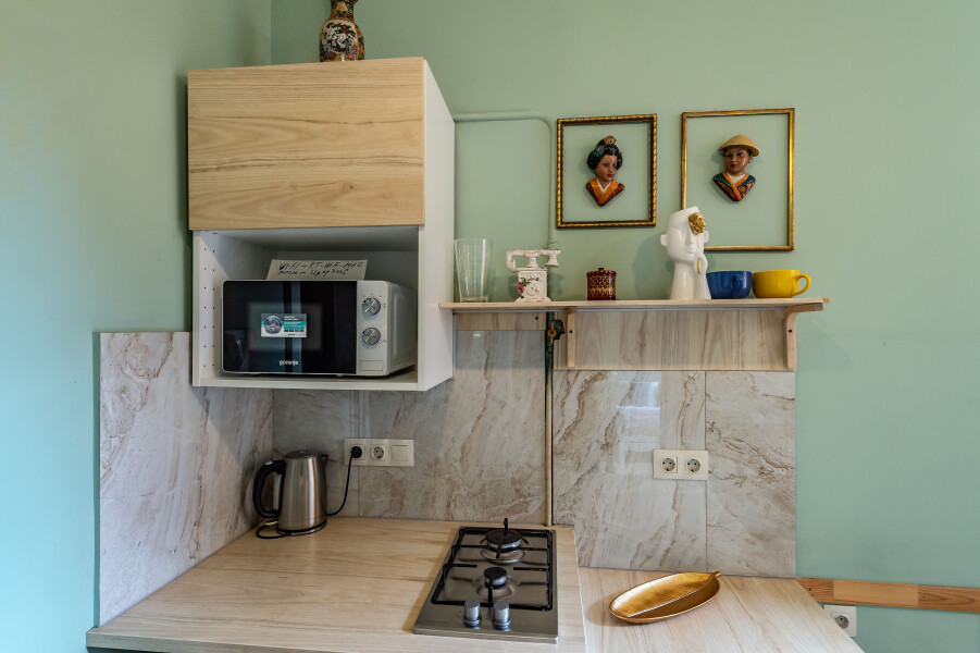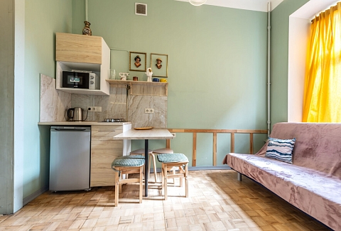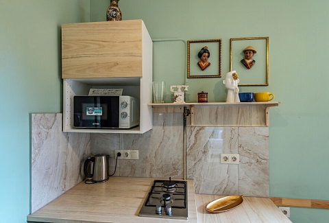 В номере: зеркало, кровать двуспальная, стол, стулья, шкаф, микроволновая печь, мини-холодильник, набор посуды, плита газовая, стиральная машина, сушилка для белья, телевизор ЖК, утюг, электрочайник