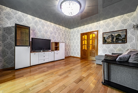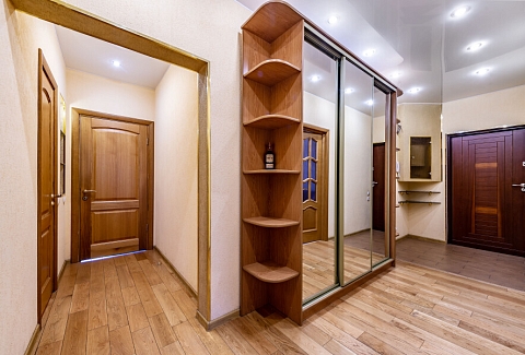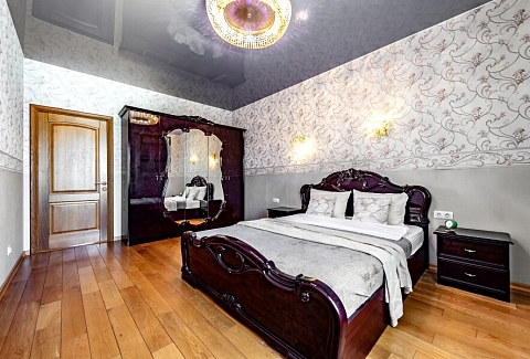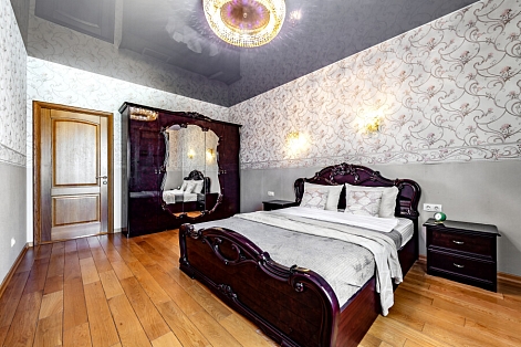 В номере: диван, зеркало, кровать двуспальная, стол, стулья, шкаф, микроволновая печь, набор посуды, плита электрическая, стиральная машина, сушилка для белья, телевизор ЖК, утюг, холодильник, чайный набор посуды, электрочайник