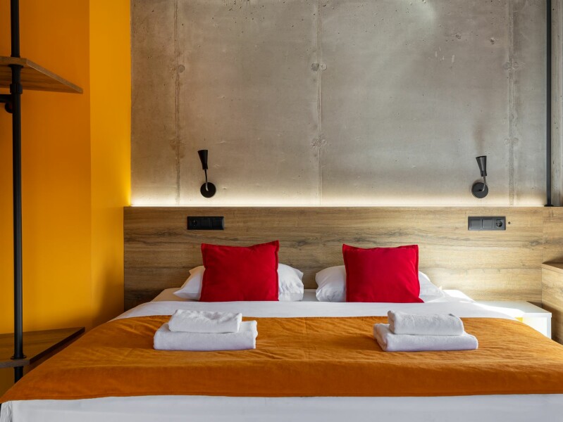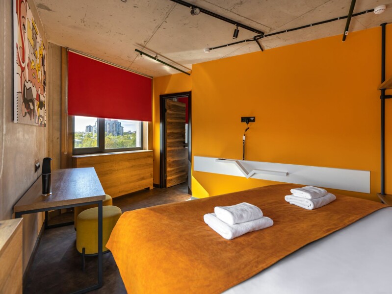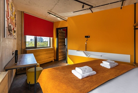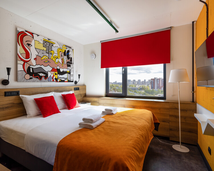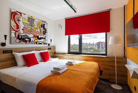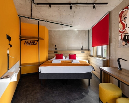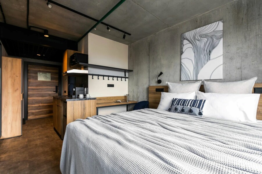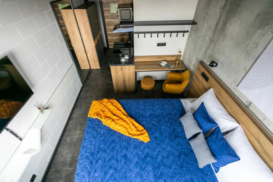 В номере: вешалка, диван, зеркало, кровать двуспальная, стол, стулья, шкаф, микроволновая печь, мини-холодильник, набор посуды, плита электрическая, телевизор, электрочайник