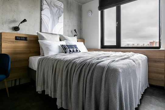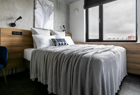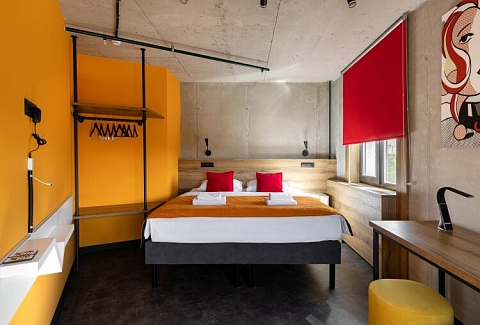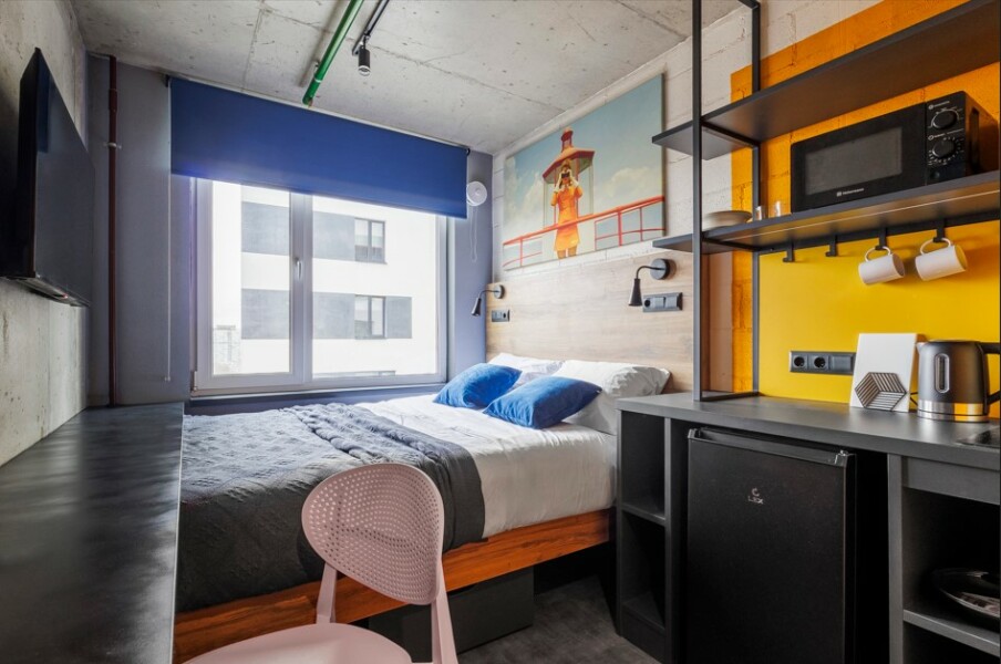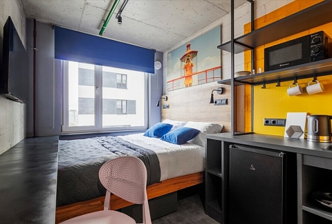 В номере: вешалка, зеркало, кровать двуспальная, стол, стулья, шкаф, микроволновая печь, мини-холодильник, набор посуды, плита электрическая, телевизор, электрочайник