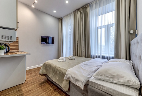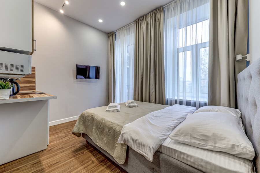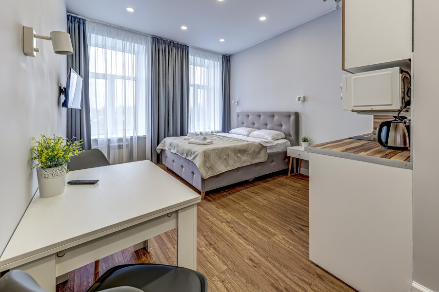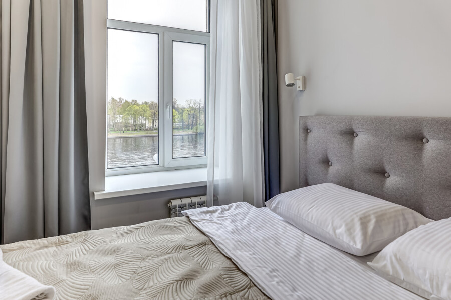 Ванная комната оборудована душевой кабиной и стиральной машиной. Из больших окон открывается живописная панорама на реку и прибрежную зону.На кухне, предназначенной для самостоятельного приготовления пищи, установлена необходимая бытовая техника: варочная поверхность, микроволновая печь, духовка и электрочайник. В шаговой доступности находится ресторан «Шикэ», предлагающий попробовать традиционные блюда китайской кухни.В окрестностях расположены известные городские достопримечательности: Мигуновский парк, Салтыковский сад и место трагической дуэли А.С. Пушкина. До аэропорта расстояние составляет 19,8 км, а до железнодорожного вокзала – 5,1 км.