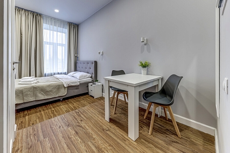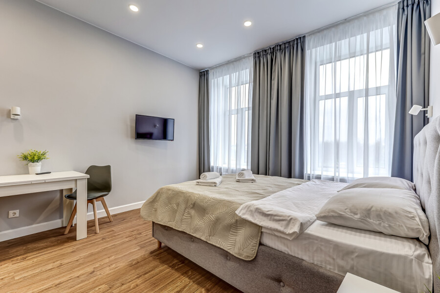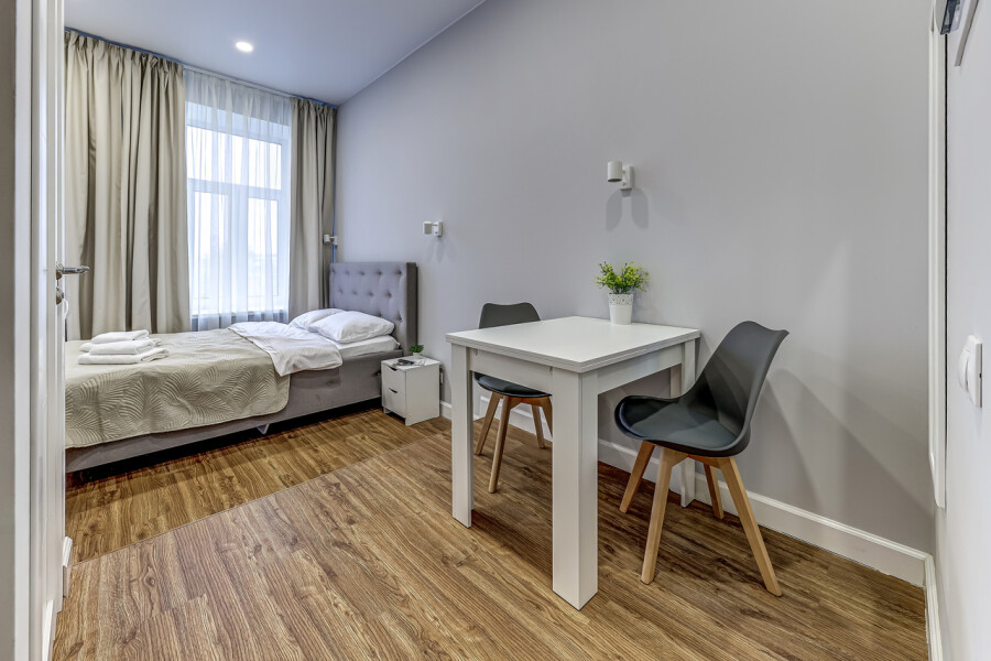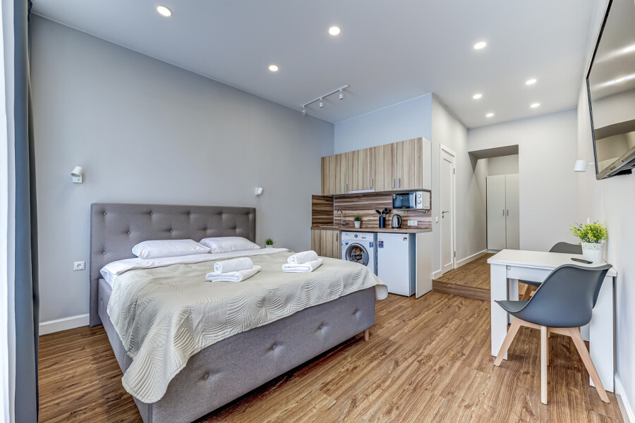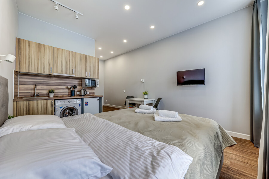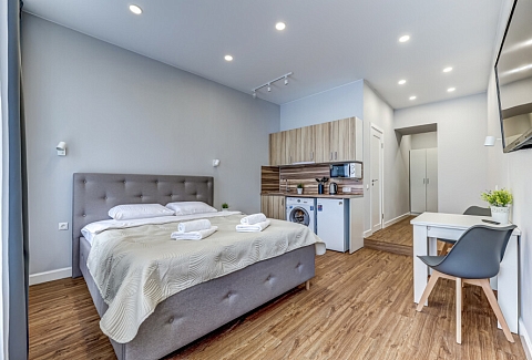В номере: вешалка, диван раскладной, зеркало, стол, стулья, шкаф, микроволновая печь, мини-холодильник, набор посуды, плита электрическая, стиральная машина, телевизор, утюг, электрочайник