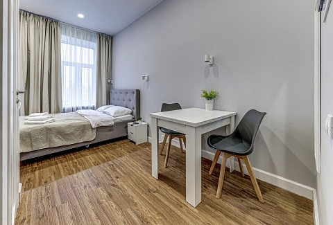 Поездом до ж/д вокзала Московский (г. Санкт-Петербург), далее на метро до станции «Чёрная речка», далее пройти пешком 1,8 км до апартаментов.