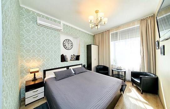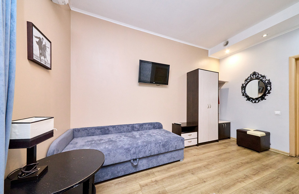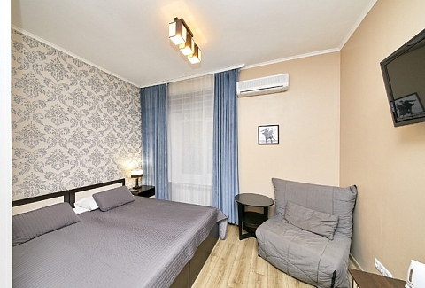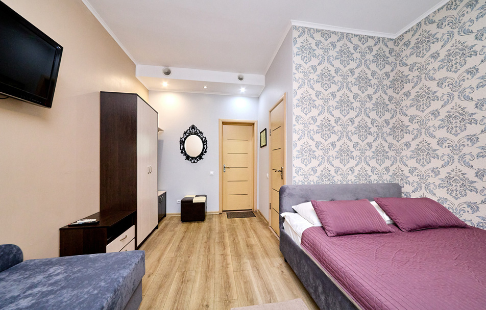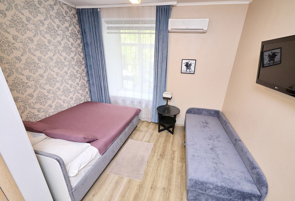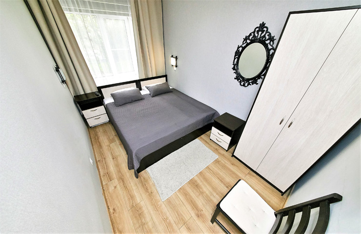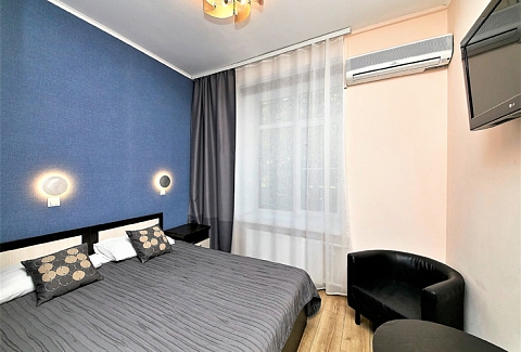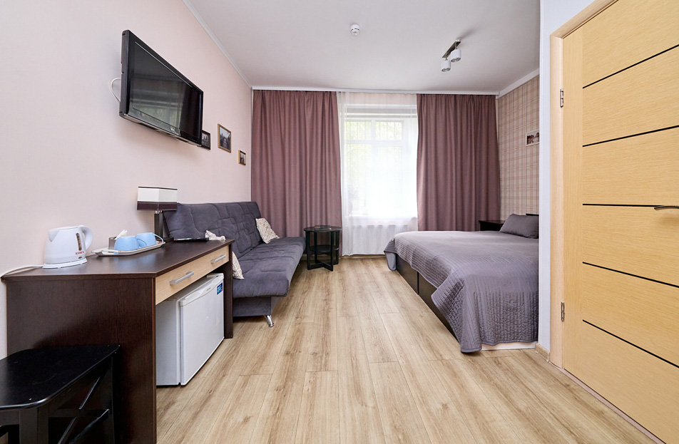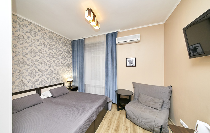 В номере: вешалка, диван раскладной, зеркало, кровать двуспальная, стол, шкаф, кондиционер, мини-холодильник, телевизор
