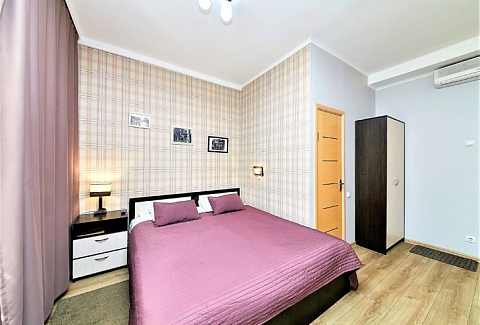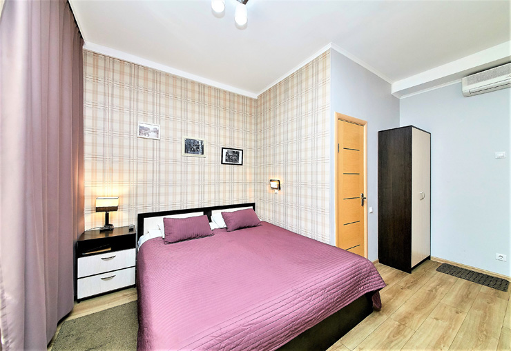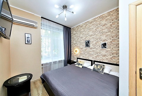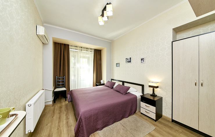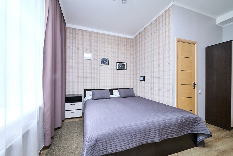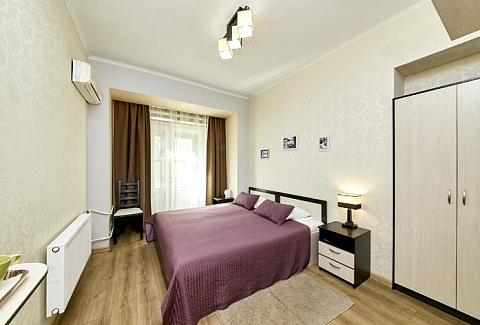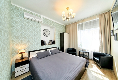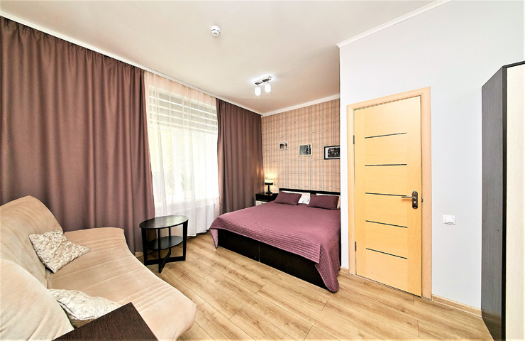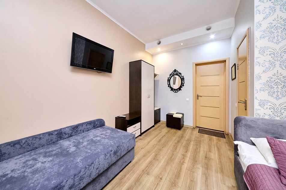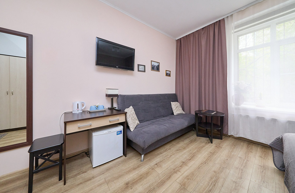В номере: вешалка, диван раскладной, зеркало, кровать двуспальная, стол, шкаф, кондиционер, мини-холодильник, телевизор