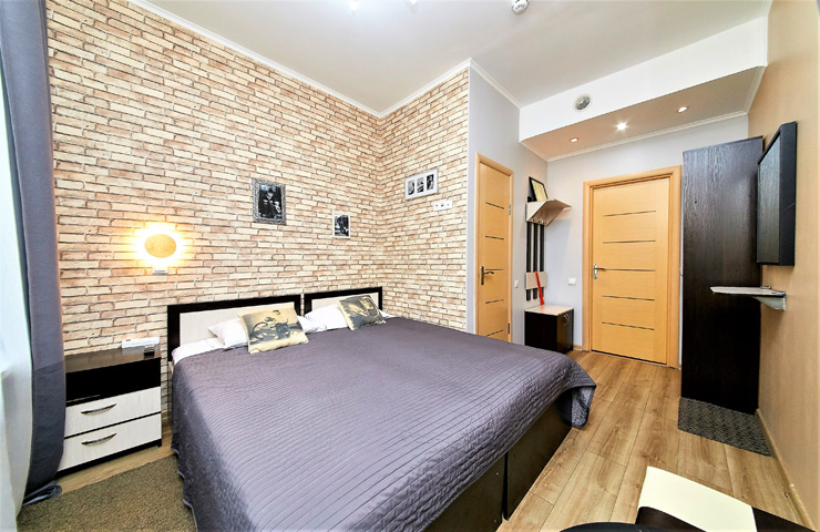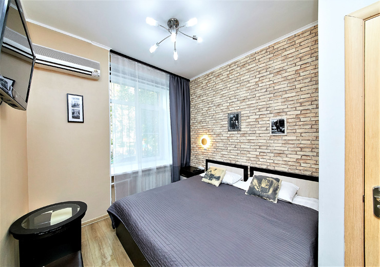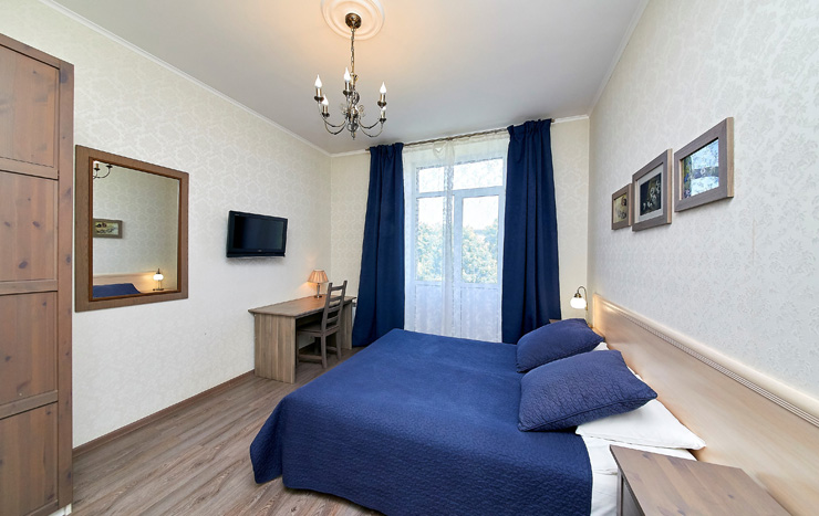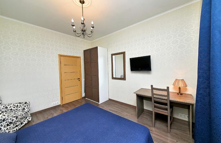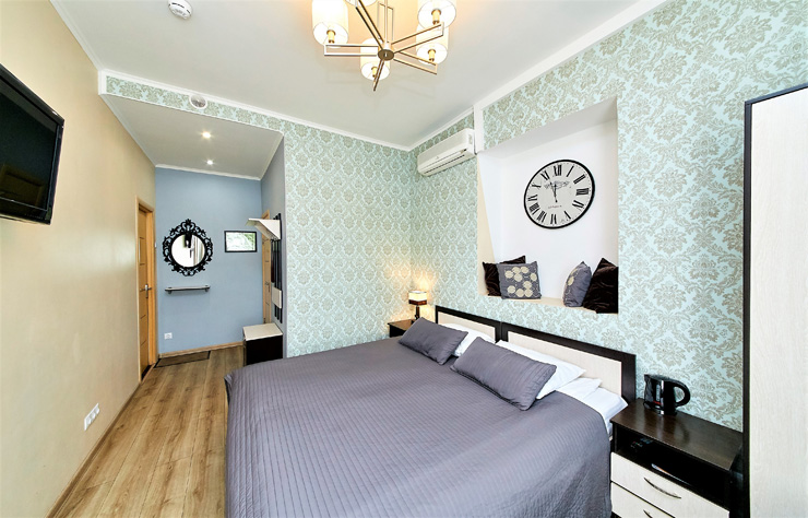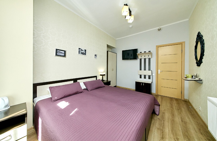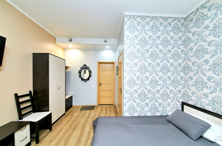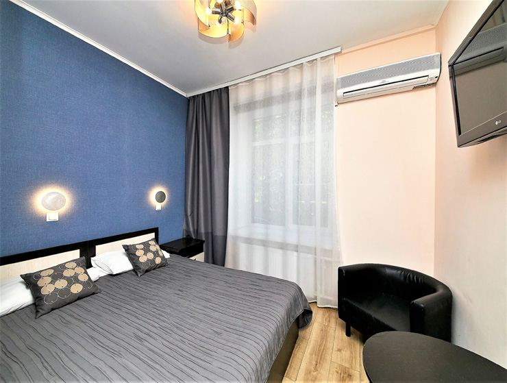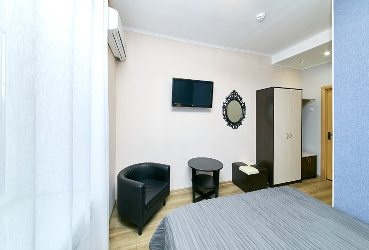В номере: вешалка, диван, зеркало, кровать двуспальная, стол, шкаф, кондиционер, телевизор