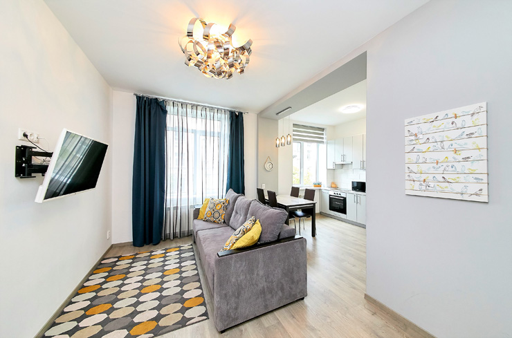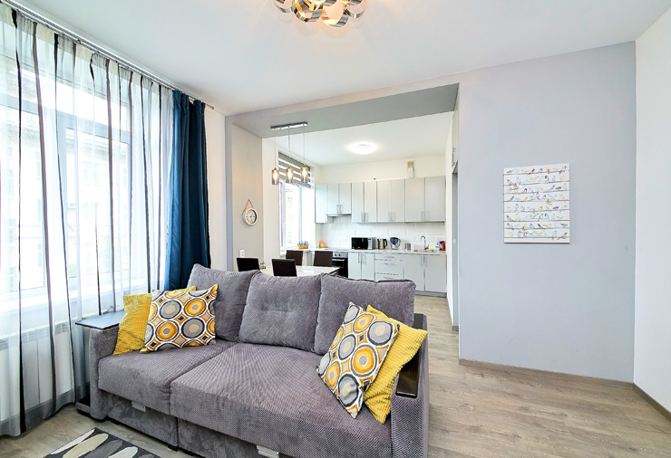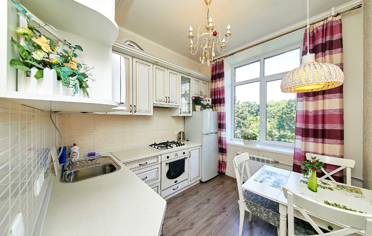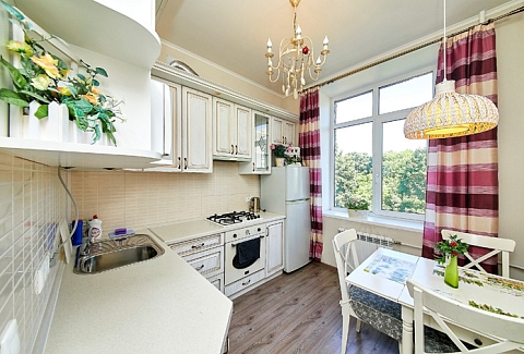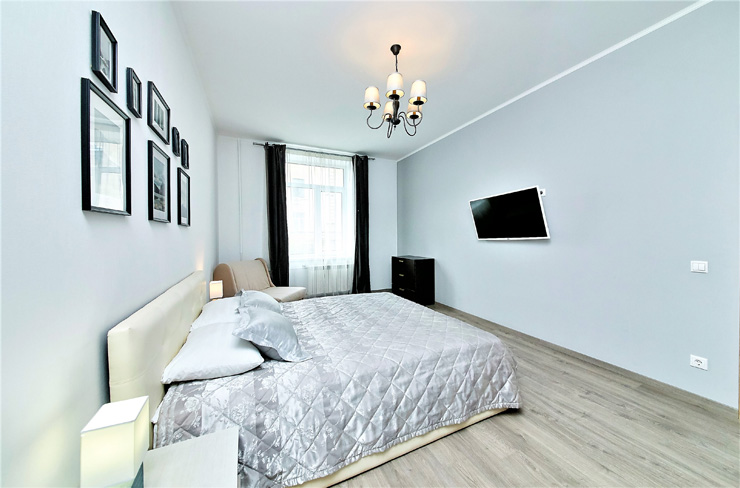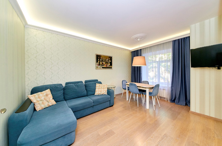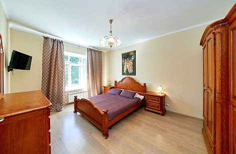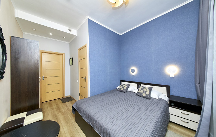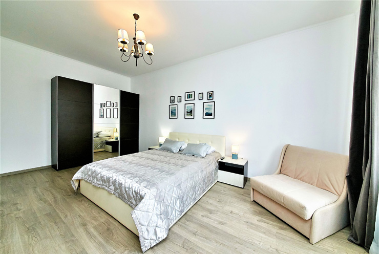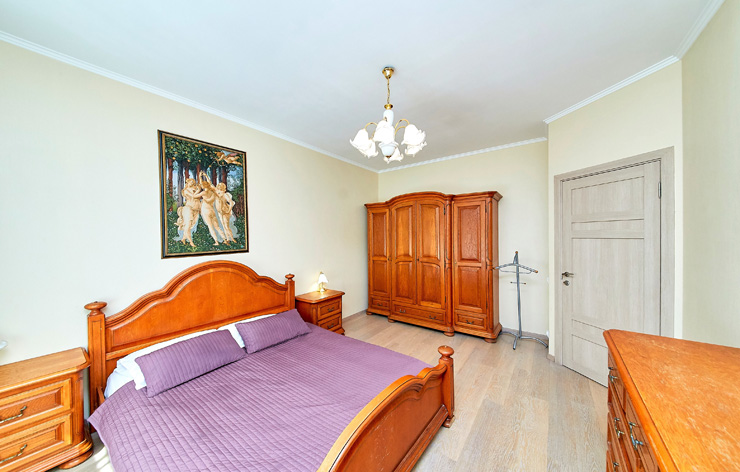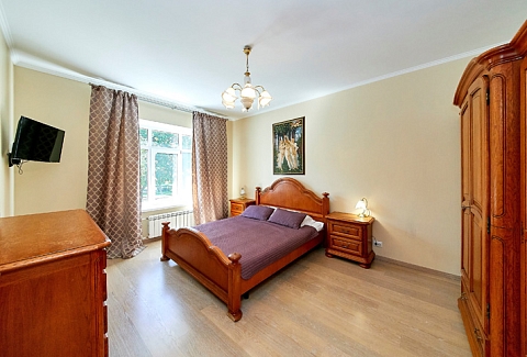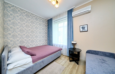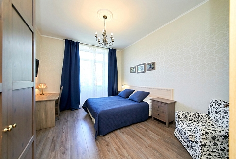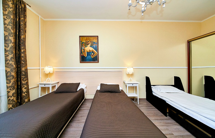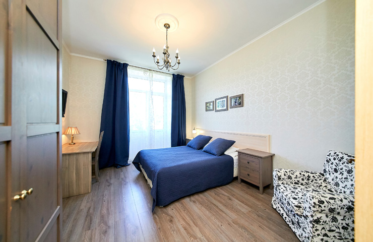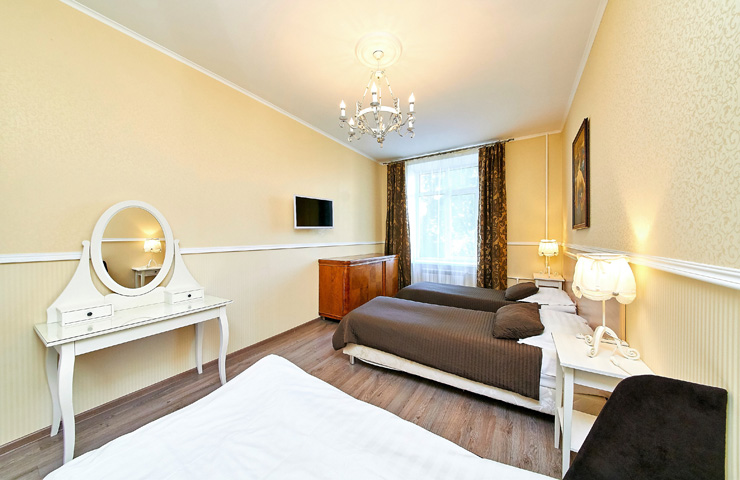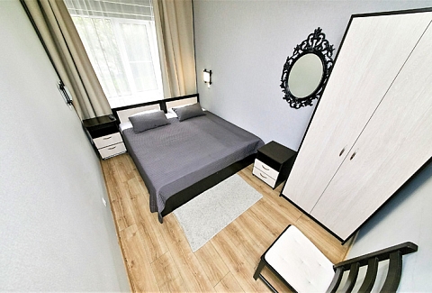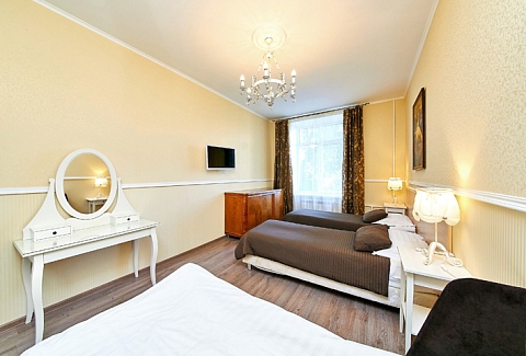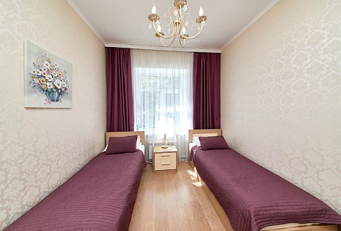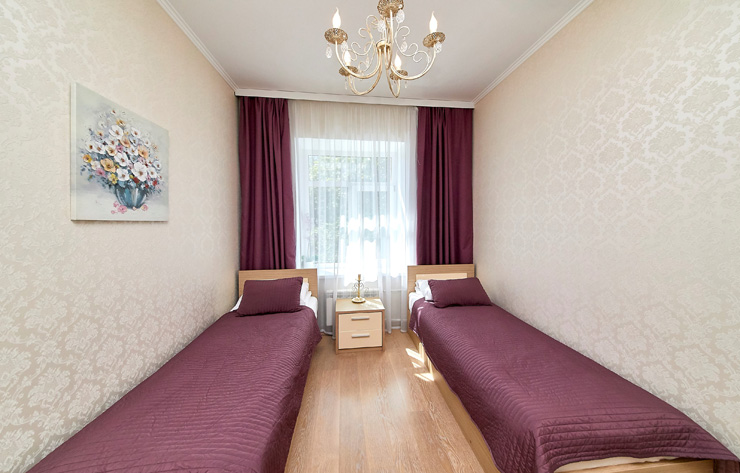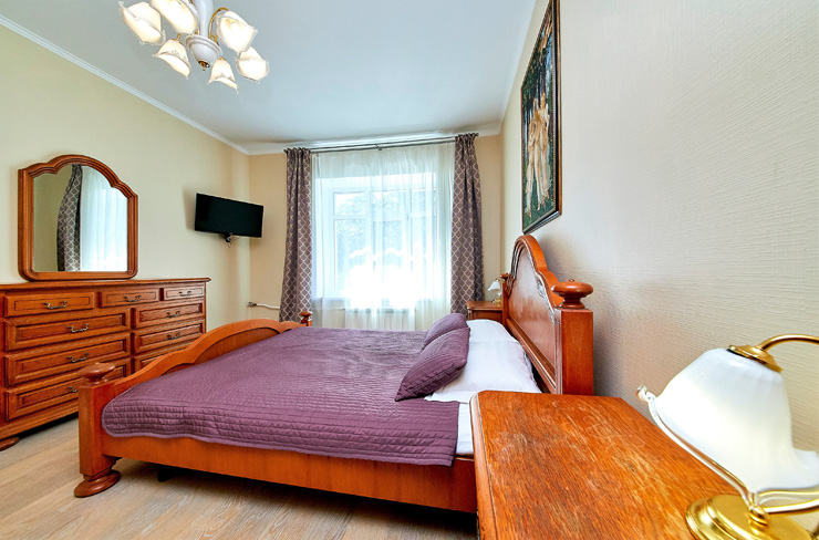 В номере: вешалка, диван, зеркало, комод, кровати односпальные, кровать двуспальная, прикроватные тумбочки, стол, стулья, шкаф, духовой шкаф, микроволновая печь, мини-холодильник, набор посуды, плита электрическая, стиральная машина, телевизор, электрочайник