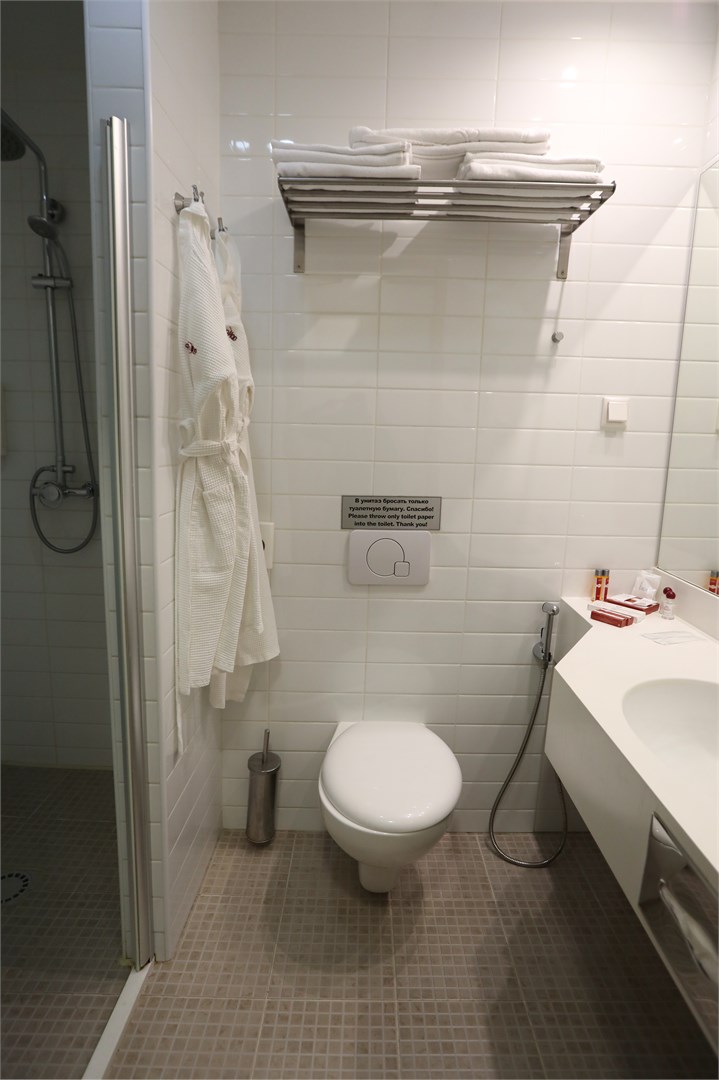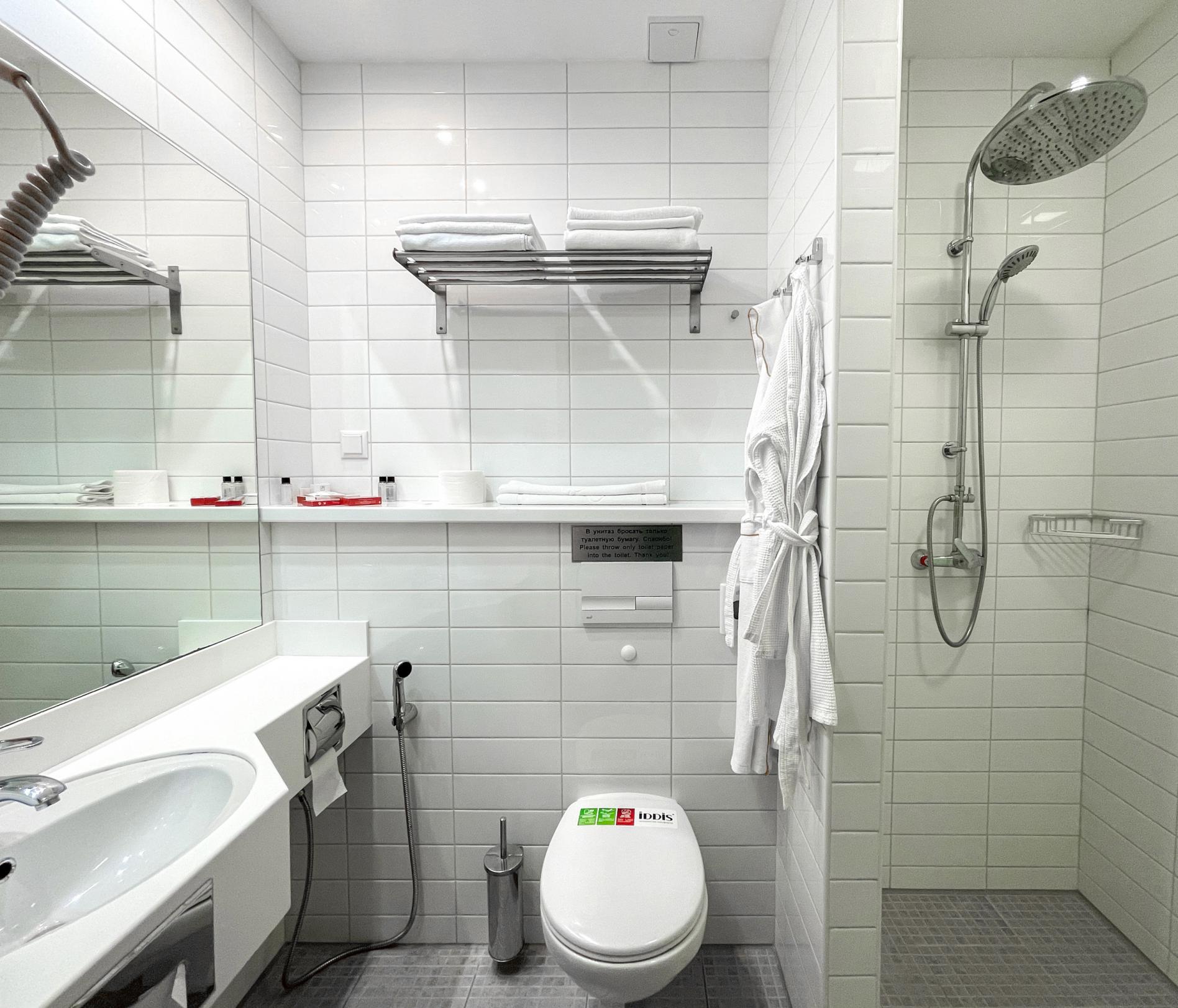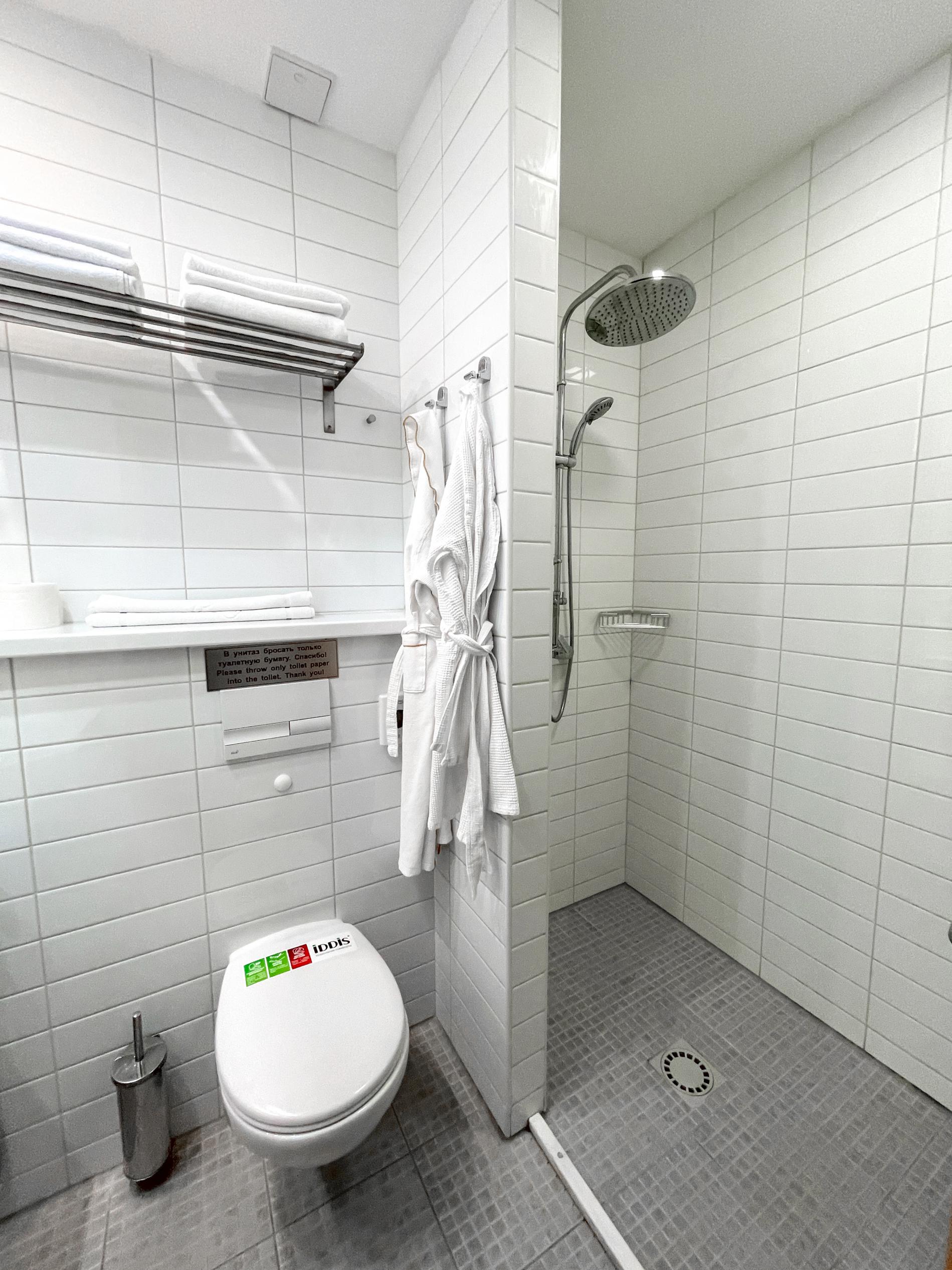 Санузел: с душевой кабиной, тапочки, туалетные принадлежности, фен, халат