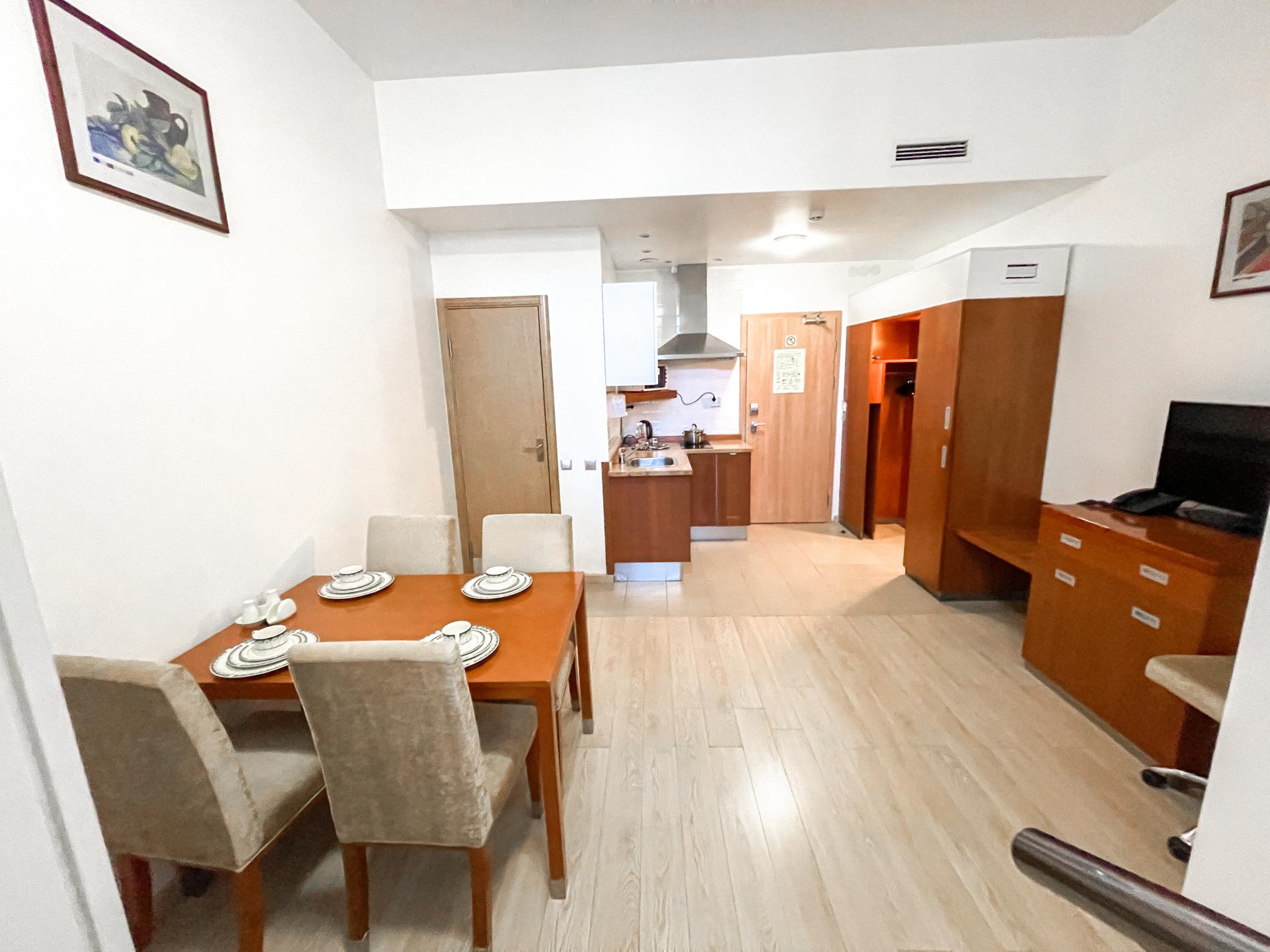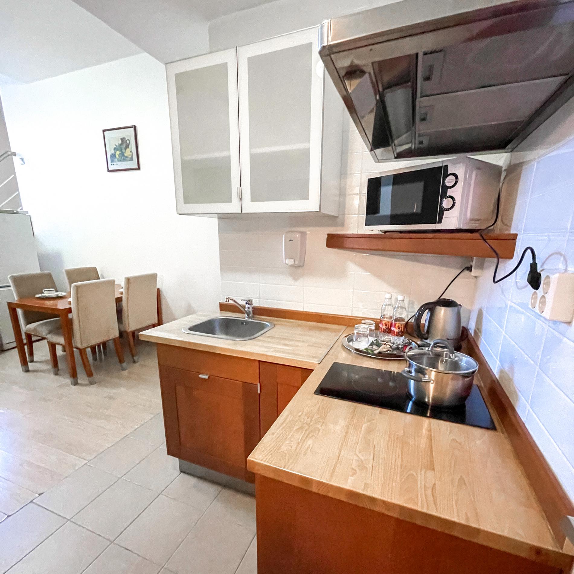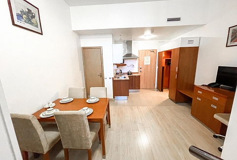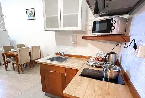 В номере: вешалка, диван раскладной, зеркало, кресла, кровать двуспальная, прикроватные тумбочки, стол, столик журнальный, стулья, тумба багажная, шкаф, микроволновая печь, набор посуды, плита электрическая, телевизор ЖК, телефон, холодильник, центральная система охлаждения, электрочайник