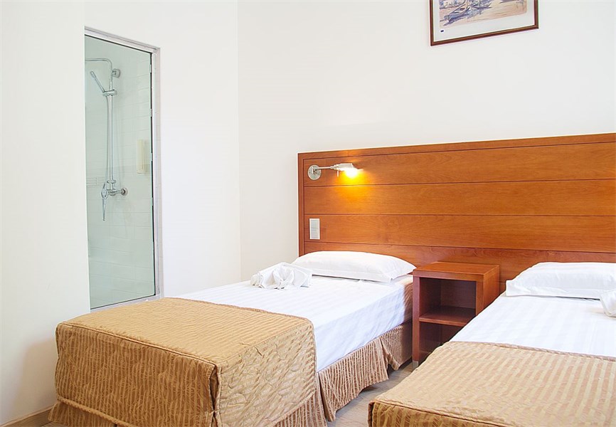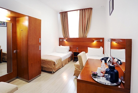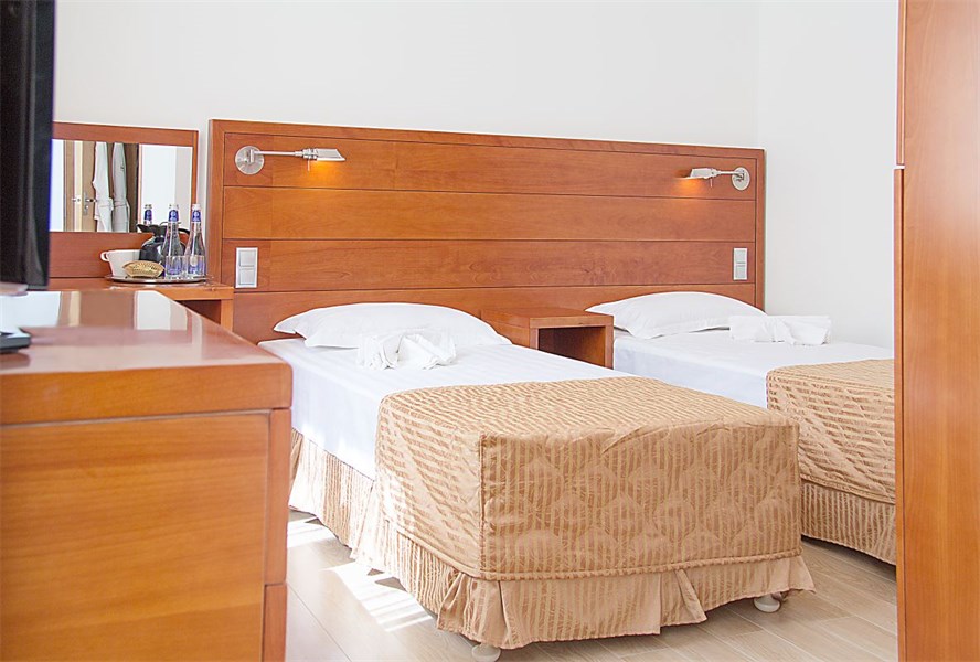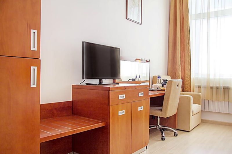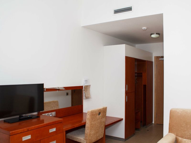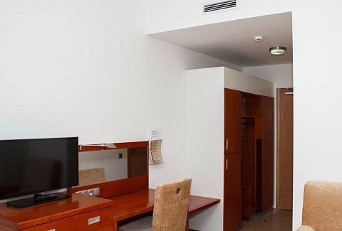 В номере: вешалка, зеркало, кресла, кровати односпальные /одна двуспальная кровать, прикроватная тумбочка, стол, стулья, тумба багажная, шкаф, мини-холодильник, телевизор ЖК, телефон, центральная система охлаждения, чайный набор посуды