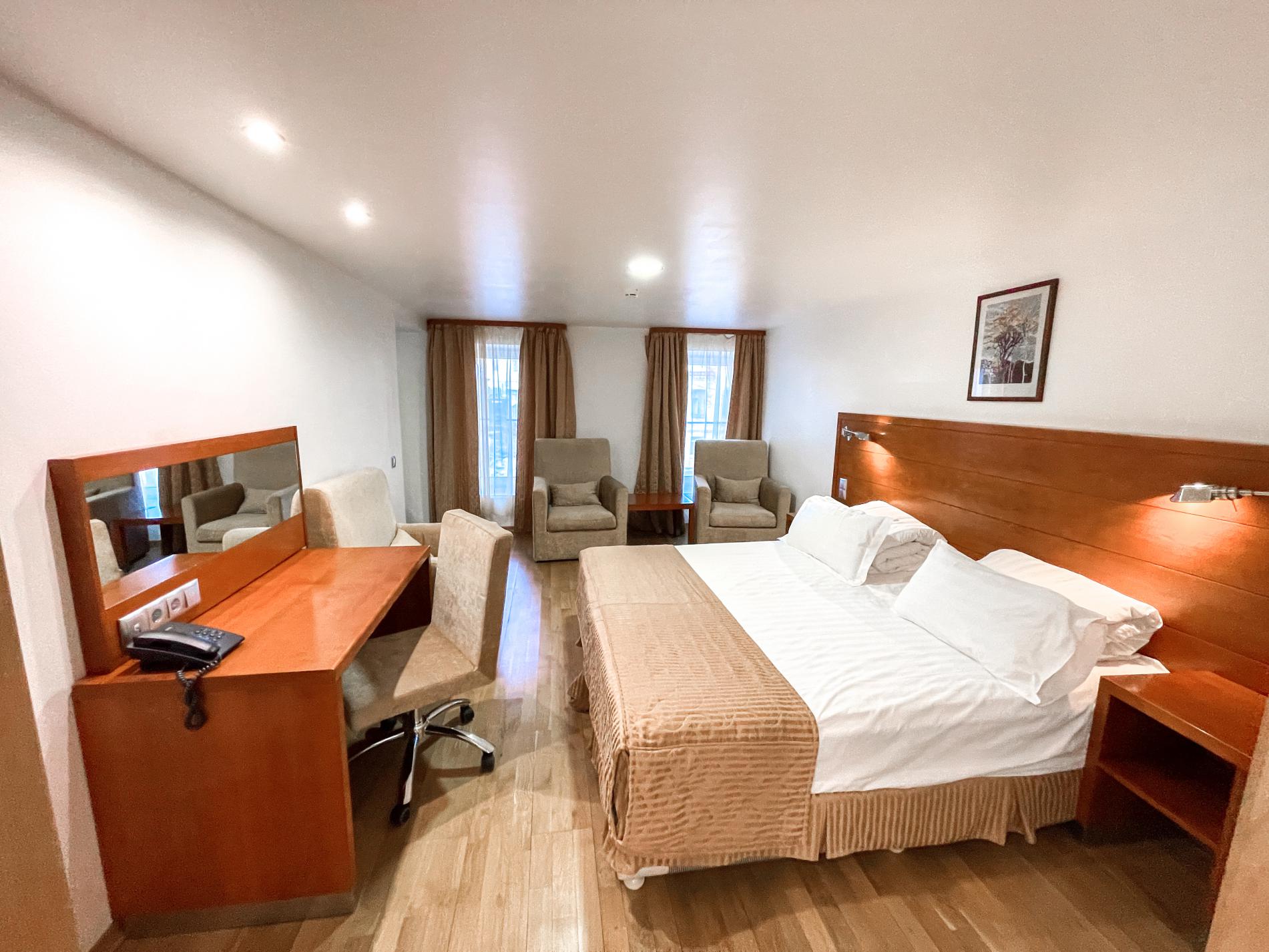 В номере: вешалка, диван раскладной, зеркало, кресла, кровати односпальные /одна двуспальная кровать, прикроватные тумбочки, стол, столик журнальный, стулья, тумба багажная, шкаф, телевизор ЖК, телефон, холодильник, центральная система охлаждения, чайный набор посуды