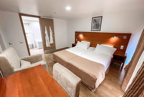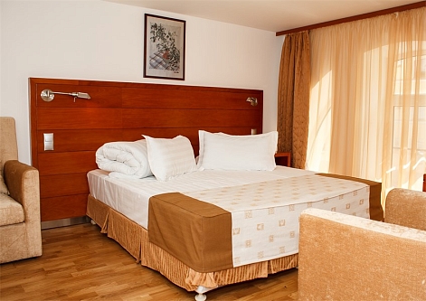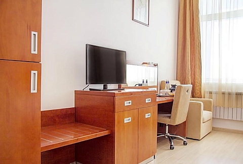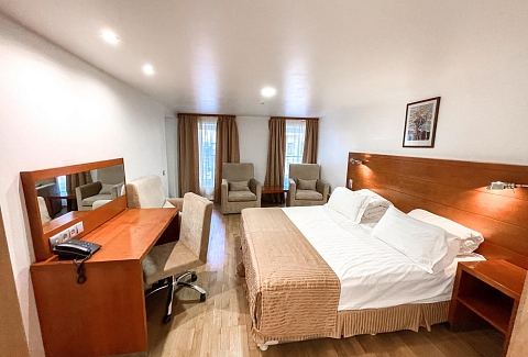 В номере: вешалка, зеркало, кресла, кровати односпальные /одна двуспальная кровать, прикроватные тумбочки, стол, стулья, шкаф, телевизор ЖК, телефон, центральная система охлаждения, чайный набор посуды, электрочайник