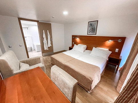 В номере: вешалка, зеркало, кресла, кровати односпальные /одна двуспальная кровать, прикроватные тумбочки, стол, столик журнальный, стулья, тумба багажная, шкаф, мини-холодильник, телевизор ЖК, телефон, центральная система охлаждения, чайный набор посуды