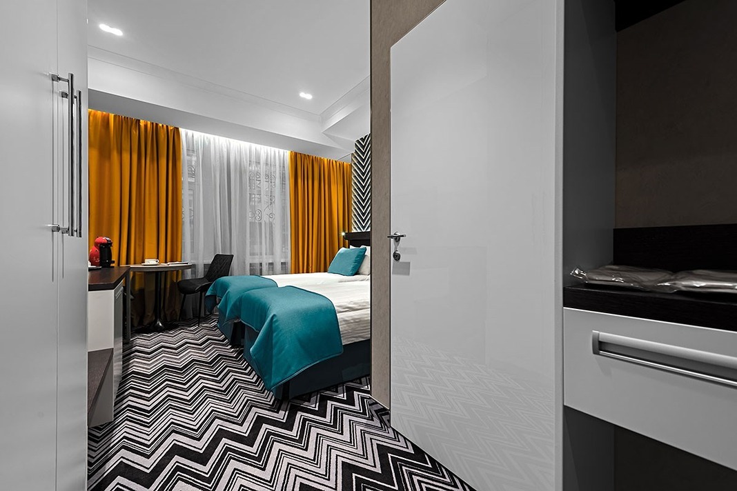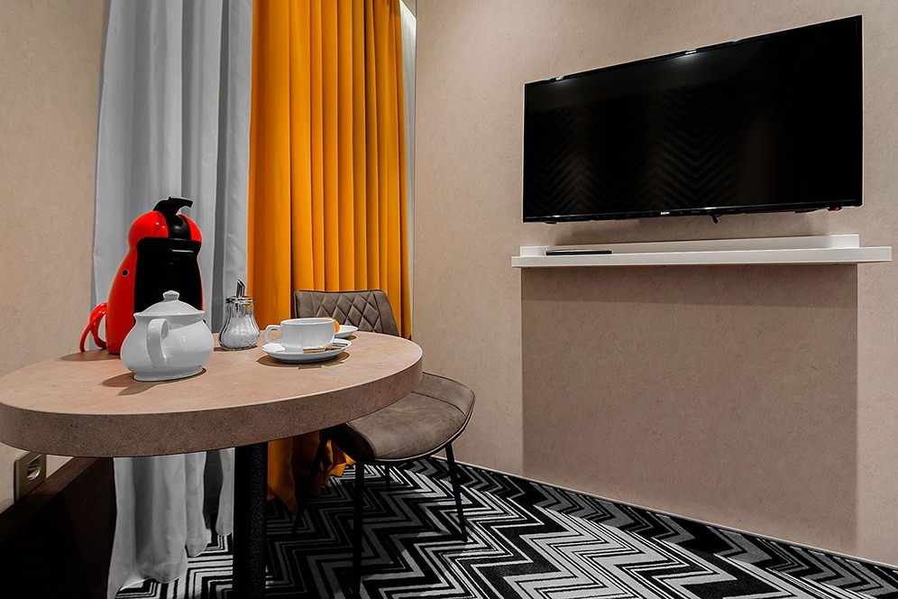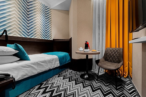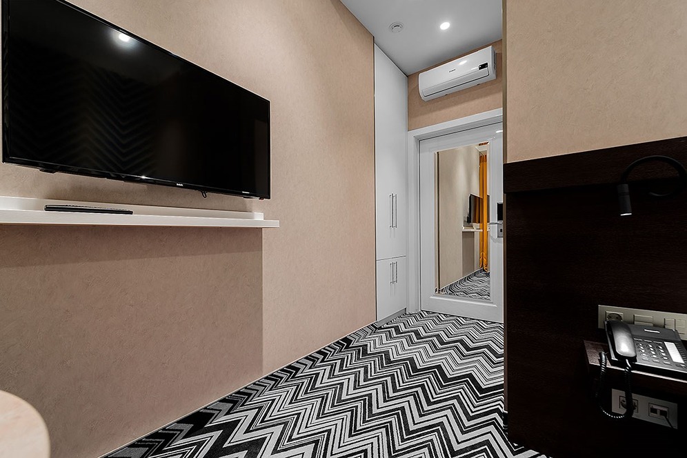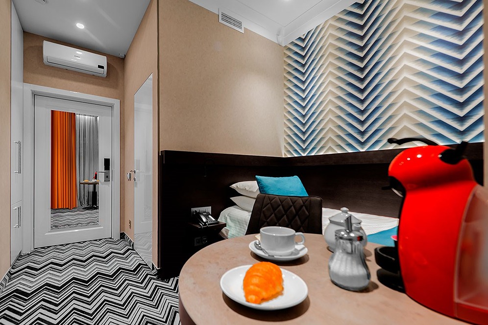 В номере: вешалка, зеркало, кровать односпальная, прикроватная тумбочка, стол, стул, шкаф, кондиционер, кофемашина, мини-холодильник, сейф, телевизор, телефон