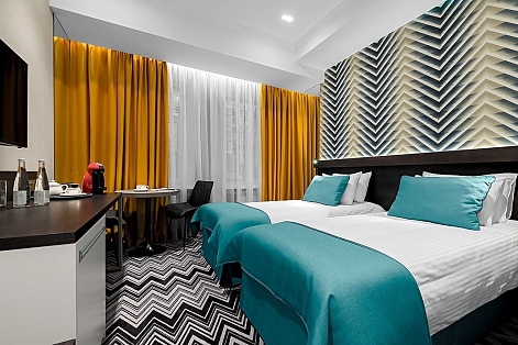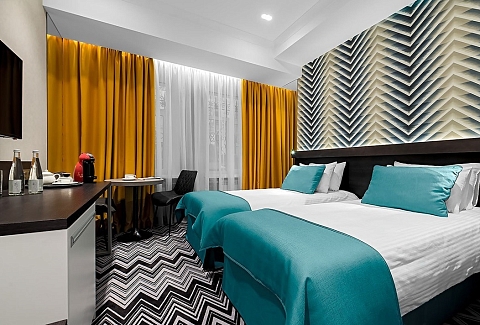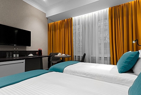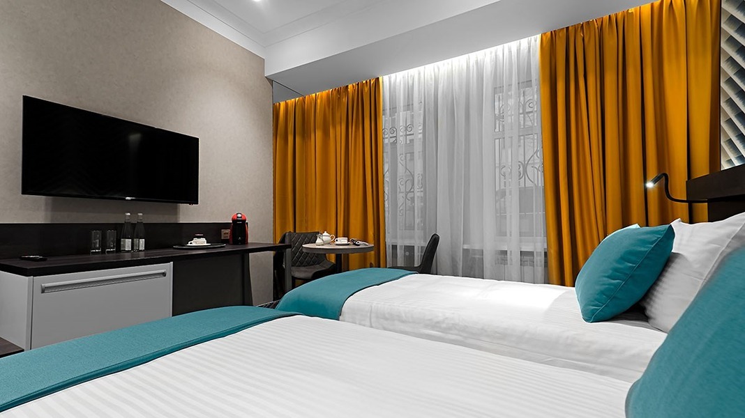 В номере: вешалка, зеркало, кровати односпальные /одна двуспальная кровать, прикроватные тумбочки, стол, стулья, шкаф, кондиционер, кофемашина, мини-холодильник, сейф, телевизор, телефон