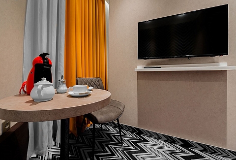 В номере: вешалка, зеркало, кровать двуспальная, прикроватные тумбочки, стол, стулья, шкаф, кондиционер, кофемашина, мини-холодильник, сейф, телевизор, телефон