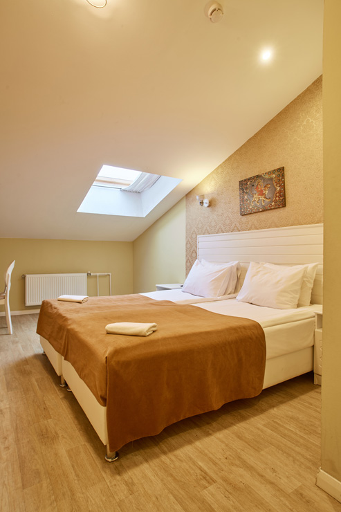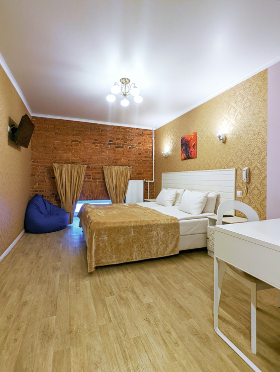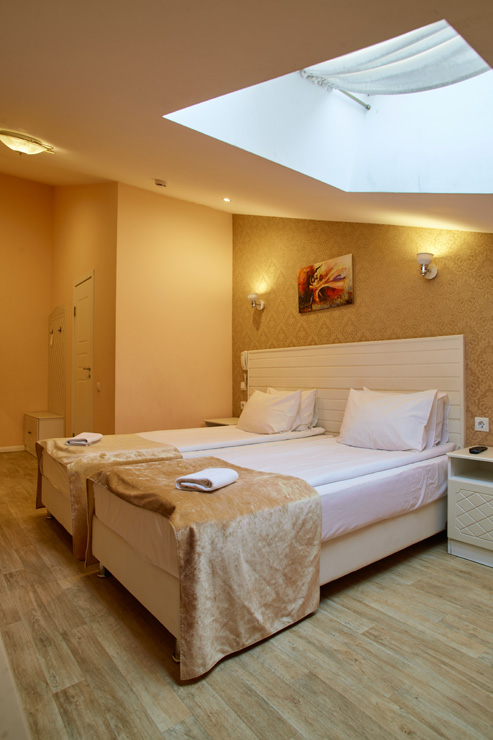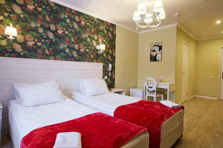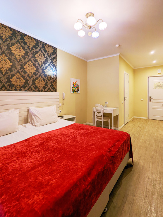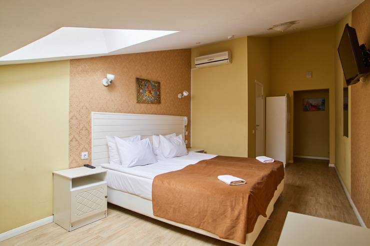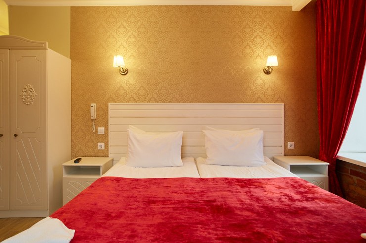 Обширный жилой фонд способен единовременно разместить почти 200 человек. Гостей ожидают 2-х местные номера категории Стандарт, Делюкс, Улучшенный. Во всех комнатах есть индивидуальный санузел с душем, из техники — плазменный телевизор, а в некоторых номерах есть электрочайник и мини-холодильник.По утрам в отеле работает кафе, где отдыхающие могут заказать себе вкусные завтраки. Для автовладельцев предусмотрена парковочная зона. На ресепшене можно приобрести экскурсии, заказать трансфер или такси.