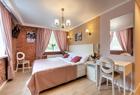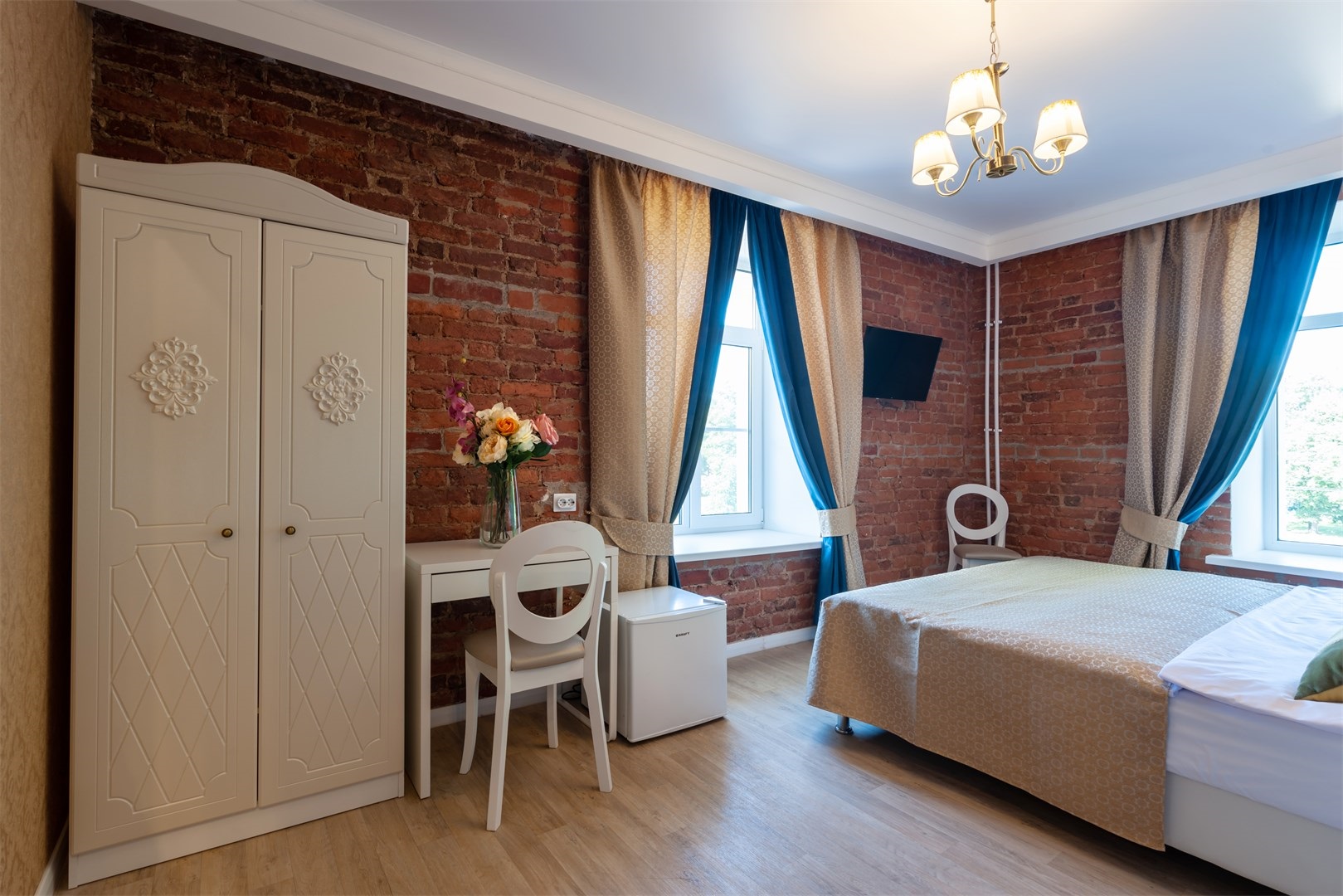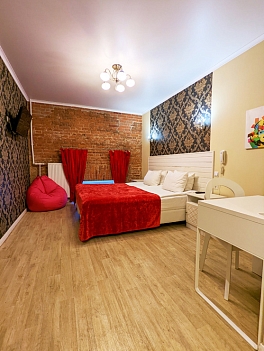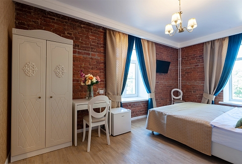 В номере: вешалка, кровать двуспальная/ две полутороспальные кровати, прикроватные тумбочки, стол, стулья, шкаф, мини-холодильник, телевизор ЖК, телефон, электрочайник