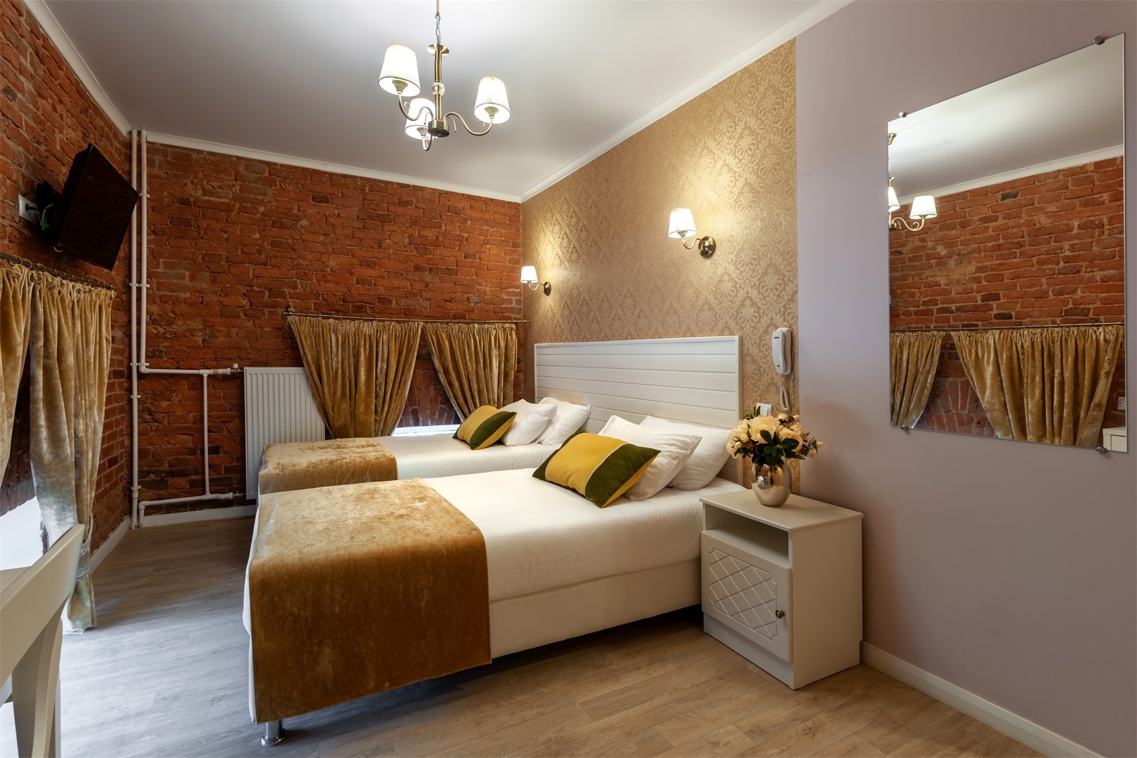В номере: вешалка, зеркало, кровати односпальные /одна двуспальная кровать, прикроватные тумбочки, стол, стул, тумба, телевизор ЖК, телефон