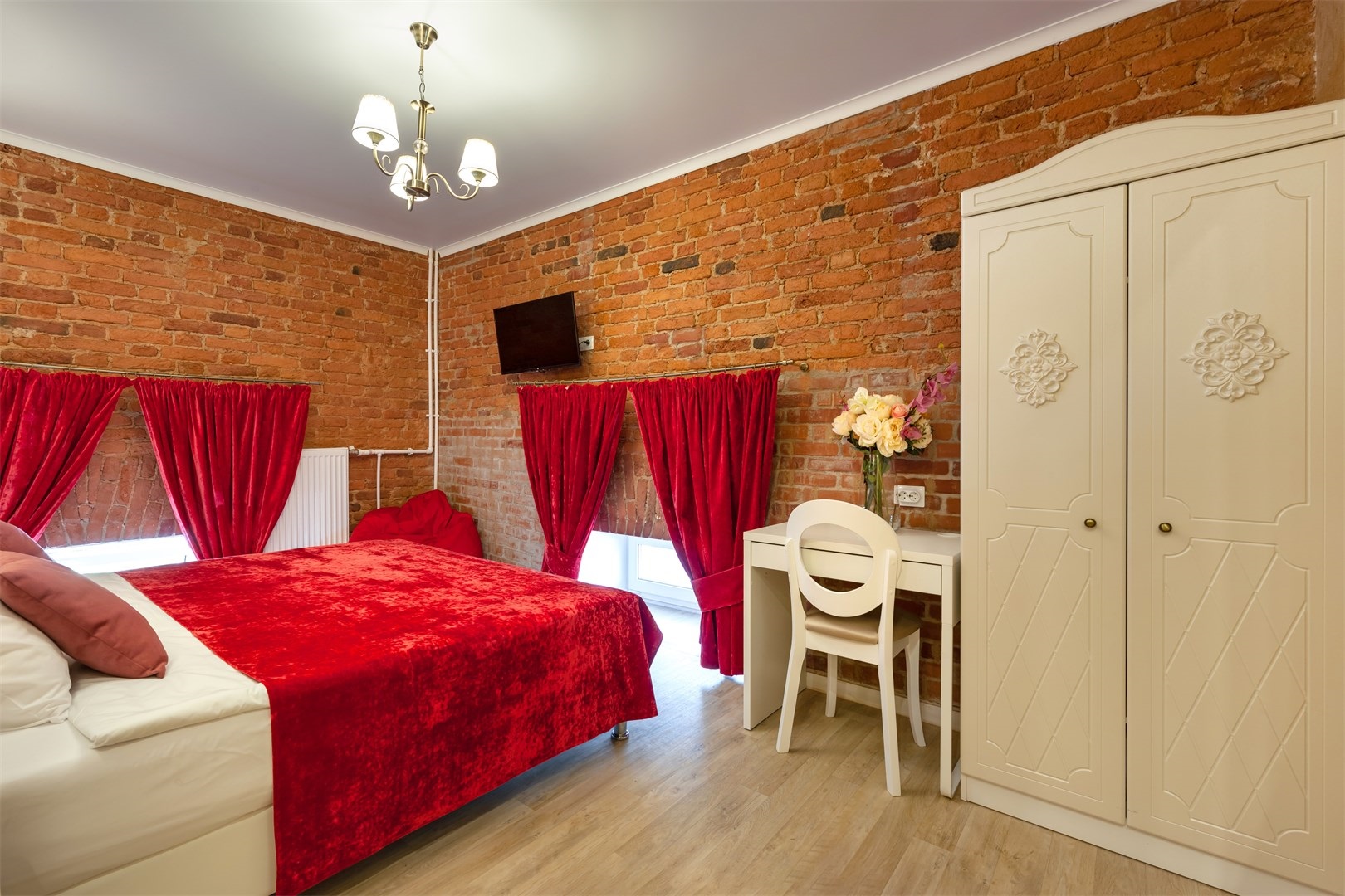 В номере: вешалка, кровати односпальные /одна двуспальная кровать, прикроватные тумбочки, стол, стулья, шкаф, телевизор ЖК, телефон