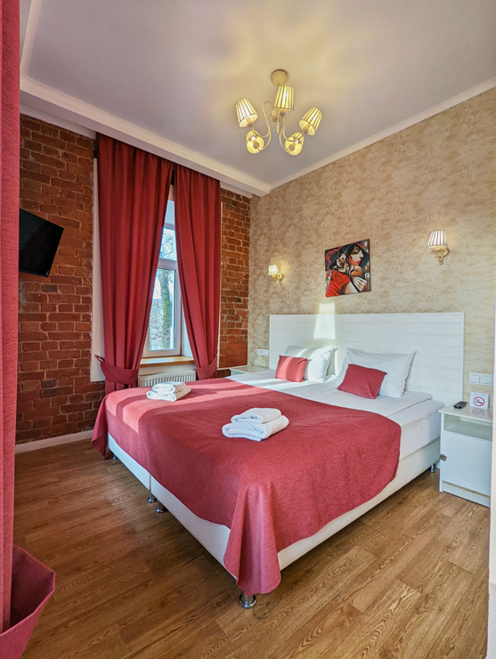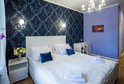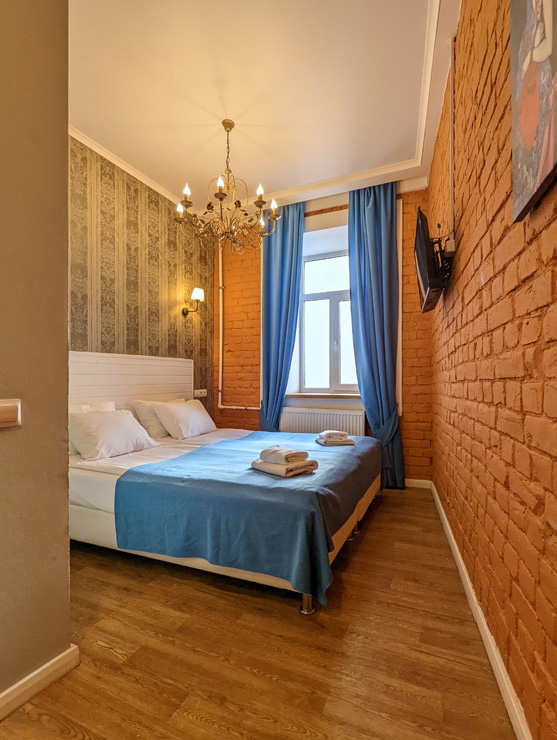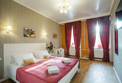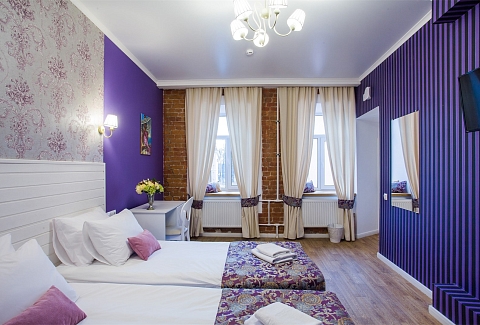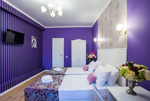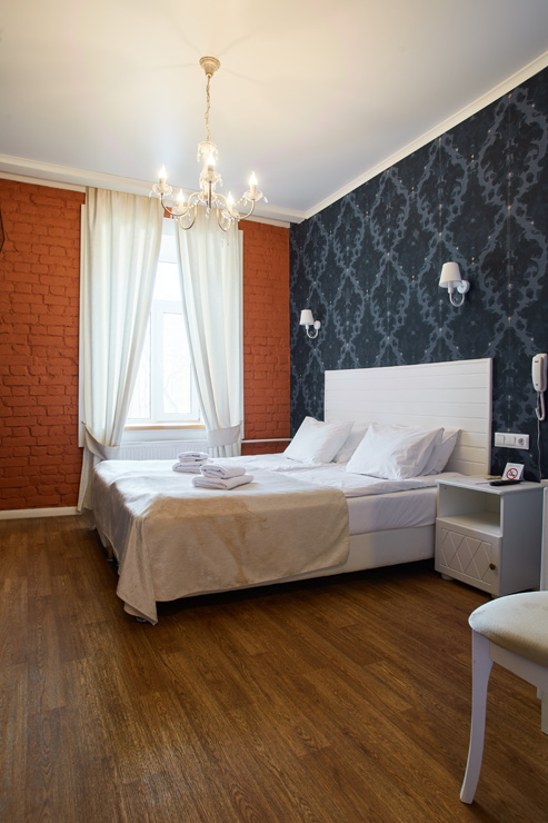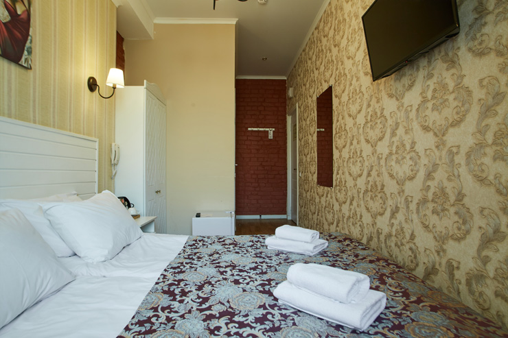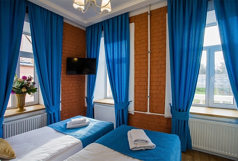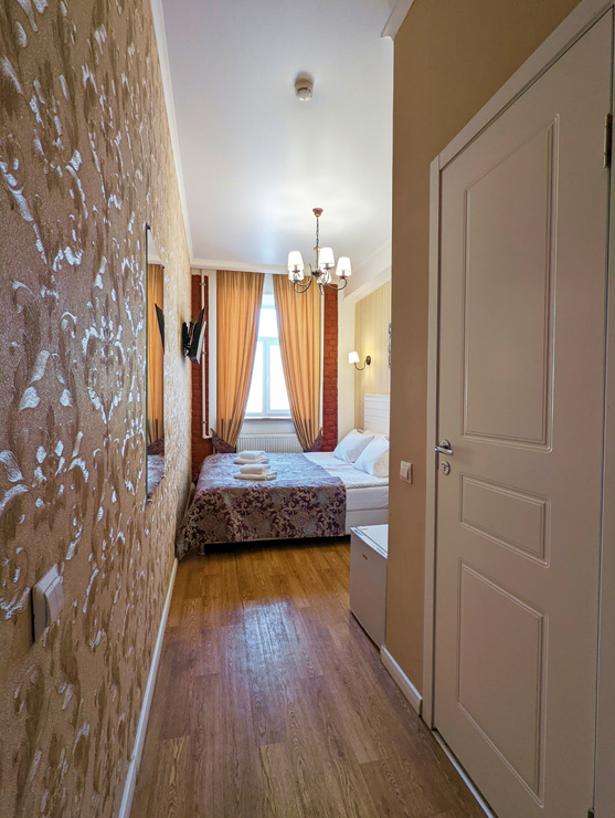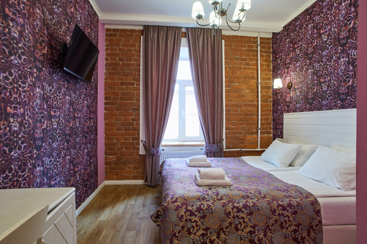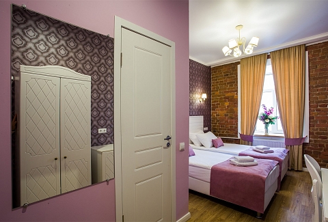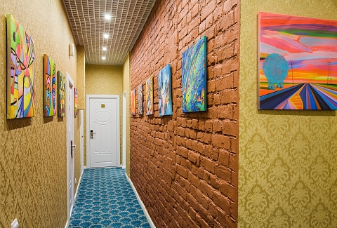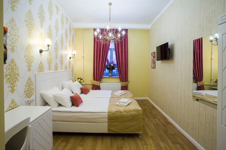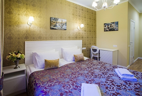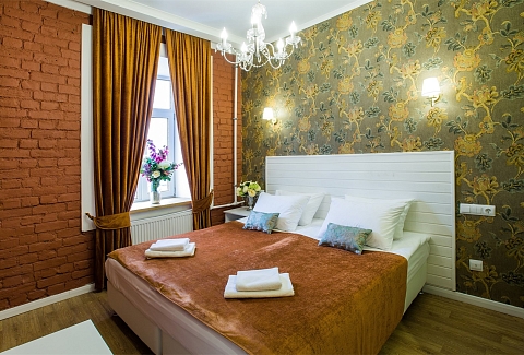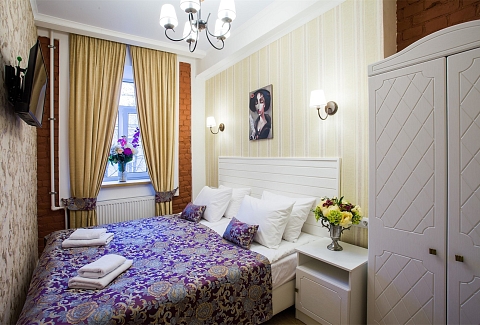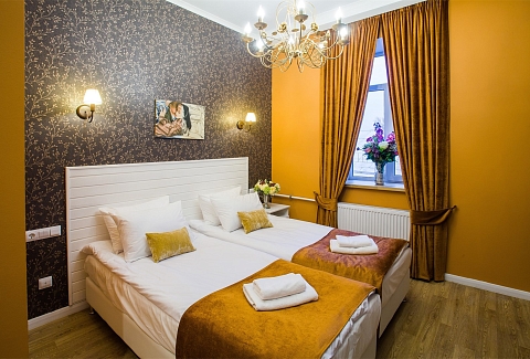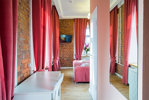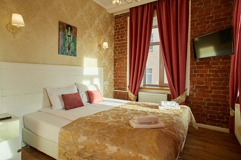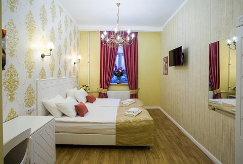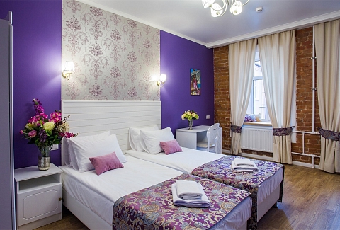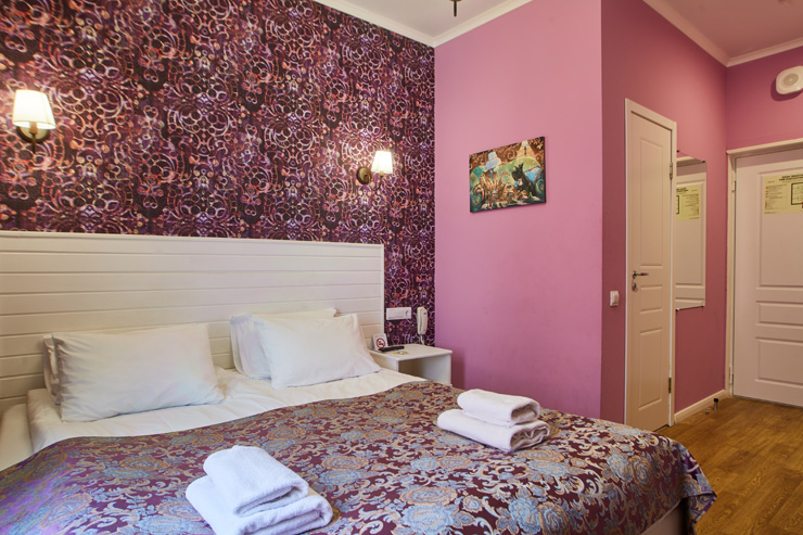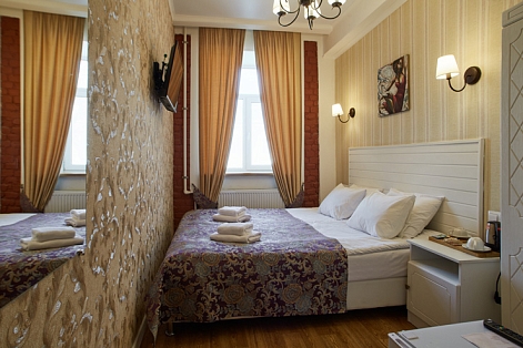 Гостей ожидают комфортабельные двухместные номера, интерьеры которых выдержаны в ярком стиле арт-деко. Все номера оснащены санузлом с душем и укомплектованы мини-холодильником и плазменным телевизором. В свободном доступе для гостей гладильная доска и утюг, так же за дополнительную оплату доступна стирка и сушка белья.В отеле работает кафе, где по утрам гостям накрывают завтраки. Также всем отдыхающим доступен беспроводной интернет и круглосуточная стойка регистрации, где можно заказать такси или приобрести экскурсии по интересным местам Петербурга.