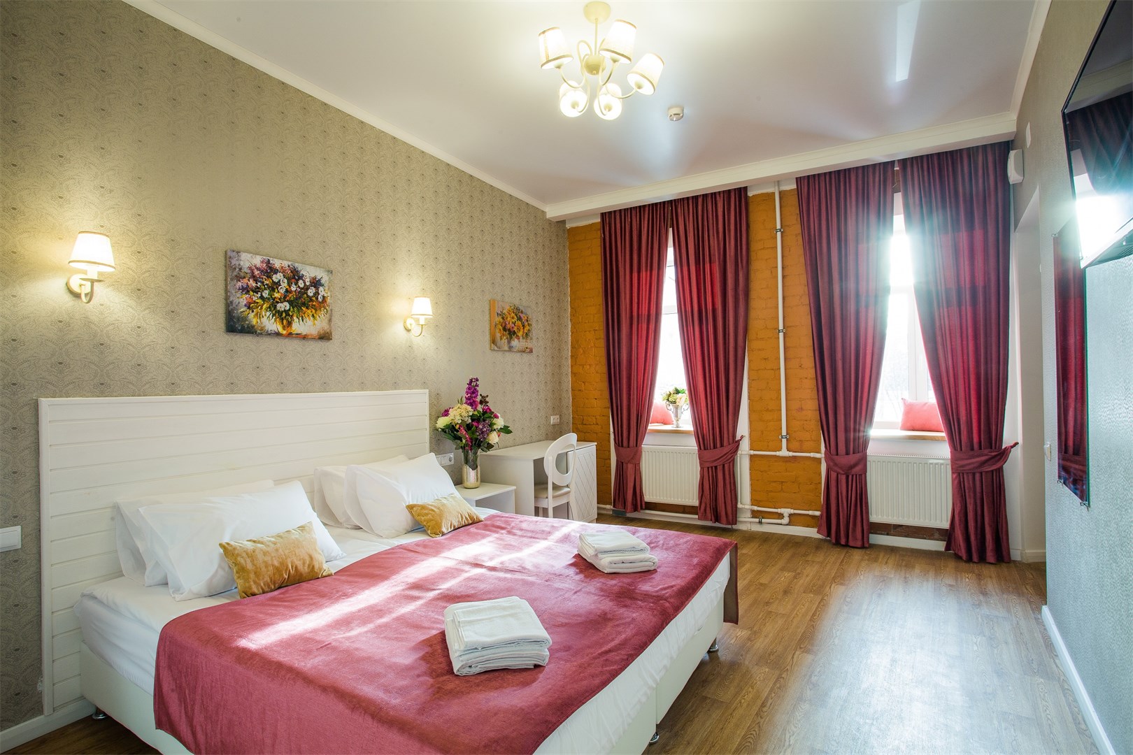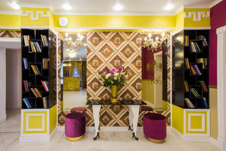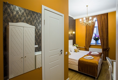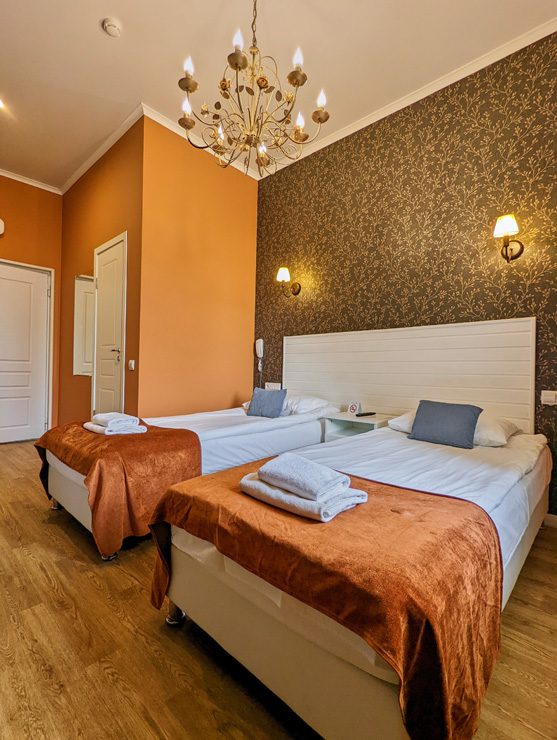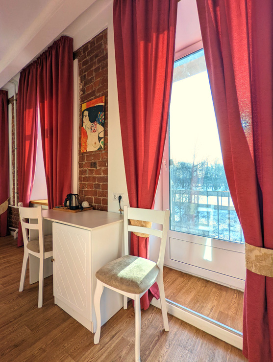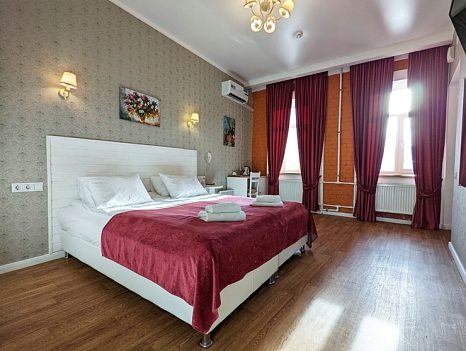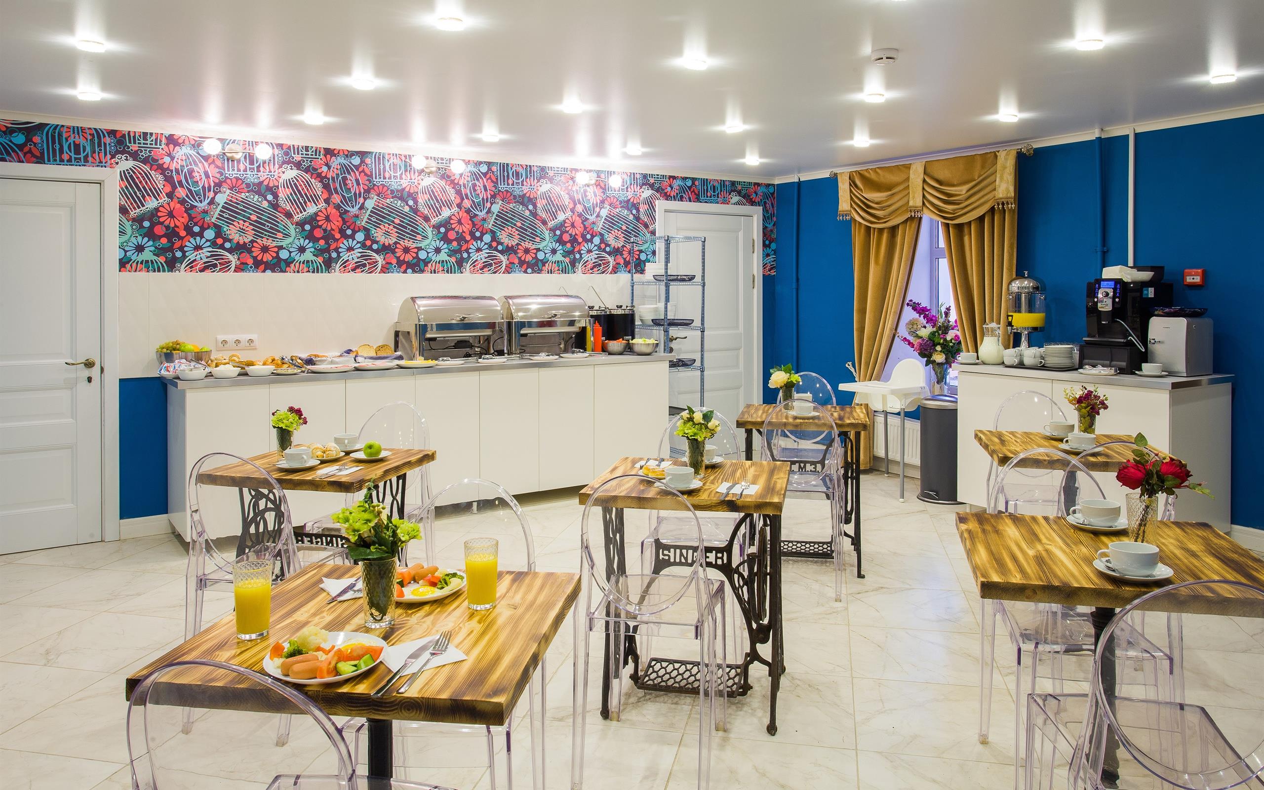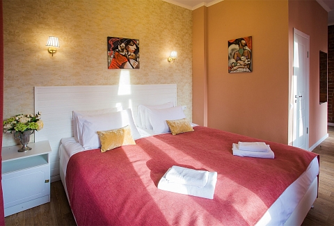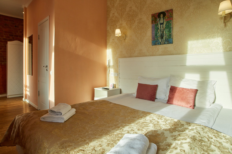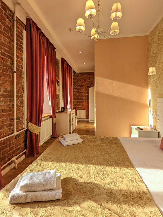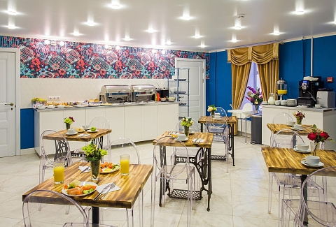 Гостей ожидают комфортабельные двухместные номера, интерьеры которых выдержаны в ярком стиле арт-деко. Все номера оснащены санузлом с душем и укомплектованы мини-холодильником и плазменным телевизором. В свободном доступе для гостей гладильная доска и утюг, так же за дополнительную оплату доступна стирка и сушка белья.В отеле работает кафе, где по утрам гостям накрывают завтраки. Также всем отдыхающим доступен беспроводной интернет и круглосуточная стойка регистрации, где можно заказать такси или приобрести экскурсии по интересным местам Петербурга.