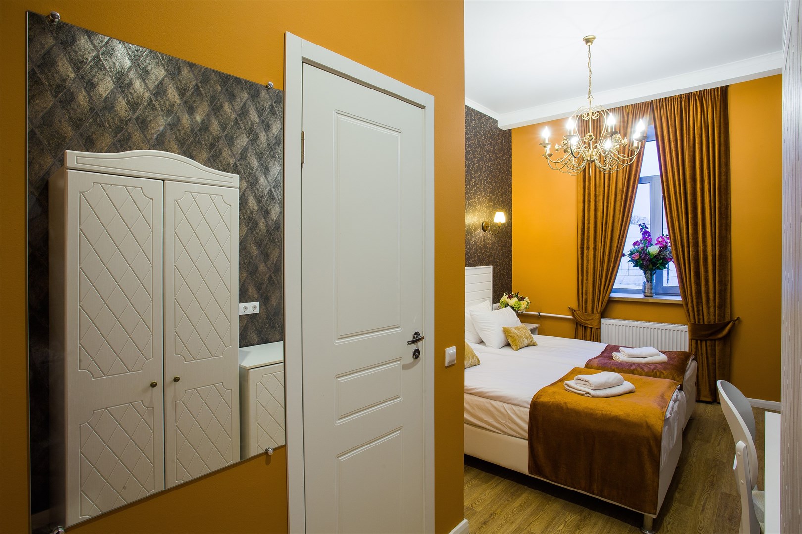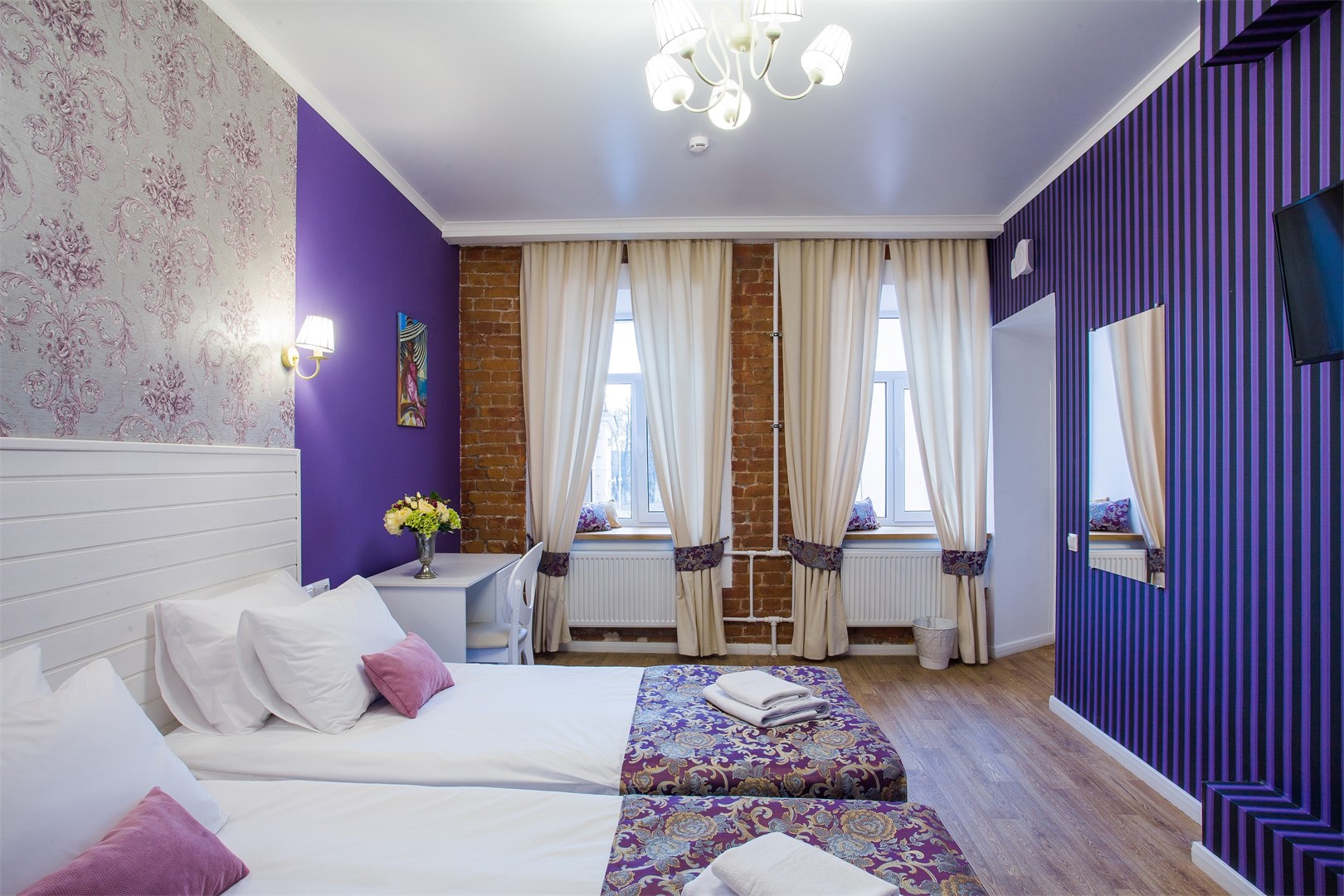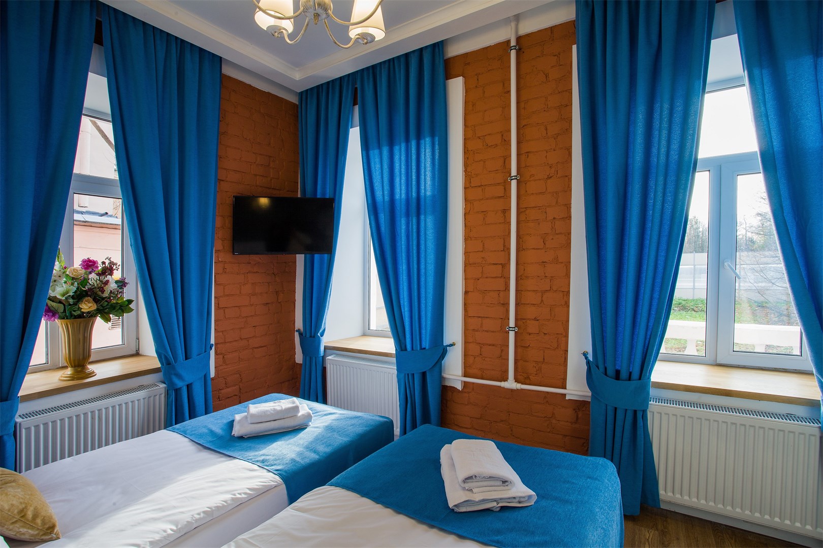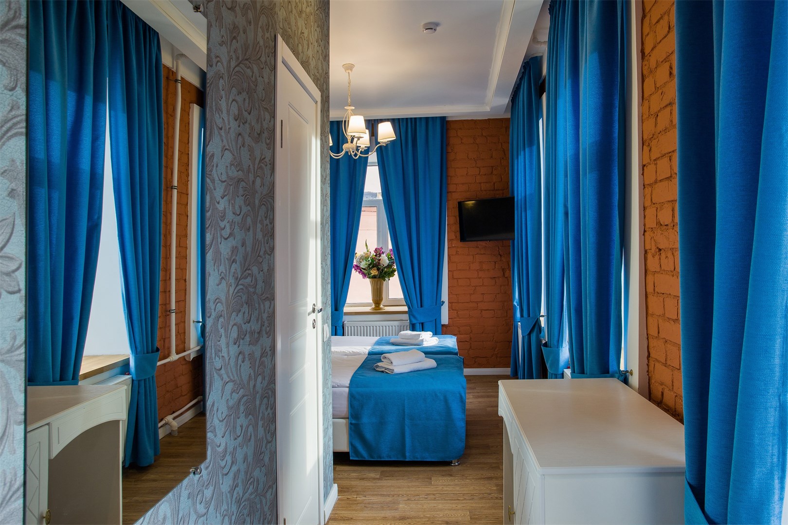 В номере: вешалка, зеркало, кровати односпальные /одна двуспальная кровать, прикроватные тумбочки, стол, стул, тумба, шкаф, мини-холодильник, телевизор, телефон, электрочайник