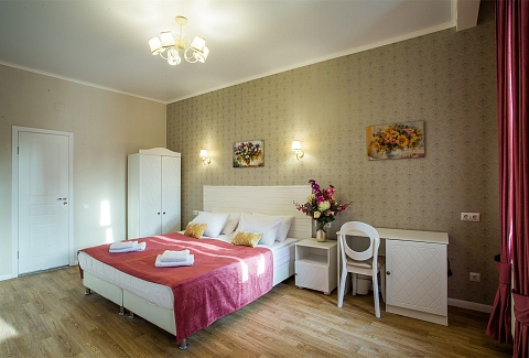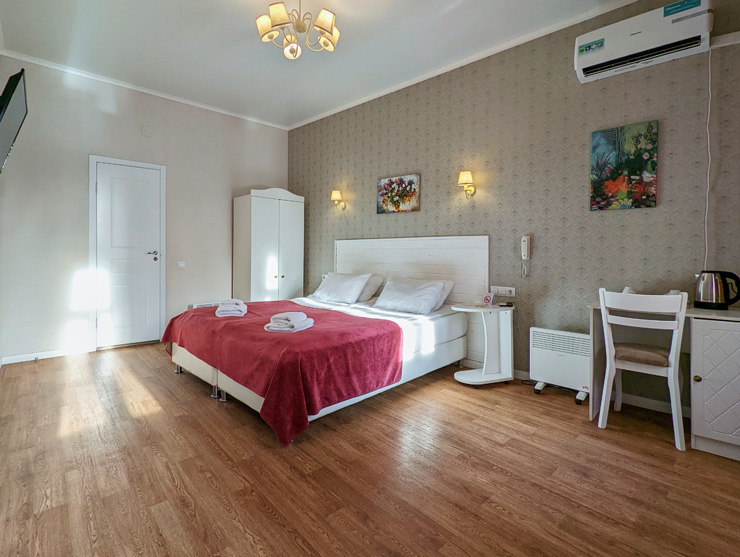 В номере: вешалка, зеркало, кресло, кровати односпальные /одна двуспальная кровать, прикроватные тумбочки, стол, столик журнальный, стул, шкаф, кондиционер, мини-холодильник, телевизор, телефон, чайная станция