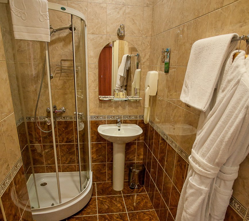 Санузел: с душевой кабиной, тапочки, фен, халат