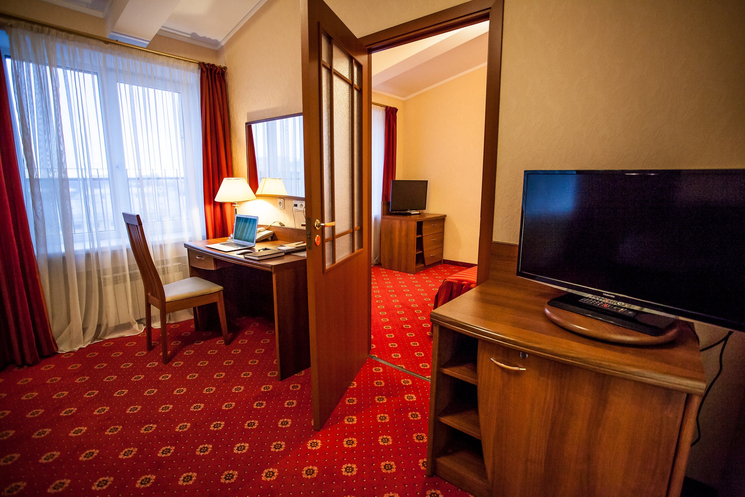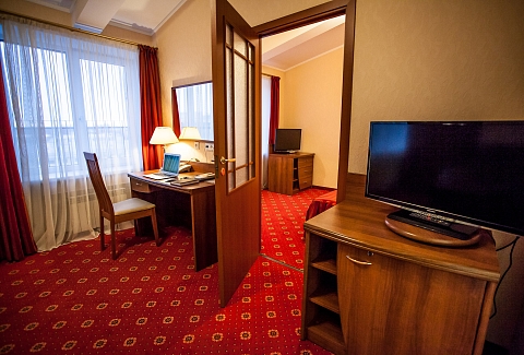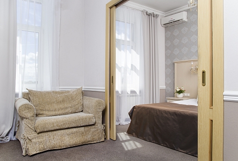 В номере: диван, кровати односпальные /одна двуспальная кровать, прикроватные тумбочки, стол, стул, шкаф, кондиционер, сейф, телевизор, телефон