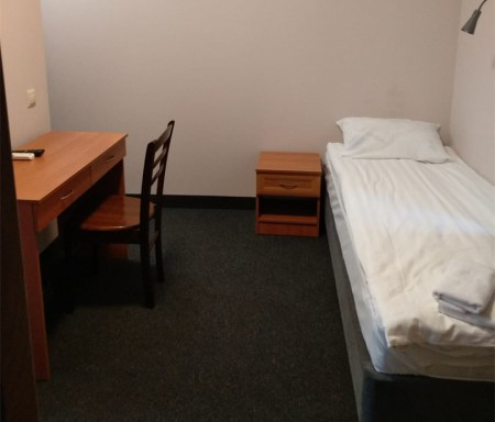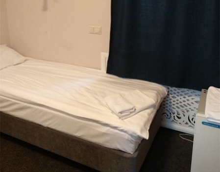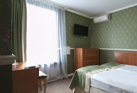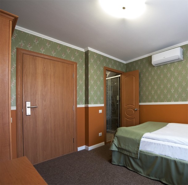В номере: вешалка, зеркало, кровать односпальная, прикроватные тумбочки, стул, шкаф, кондиционер, мини-холодильник, телевизор, утюг