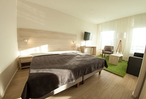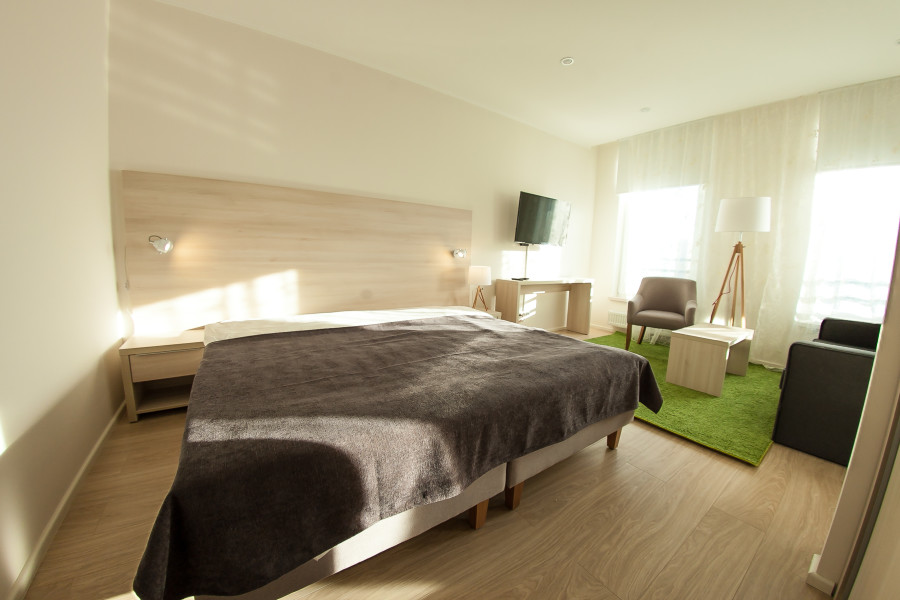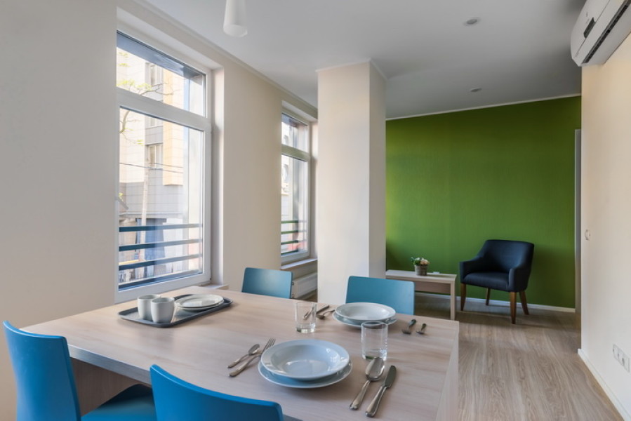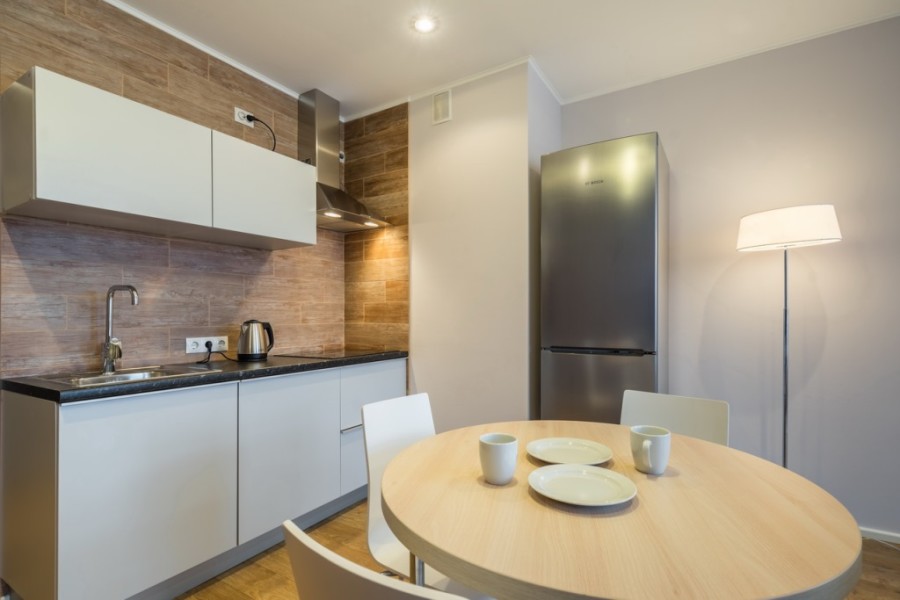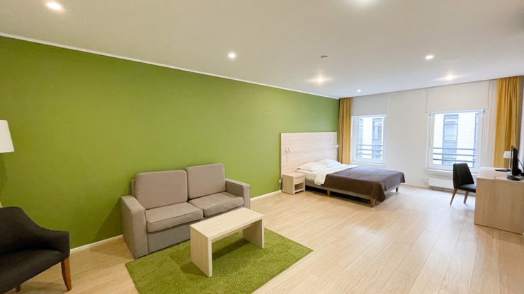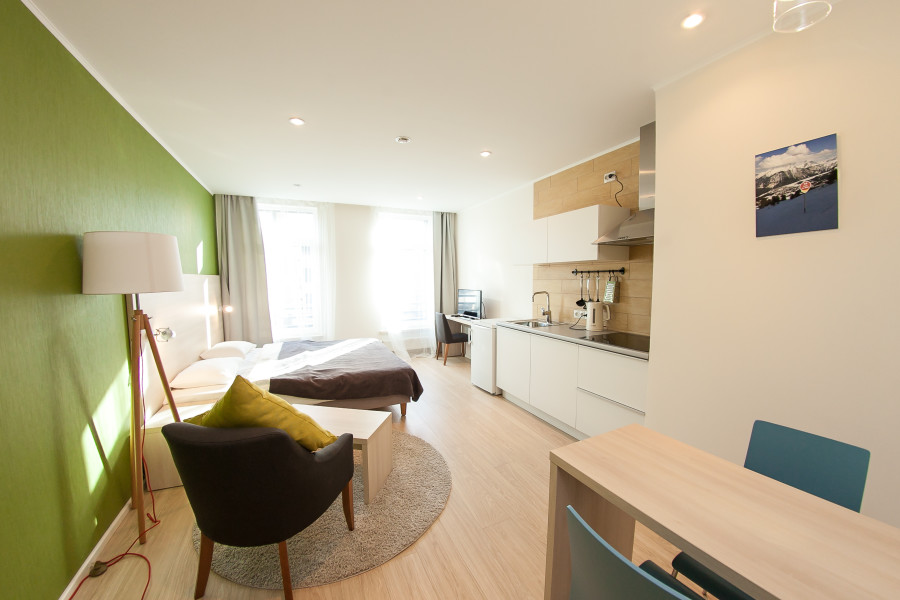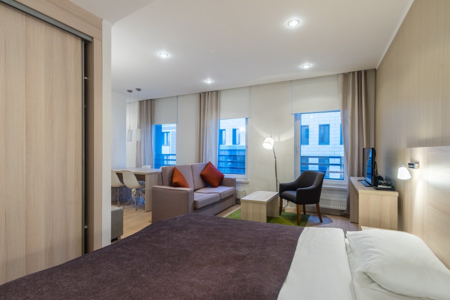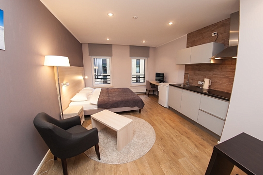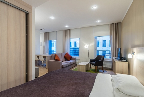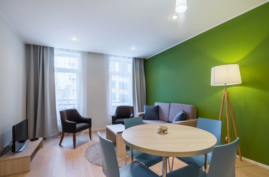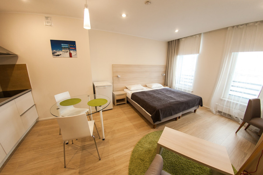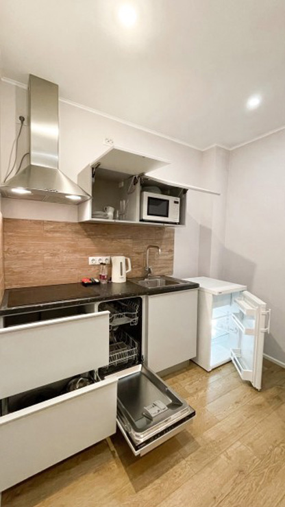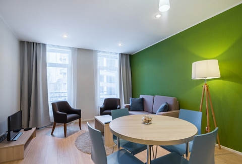 В номере: диван раскладной, зеркало, кресло, кровати односпальные, кухонная мебель, прикроватные тумбочки, стол, столик журнальный, стулья, шкаф, кондиционер, микроволновая печь, мини-холодильник, набор посуды, плита электрическая, посудомоечная машина, стиральная машина, телевизор, чайная станция, электрочайник