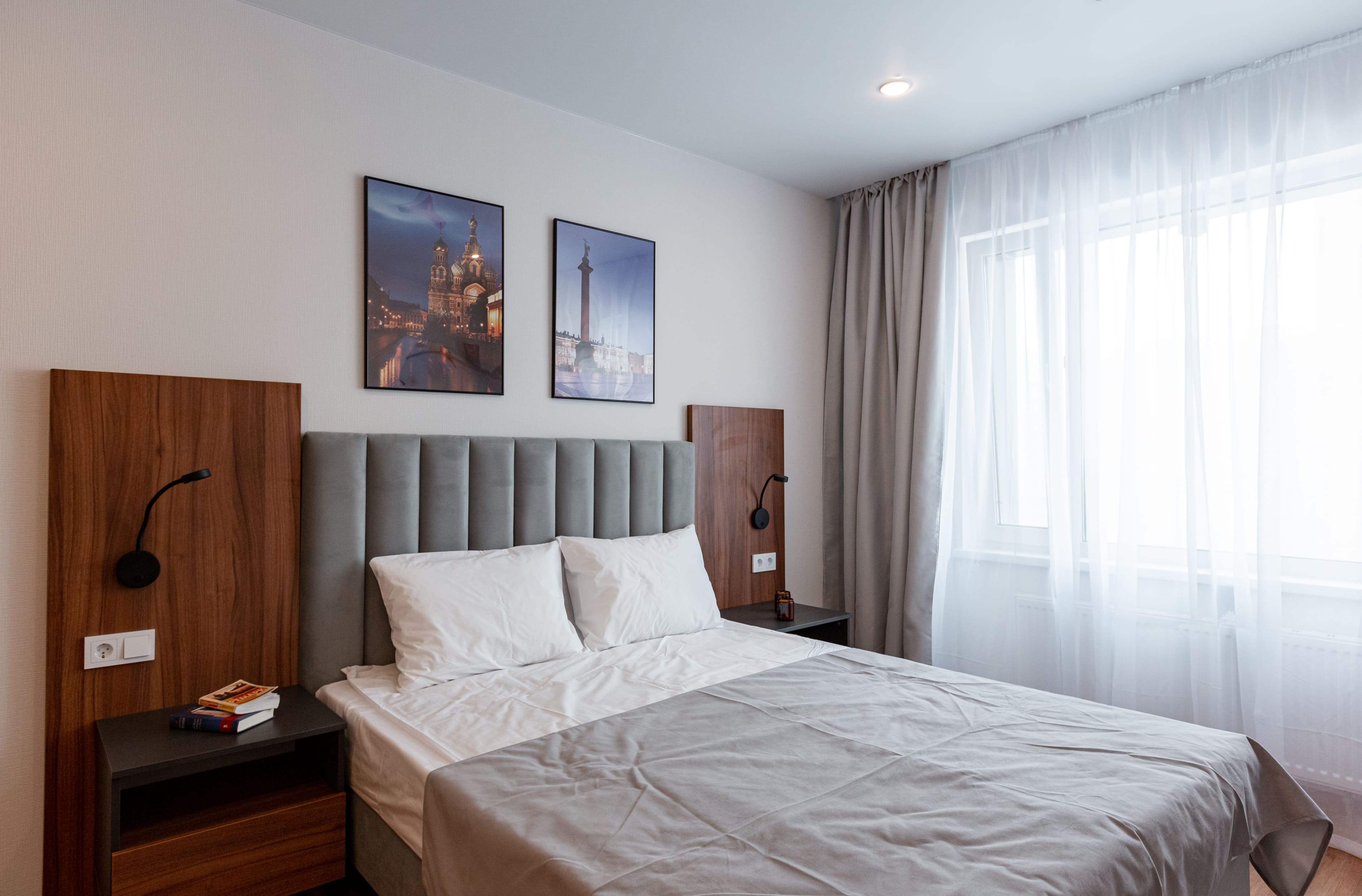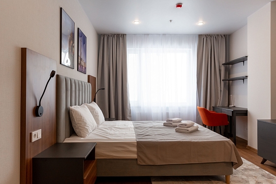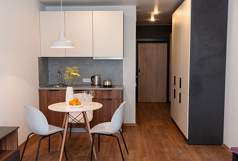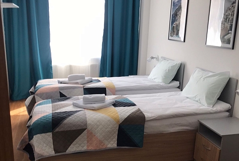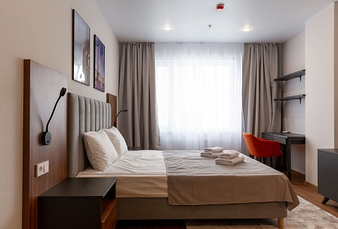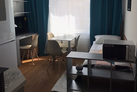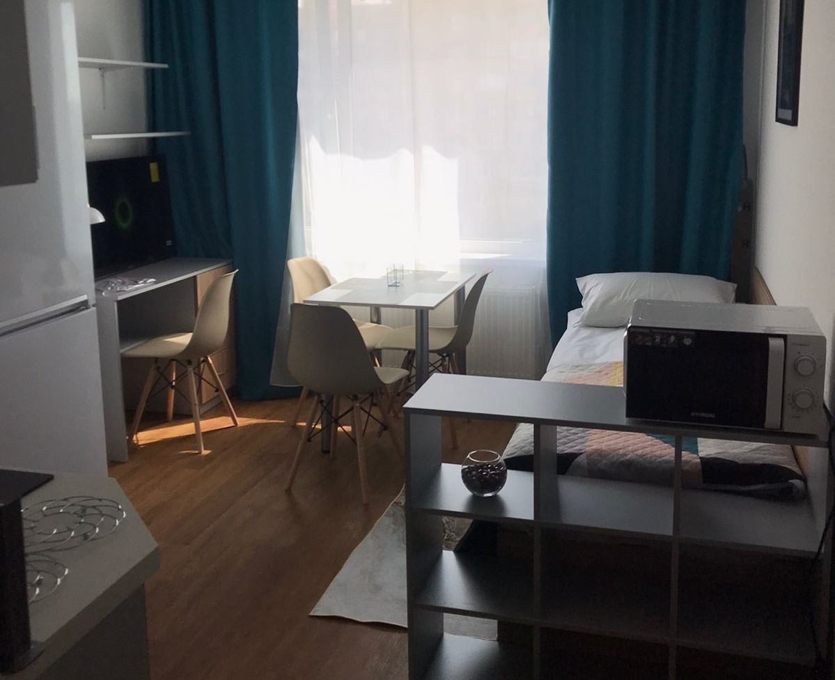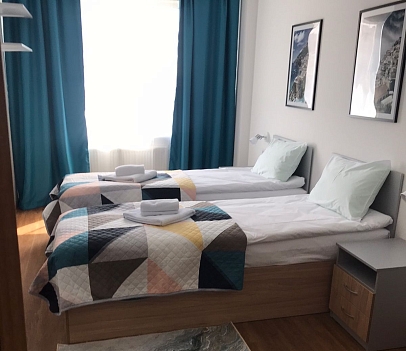 Расстояние до аэропорта составляет 39 километров, до железнодорожного вокзала – 6,5 километров. Апартаменты находятся в 9-этажном здании с лифтом. Комнаты просторные, светлые, оснащены современной комфортабельной мебелью. Для удобства гостей предусмотрены кровати, шкаф, диван, прикроватные тумбочки, телевизор, кондиционер, работает Wi-Fi. Санузел с душевой, отдыхающим предоставляются туалетные принадлежности, тапочки, полотенца. Кухонная зона оборудована холодильником, электрической плитой, микроволновой печью, посудомоечной машиной, чайником, набором посуды и столовых приборов. Личный транспорт можно оставить на парковке возле дома.