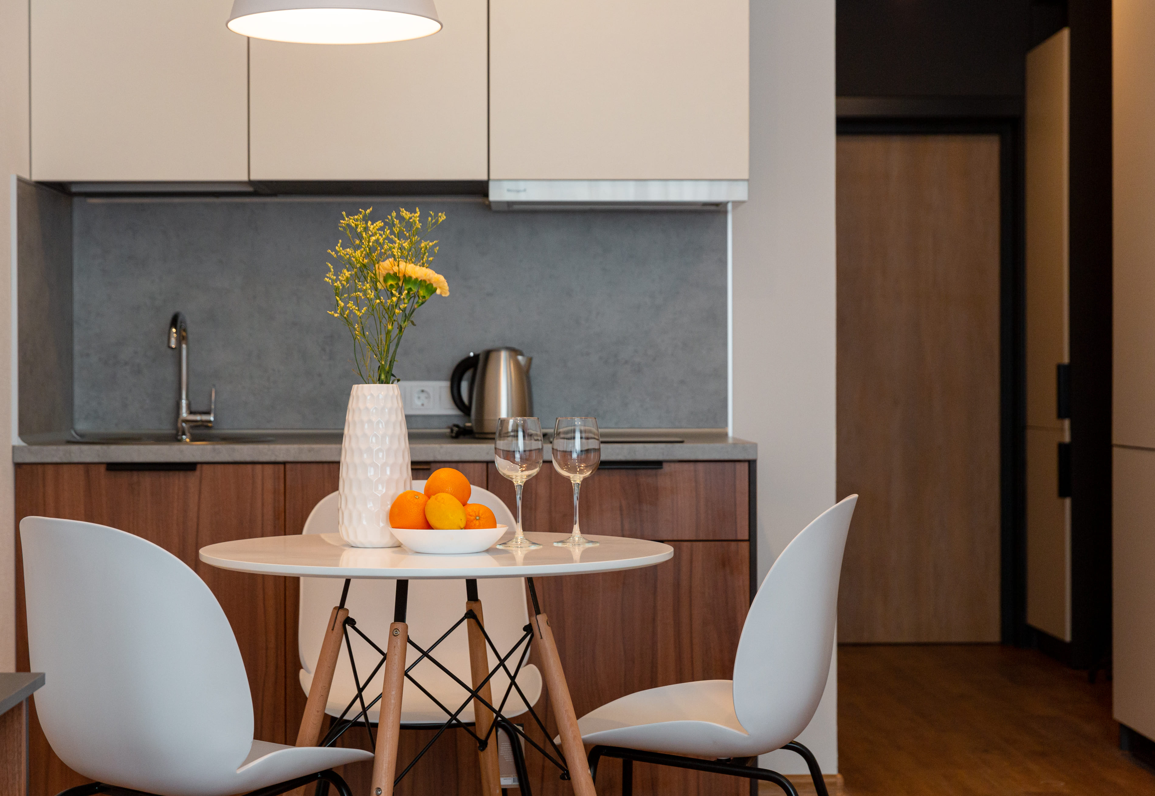 В номере: кровати односпальные /одна двуспальная кровать, прикроватные тумбочки, стол, стулья, шкаф, микроволновая печь, плита электрическая, посудомоечная машина, сейф, телевизор, холодильник, электрочайник