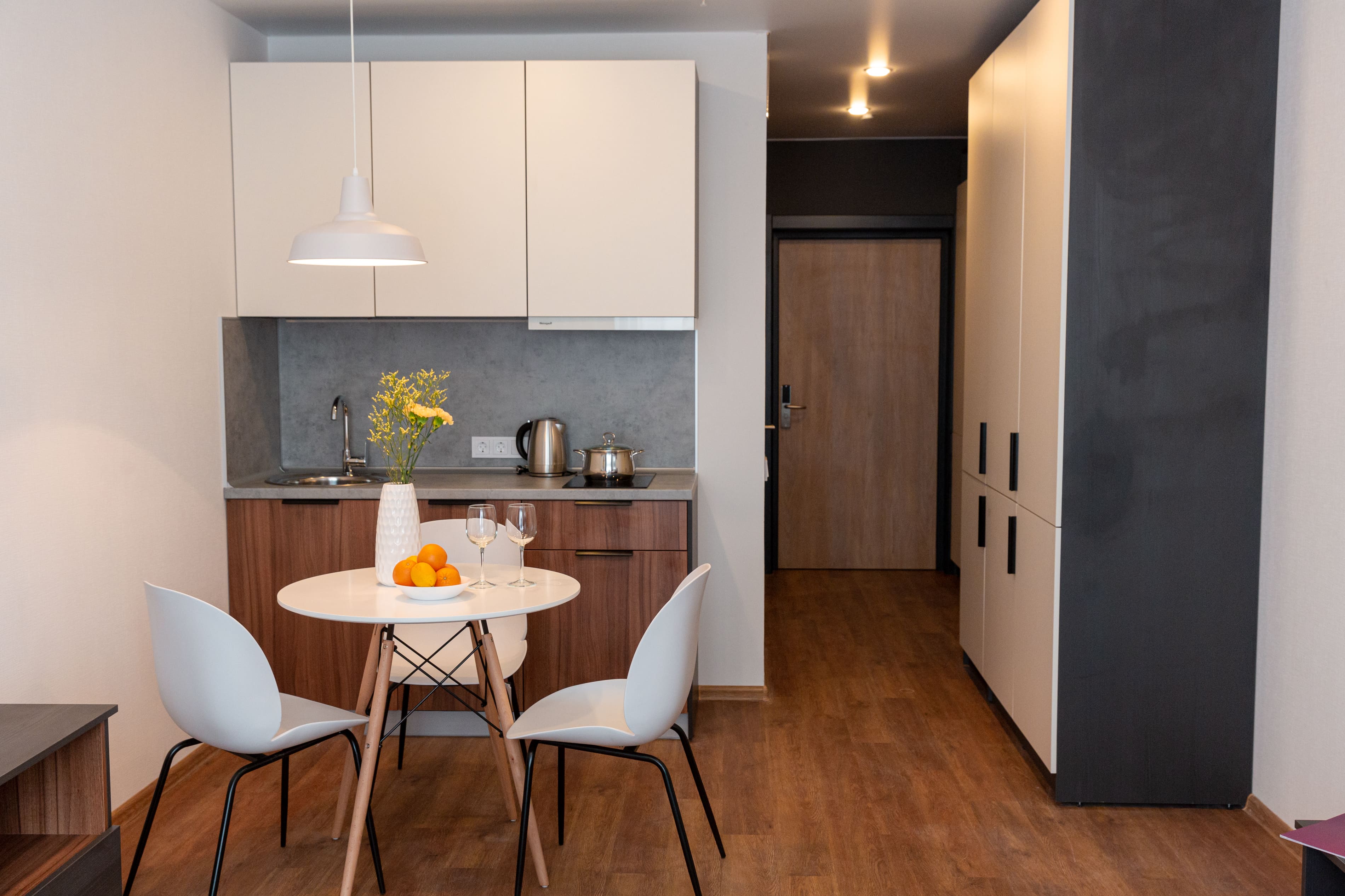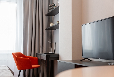 В номере: кровати односпальные /одна двуспальная кровать, кровать односпальная, прикроватные тумбочки, стол, стулья, шкаф, микроволновая печь, плита электрическая, сейф, телевизор, холодильник, электрочайник