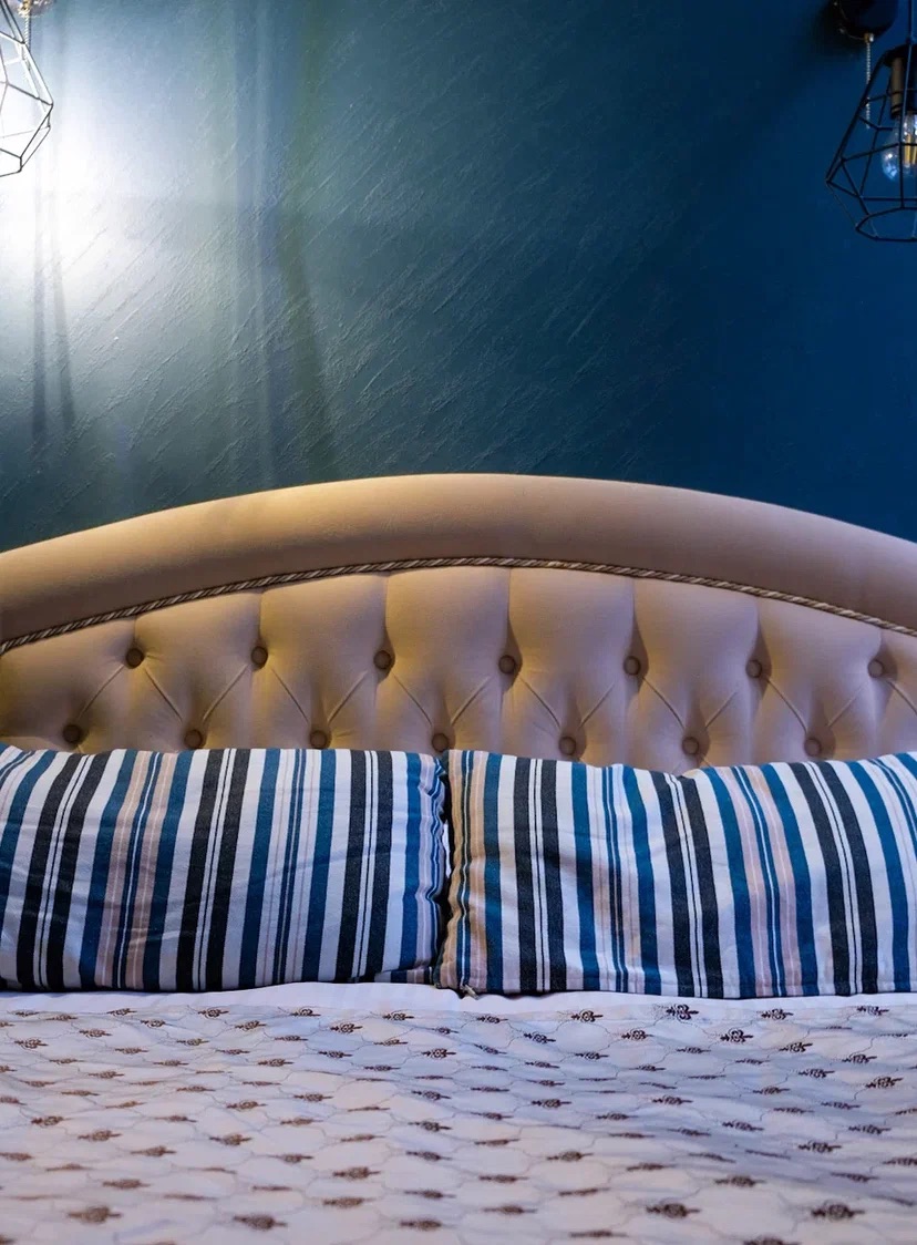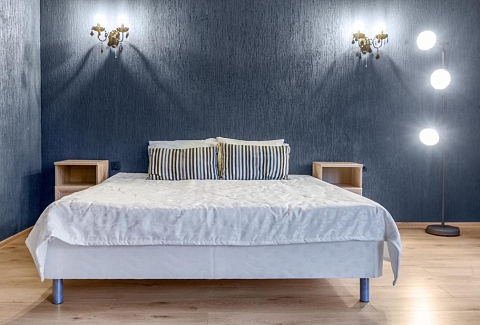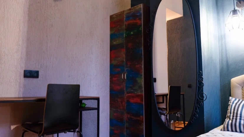 В номере: вешалка, диван, зеркало, кровать двуспальная, прикроватные тумбочки, стол, стулья, шкаф, мини-холодильник, телевизор