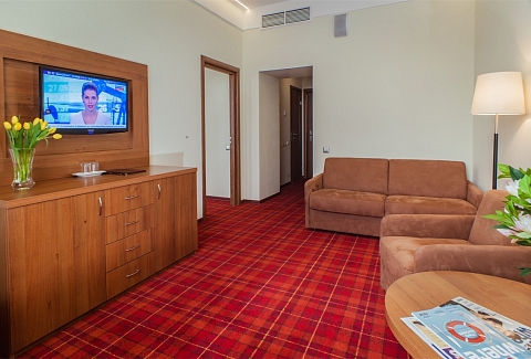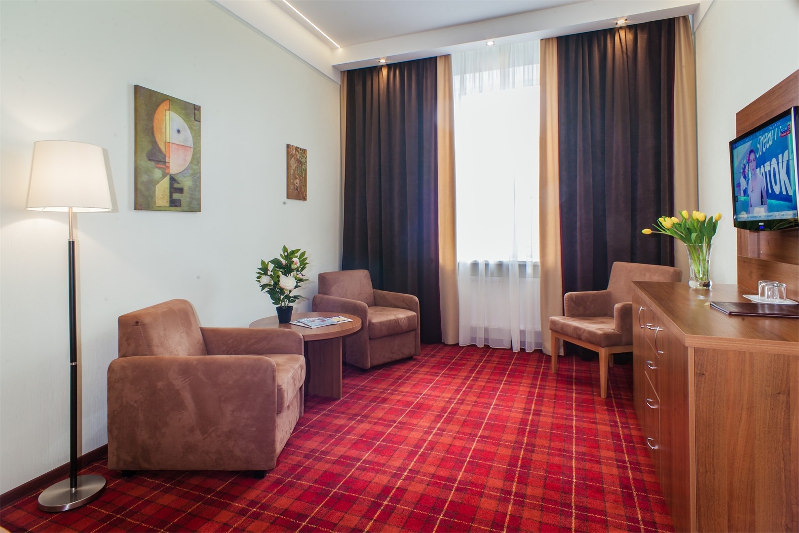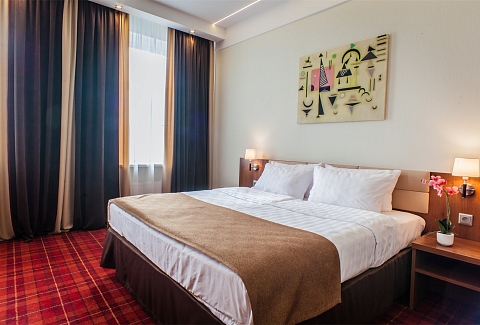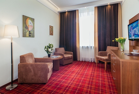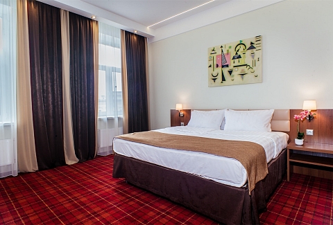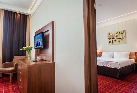 В номере: диван, зеркало, кресла, кровать двуспальная, стол, стулья, шкаф, кондиционер, кофемашина, сейф, телевизор, телефон, электрочайник