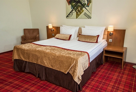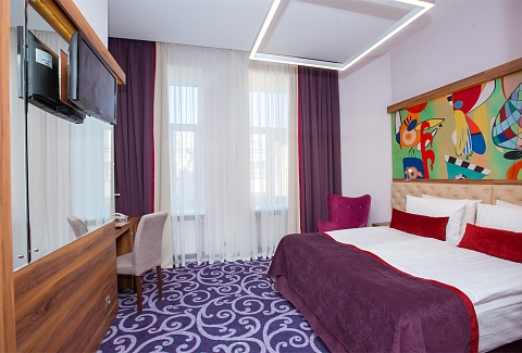 В номере: кресло, кровать двуспальная, прикроватные тумбочки, стол, стул, шкаф, кондиционер, сейф, телевизор, телефон, чайный набор посуды, электрочайник