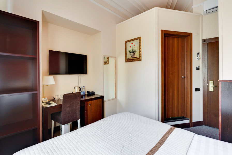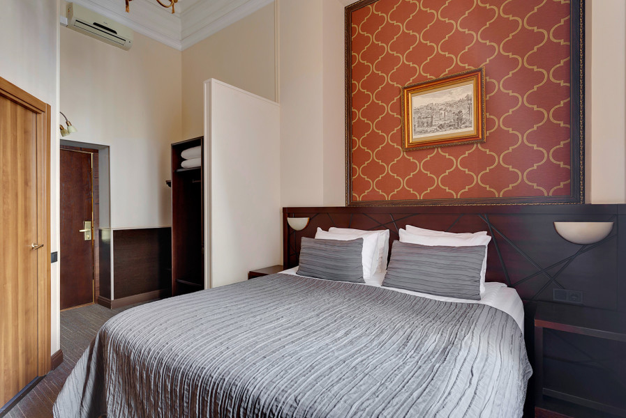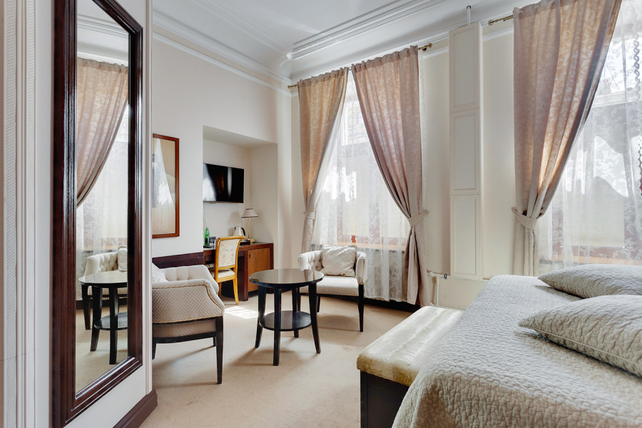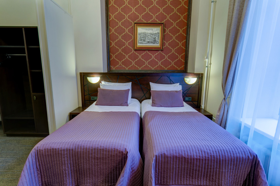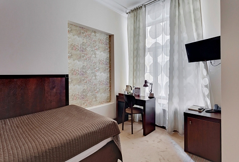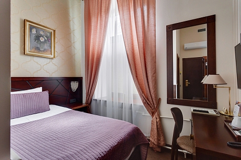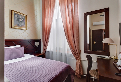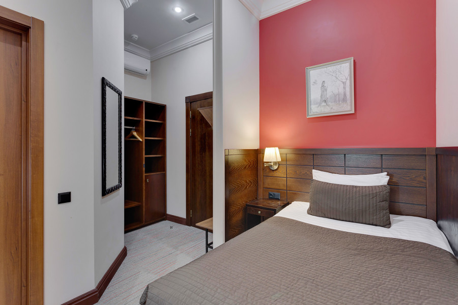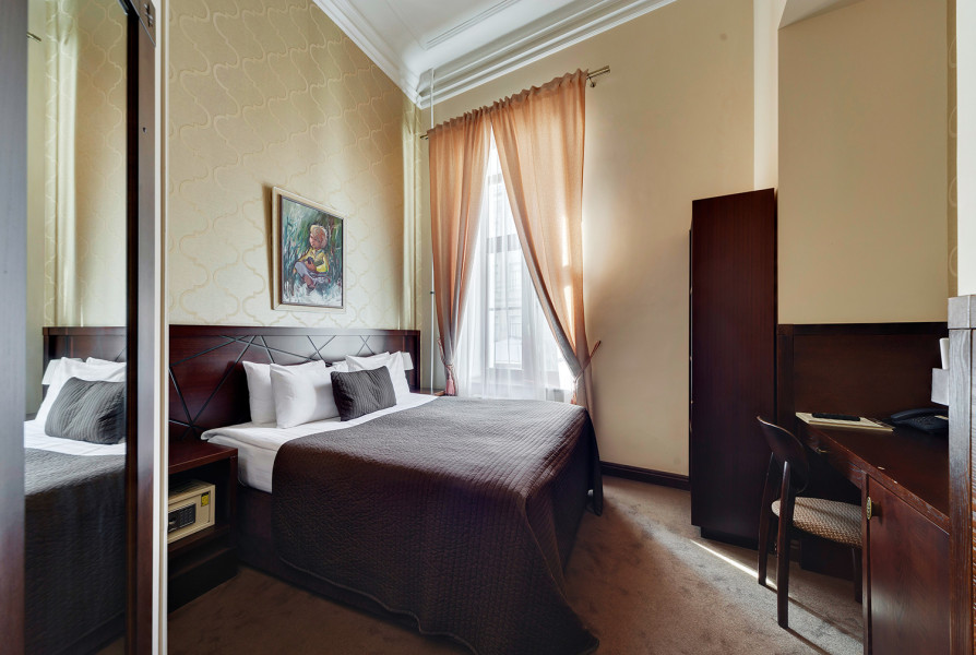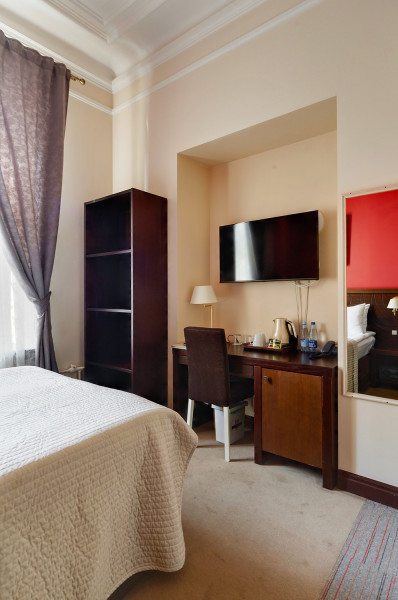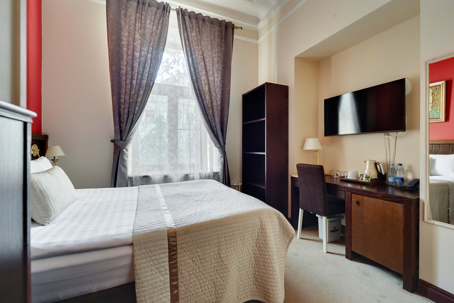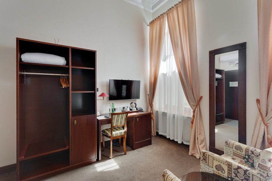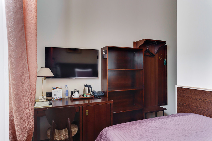 В номере: вешалка, зеркало, кровать односпальная, стол, шкаф, гладильная доска, кондиционер, мини-холодильник, сейф, телевизор, телефон, утюг, чайный набор посуды, электрочайник