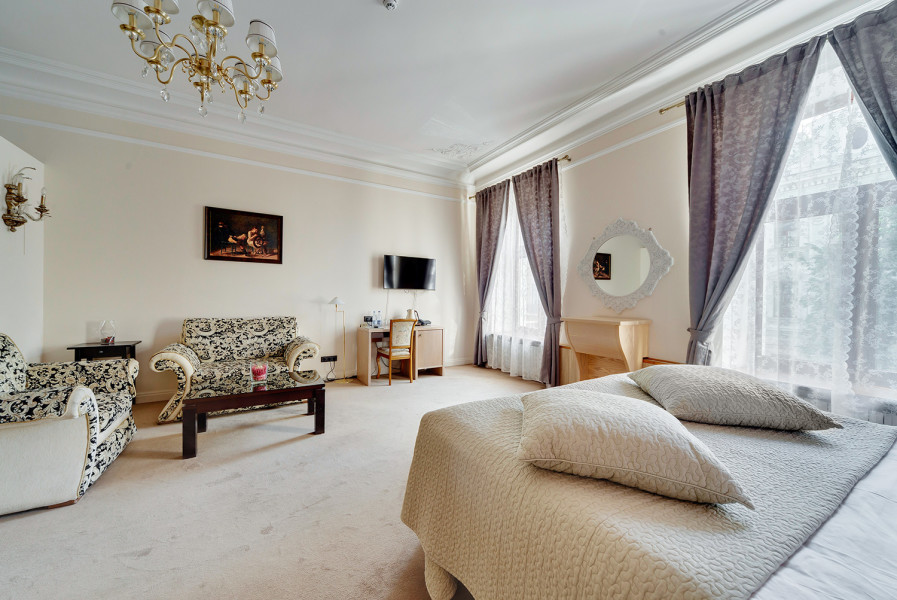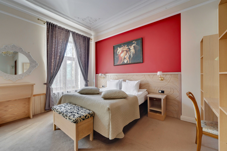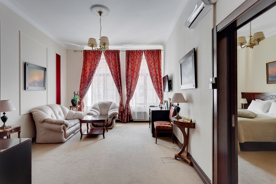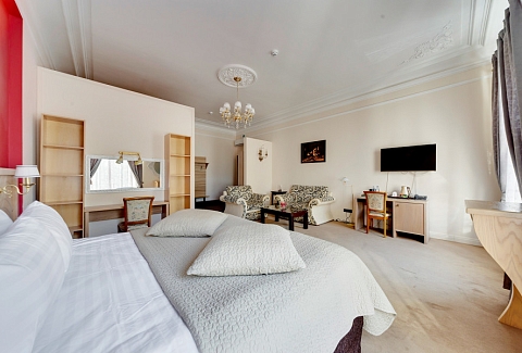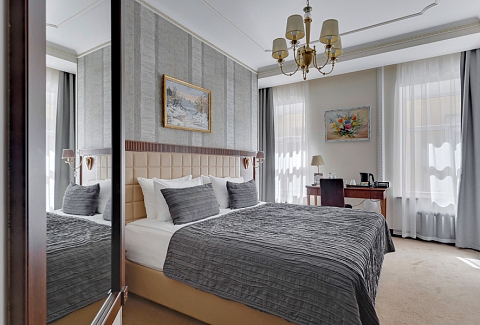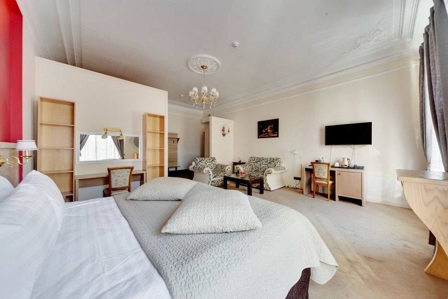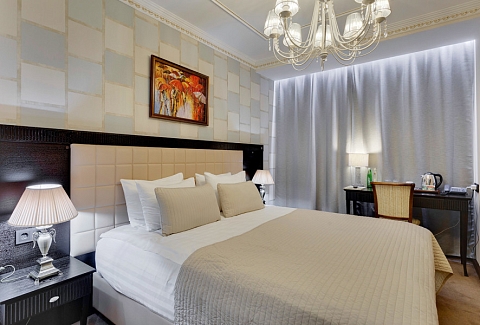 В номере: вешалка, зеркало, кресла, кровать двуспальная, прикроватные тумбочки, стол, стул, шкаф, гладильная доска, кондиционер, мини-холодильник, сейф, телевизор, телефон, утюг, чайный набор посуды, электрочайник