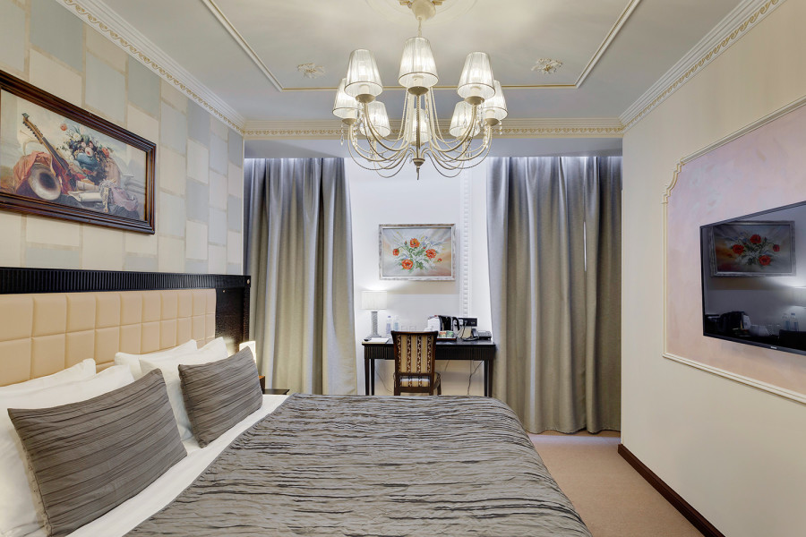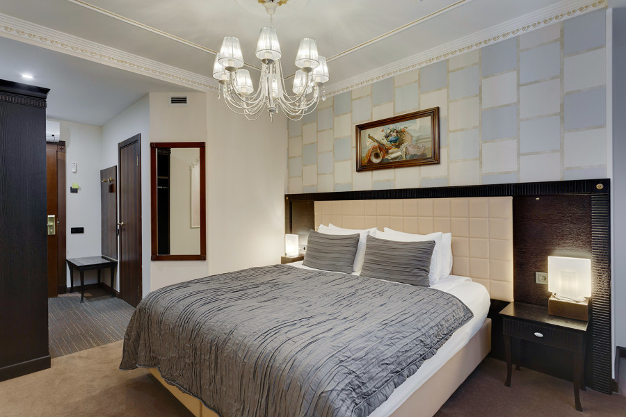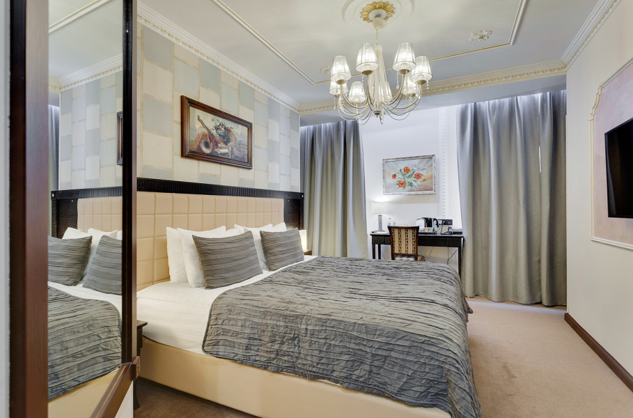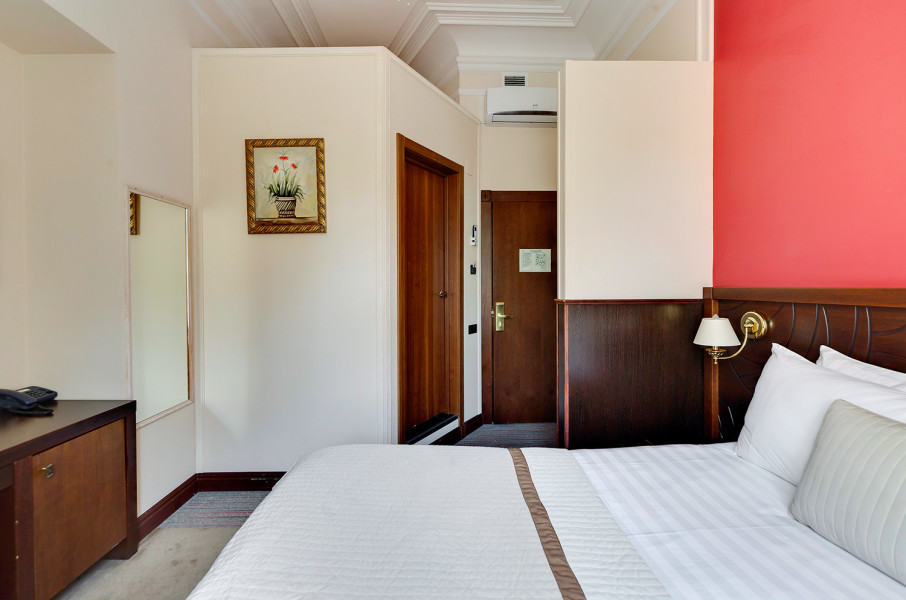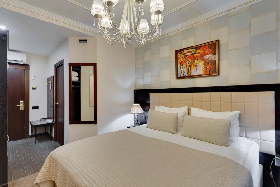 В номере: вешалка, зеркало, кровать двуспальная, прикроватные тумбочки, стол, стул, шкаф, гладильная доска, кондиционер, мини-холодильник, сейф, телевизор, телефон, утюг, чайный набор посуды, электрочайник