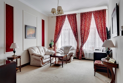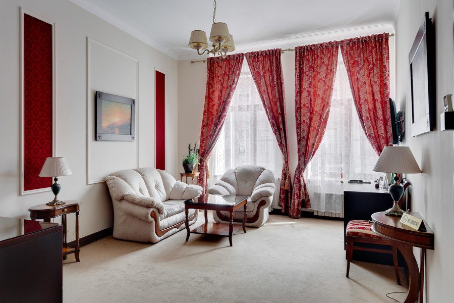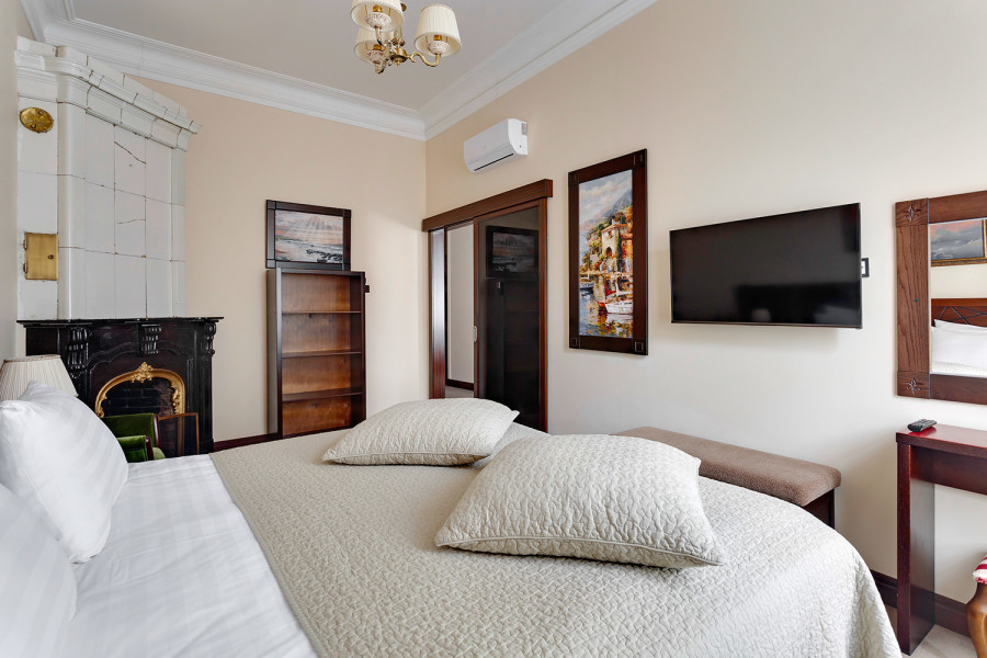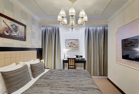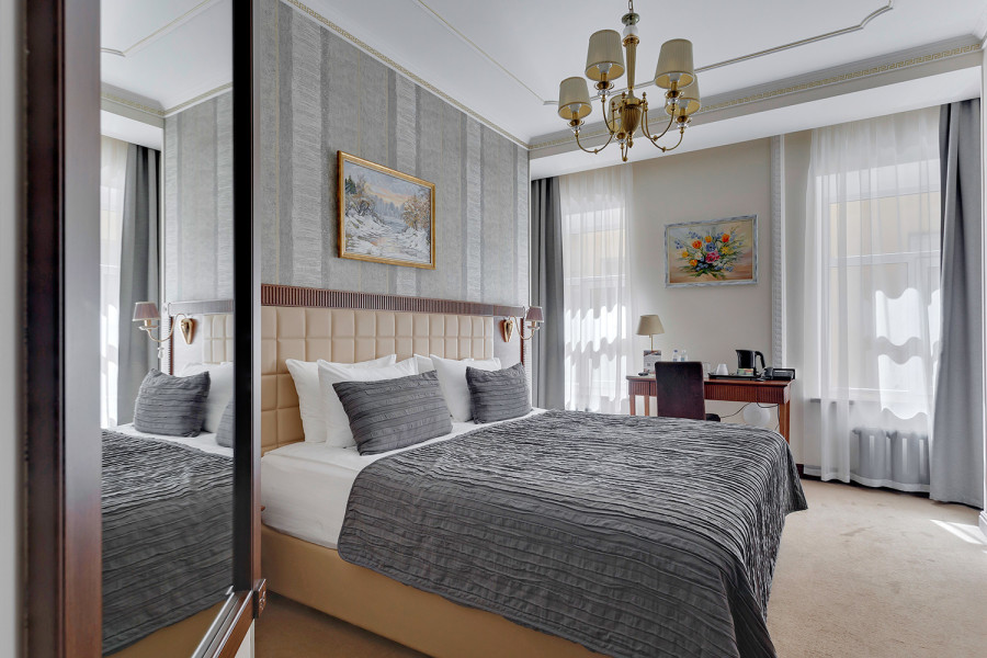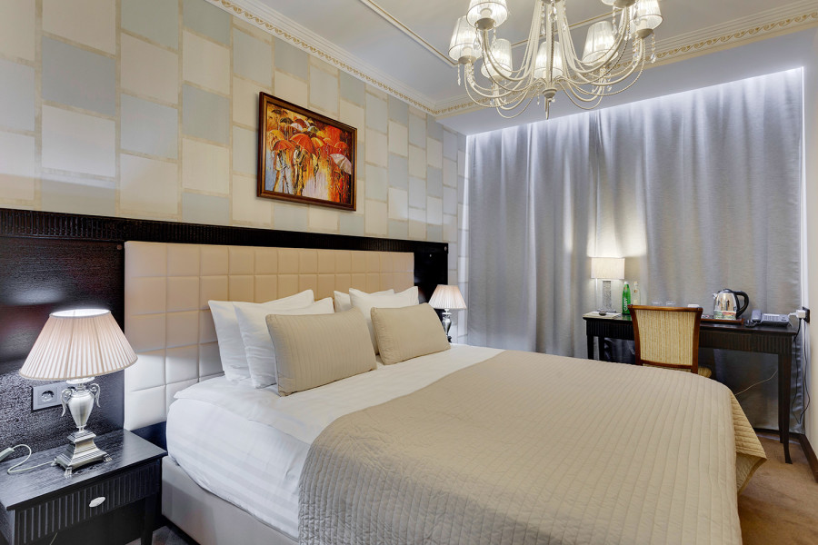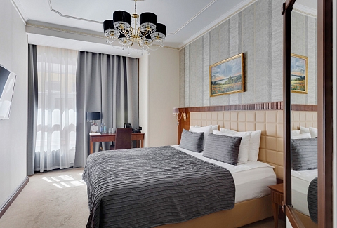 В номере: вешалка, зеркало, кресла, кровать двуспальная, прикроватные тумбочки, стол, шкаф, гладильная доска, кондиционер, мини-холодильник, сейф, телевизор, телефон, утюг, чайный набор посуды, электрочайник