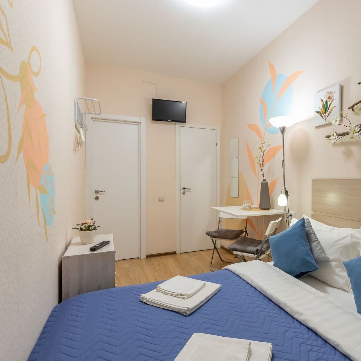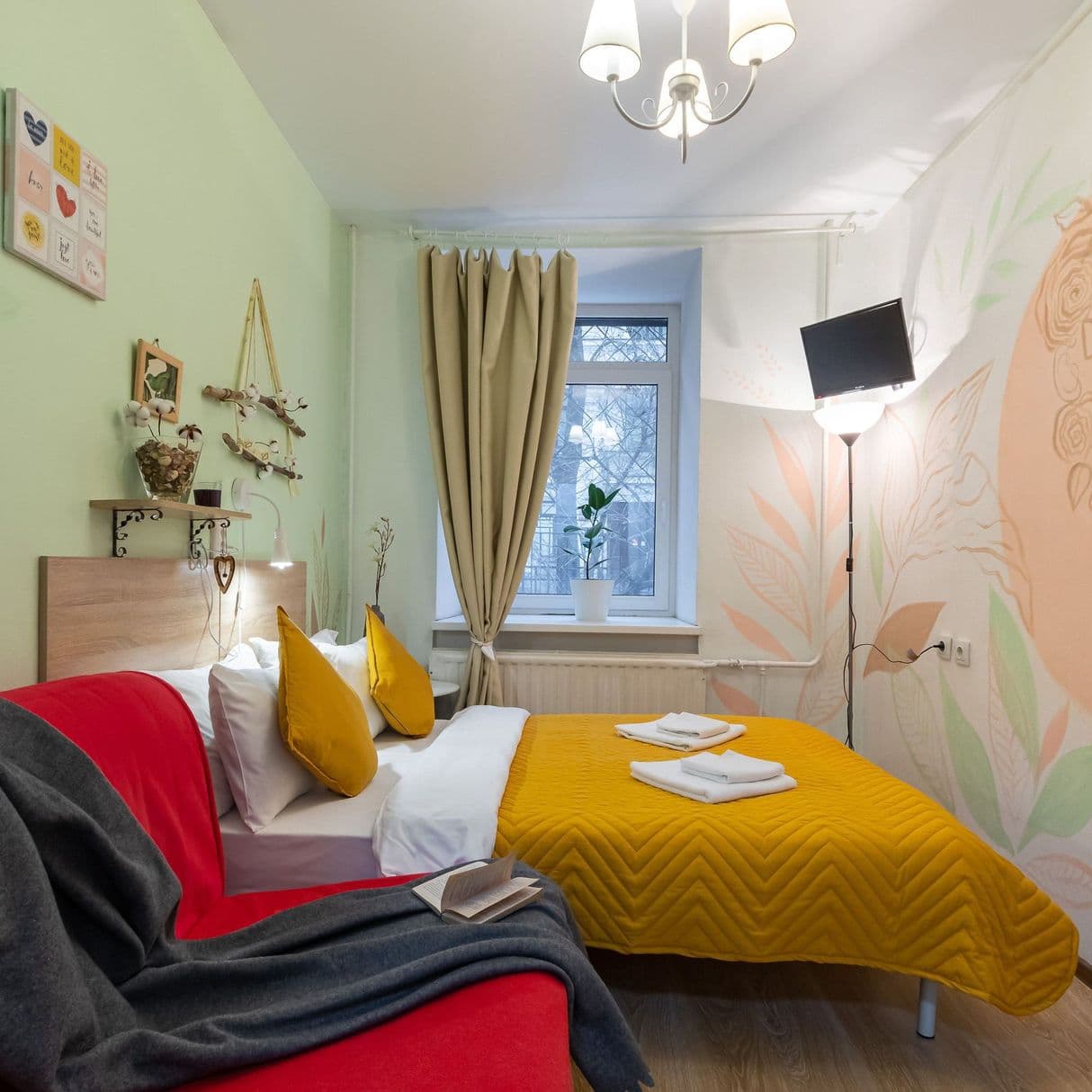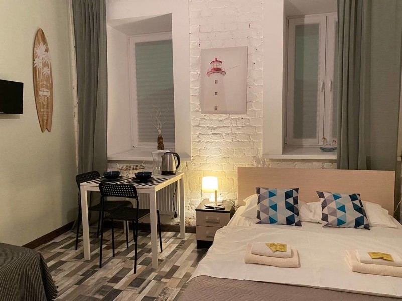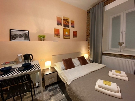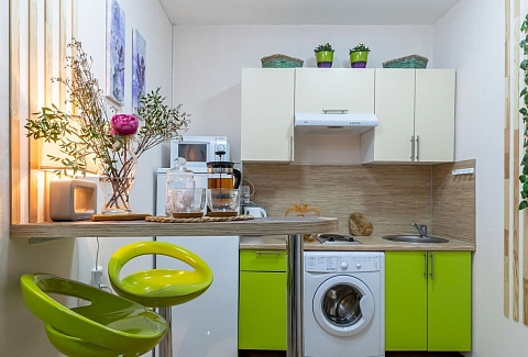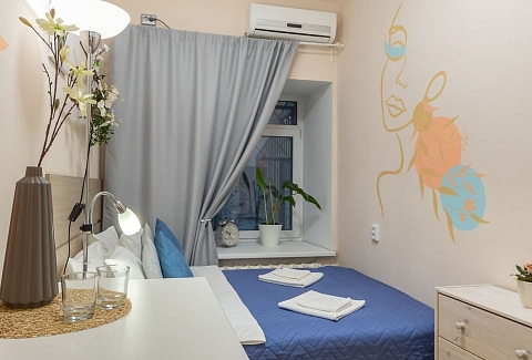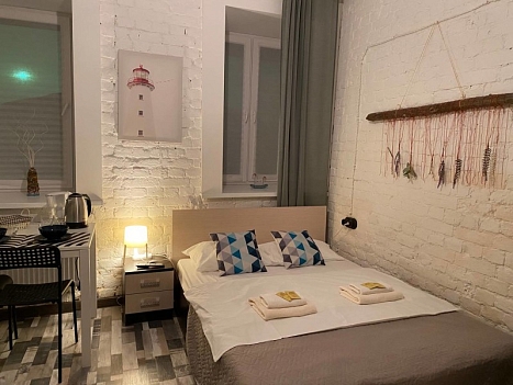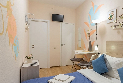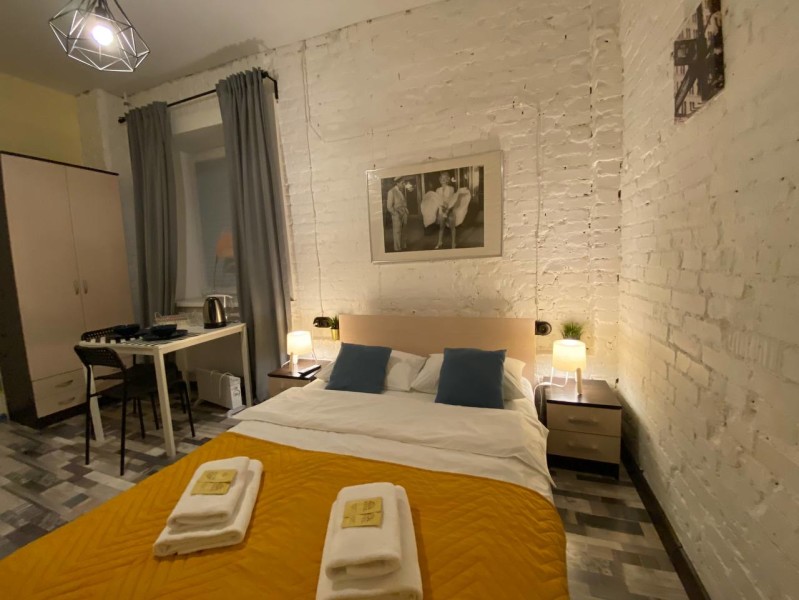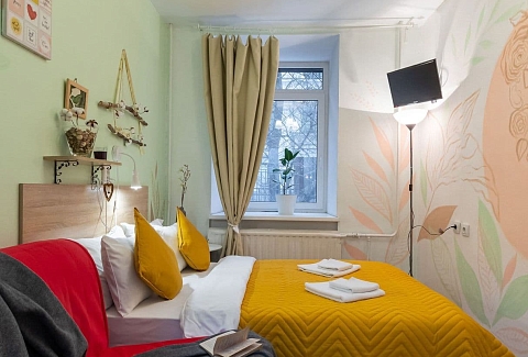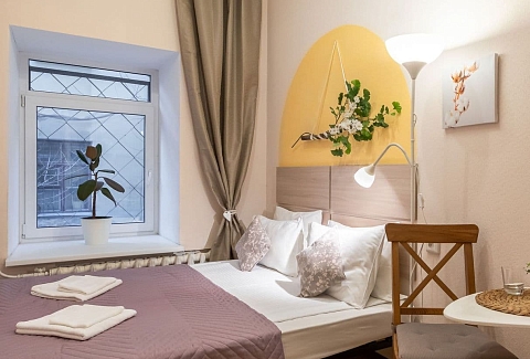 Отель, жилой фонд которого состоит всего лишь из 4 номеров, разместился в пятиэтажном здании в типичном питерском дворике. Двухместные номера оснащены санузлом с душем, в комнатах есть ЖК-телевизор, кондиционер, беспроводной интернет и набор чайной посуда. Для удобства отдыхающих в отеле предусмотрена стильная яркая кухня, оснащенная всей необходимой бытовой техникой, в том числе есть стиральная машина, которой гости могут воспользоваться самостоятельно.