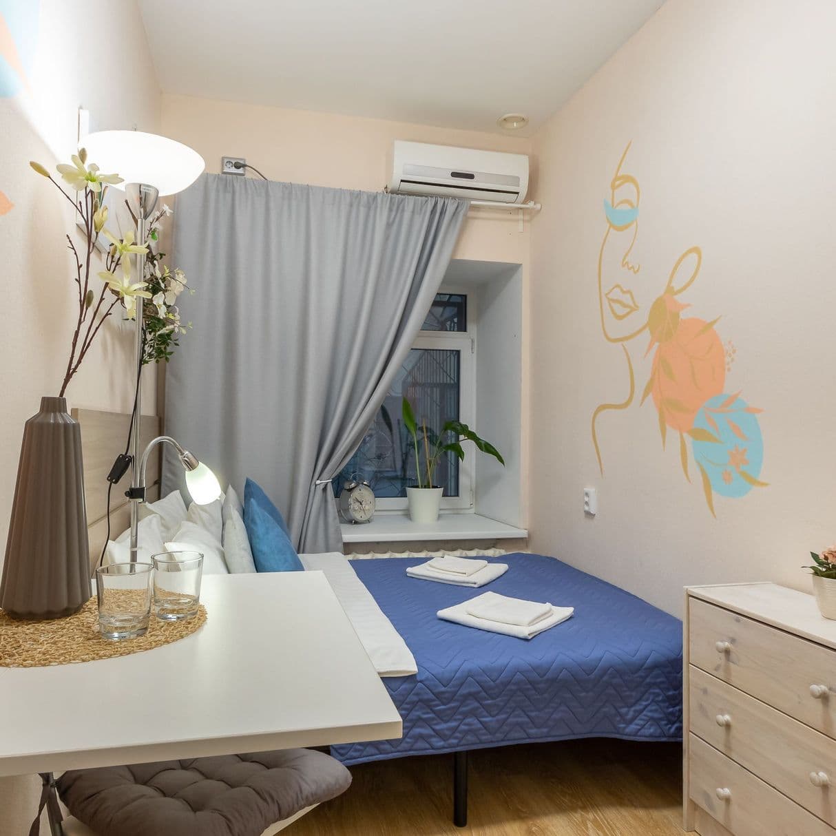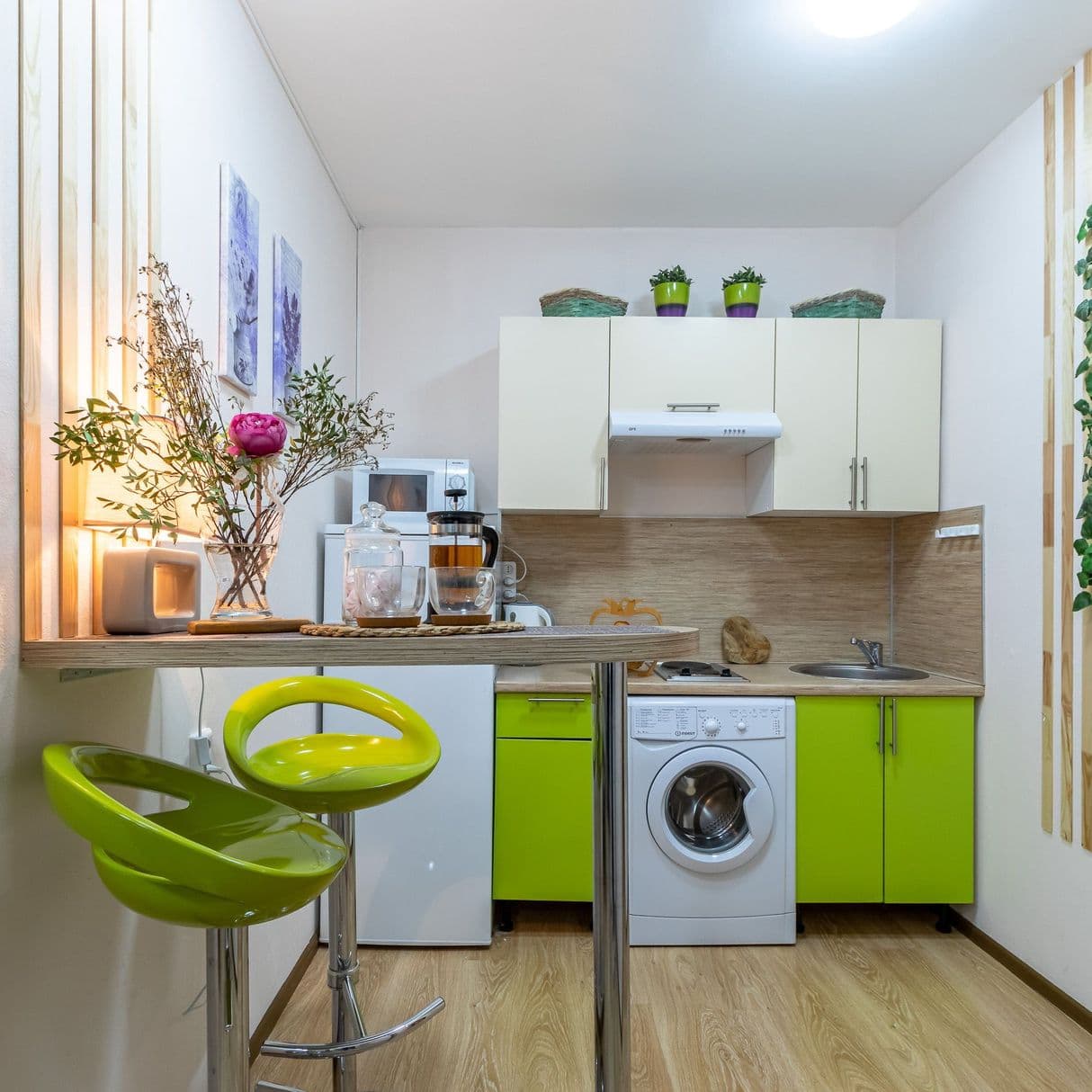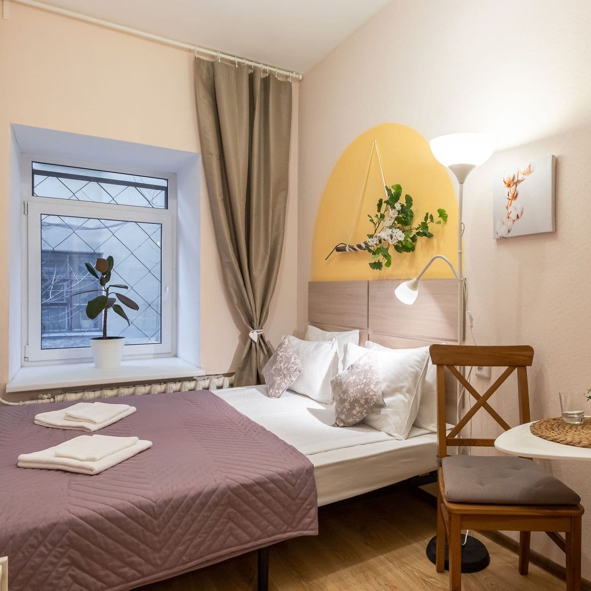 Отель, жилой фонд которого состоит всего лишь из 4 номеров, разместился в пятиэтажном здании в типичном питерском дворике. Двухместные номера оснащены санузлом с душем, в комнатах есть ЖК-телевизор, кондиционер, беспроводной интернет и набор чайной посуда. Для удобства отдыхающих в отеле предусмотрена стильная яркая кухня, оснащенная всей необходимой бытовой техникой, в том числе есть стиральная машина, которой гости могут воспользоваться самостоятельно.